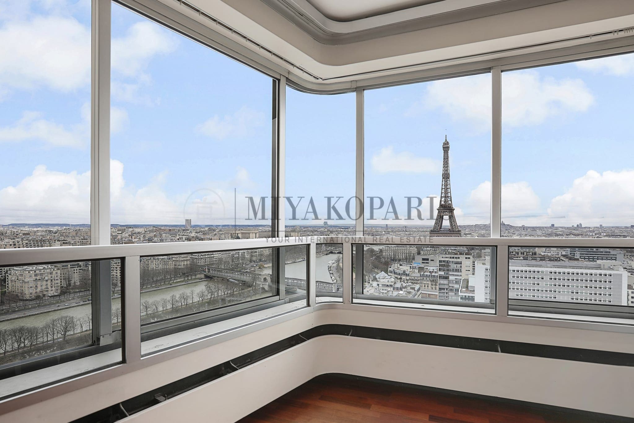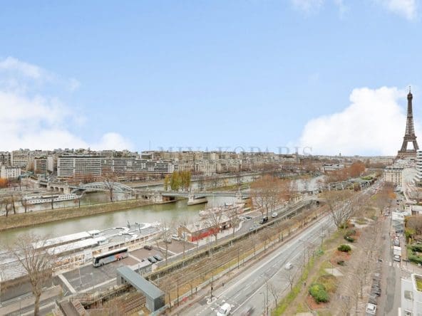 EXCLUSIVITE – Paris XV – Front de Seine. Dans un immeuble de bon standing et haute surveillance, étage très élevé. Appartement d’angle lumineux offrant une vue à 180 degrés sur la Seine / la Tour Eiffel ainsi que de nombreux monuments se compose : entrée, double séjour, cuisine indépendante (Possibilité US), 3 chambres (4 possibles), 1 salle de bains avec WC, 1 salle de douche, WC séparé. Rare.