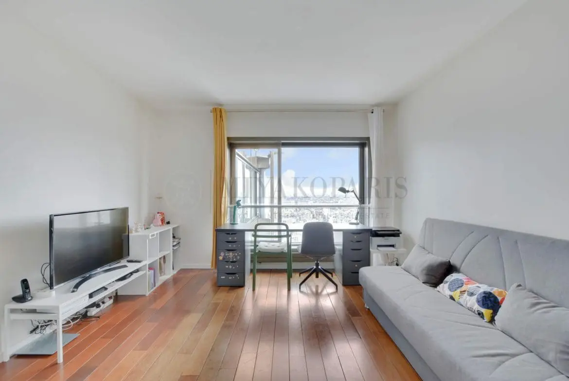 VUE AÉRIENNE l Exclusivité l Tour TOTEM l Paris XVe – Situé dans une résidence prestigieuse du Front de Seine. En dernière étage, ce confortable deux pièces se compose d’une entrée avec placards, salon, cuisine séparée, 1 chambre, salle de bains avec WC.
