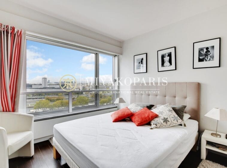 MIYAKOPARIS, L’Agence du Front de Seine ! COUP DE COEUR – Paris XVe – Dans un immeuble de bon standing et haute surveillance. Appartement climatisé d’angle de 93,73m² offrant une vue à 180 degrés sur la Seine, les toits de Paris, le Mont Valérien et La Défense se compose comme suit: entrée, spacieux séjour, cuisine américaine entièrement équipée, 2 chambres bénéficiant d’une salle d’eau et une salle de douche avec WC, WC invités. Belles prestations.