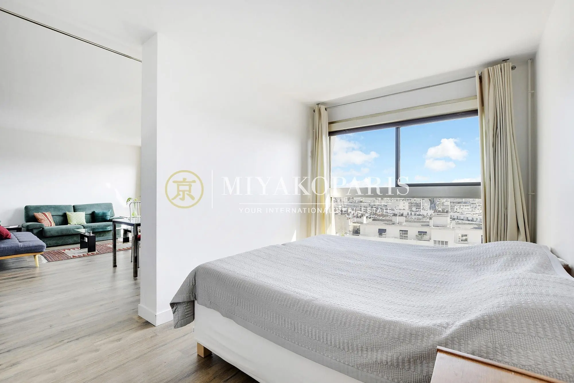 Paris XVe– Front de Seine, l’appartement bénéficiant d’une vue panoramique sur Paris se compose: entrée, salon, cuisine indépendante équipée, 1 chambre exposée Paris, salle de bains, WC séparé.