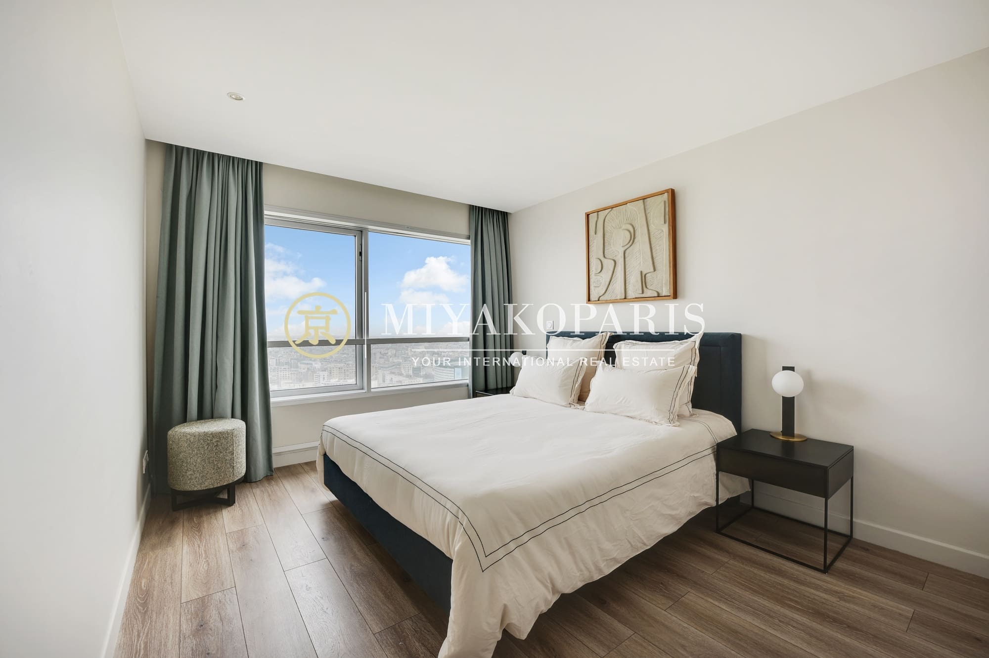 VUE AÉRIENNE l Paris XVe l Venez découvrir cet appartement d’exception baigné de lumière naturelle refait entièrement à neuf offrant une vue aérienne sur la Seine, Paris.