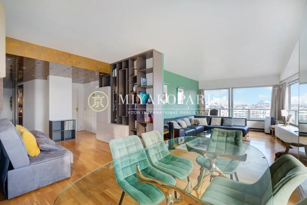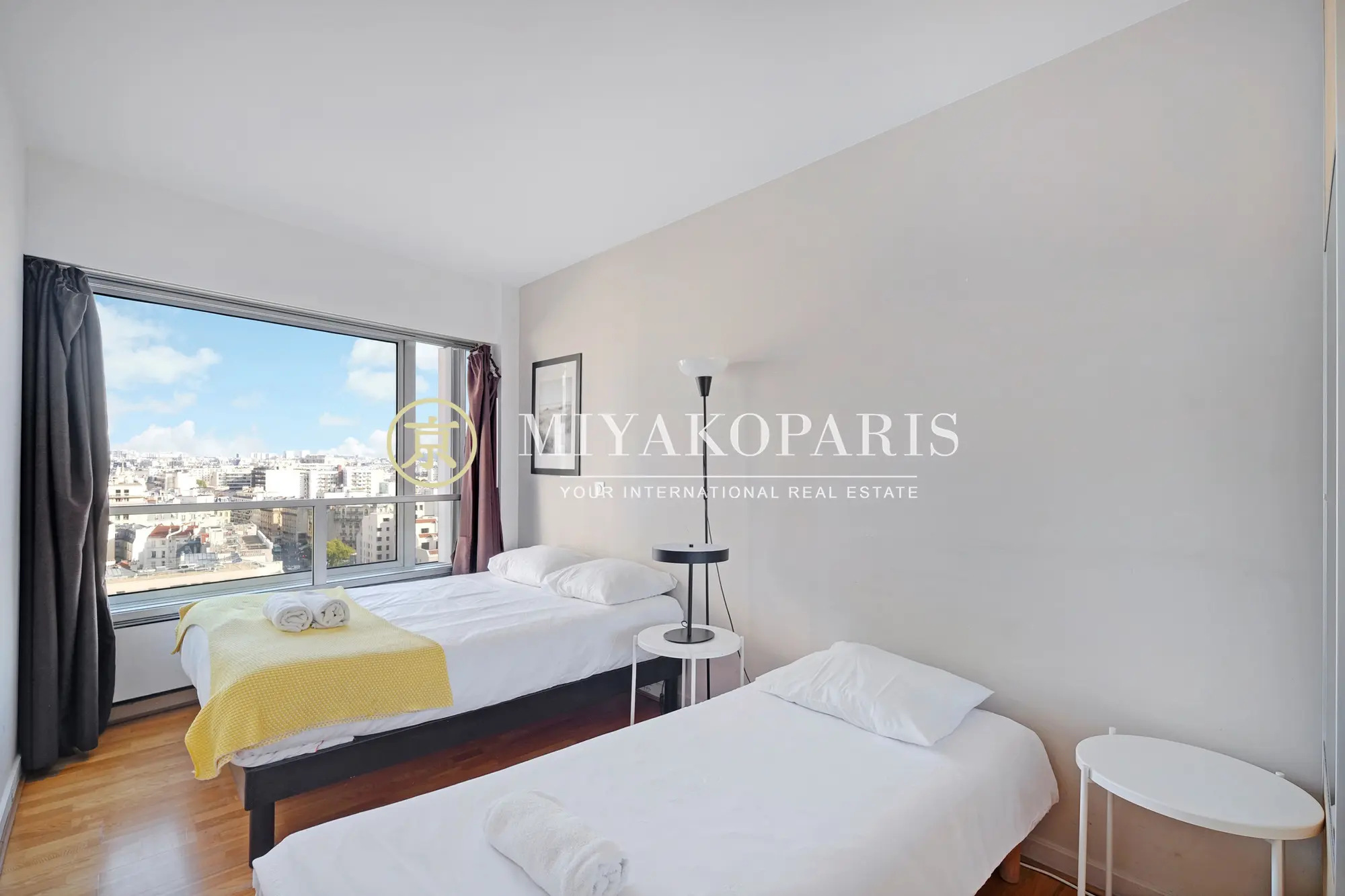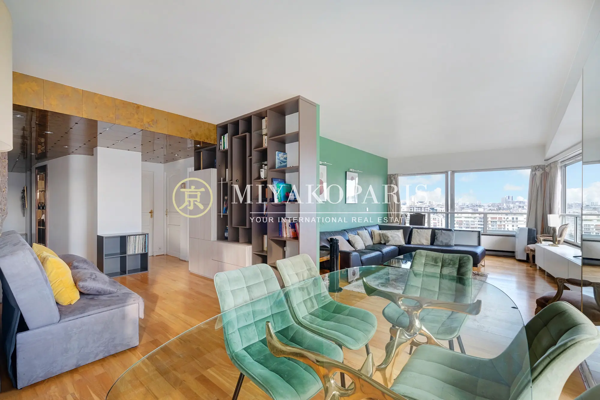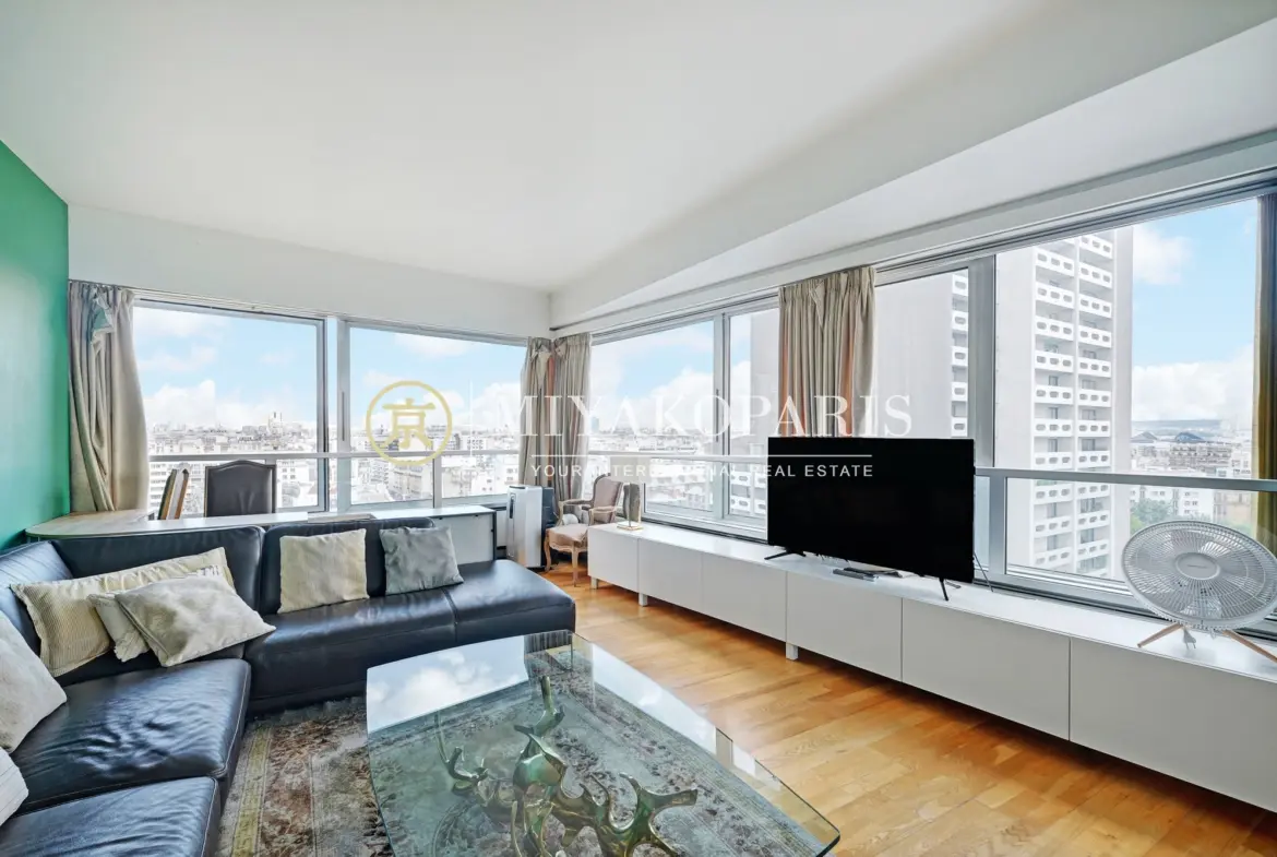 VUE EN HAUTEUR – Paris XVe – Dans un immeuble de bon standing et haute surveillance. Appartement d’angle en bon état de 94m² offrant une vue en hauteur sur Paris et la Seine se compose comme suit: entrée, double séjour d’angle, cuisine indépendante équipée (US possible), 2 chambres, 1 salle de bains avec WC, WC séparés. Belles prestations.