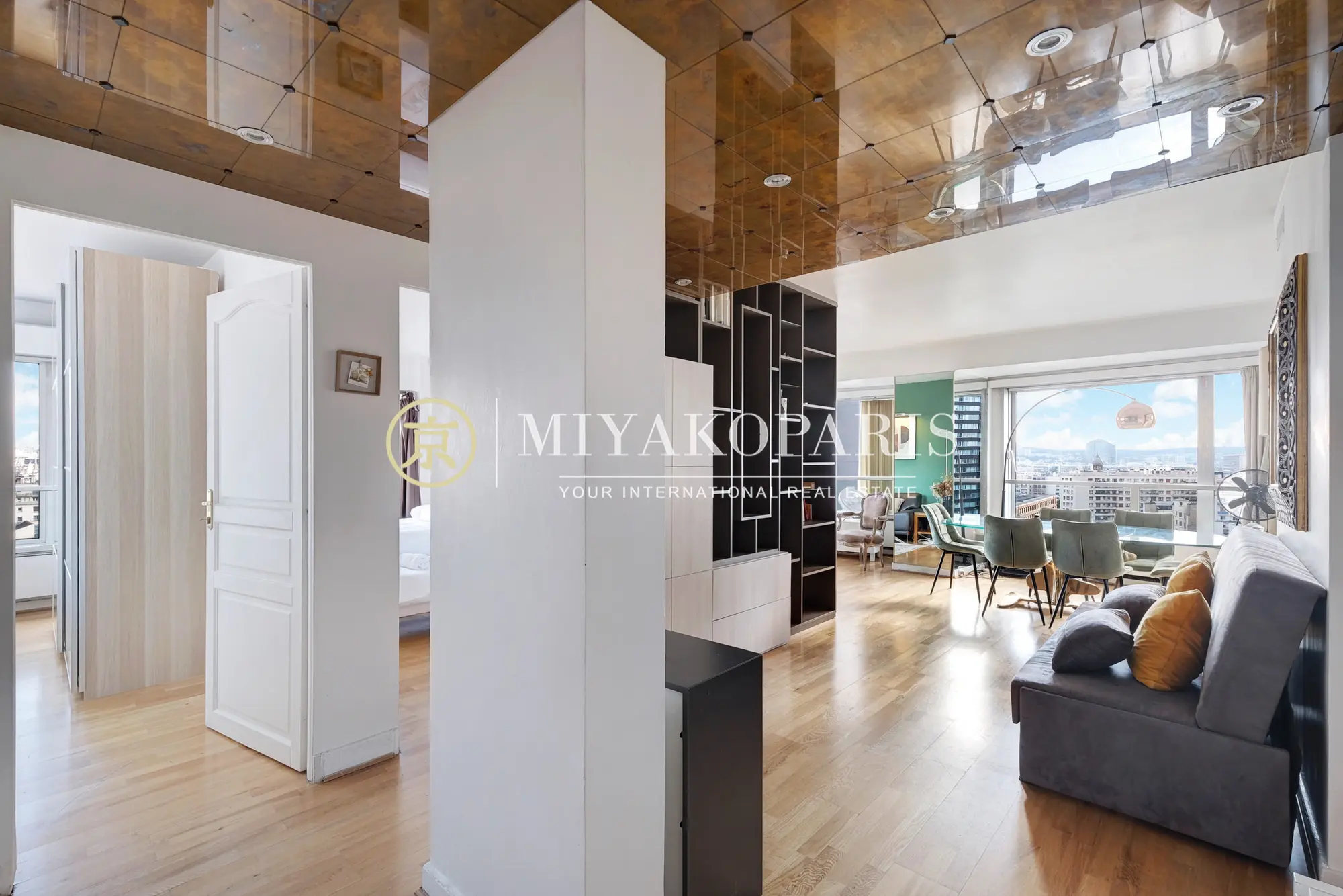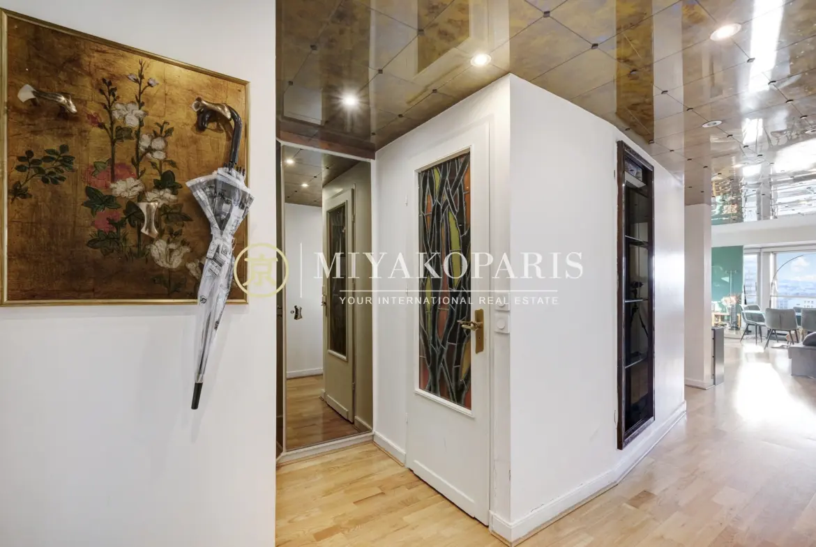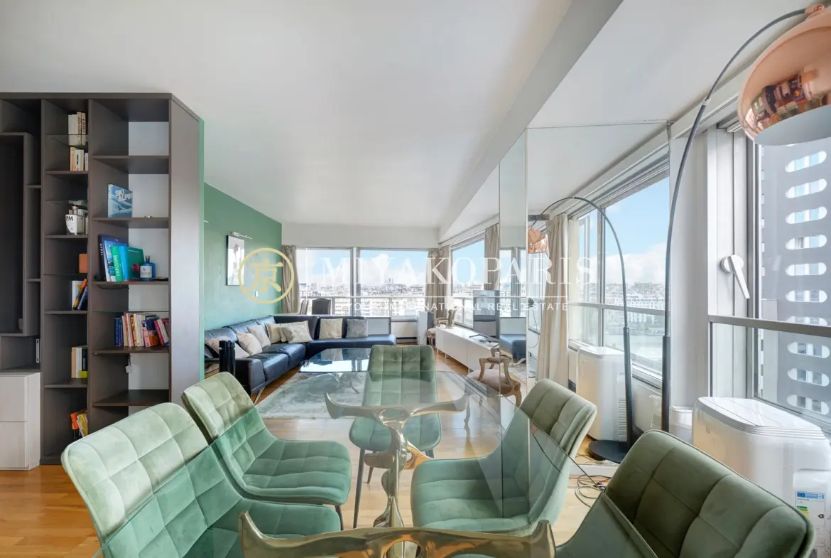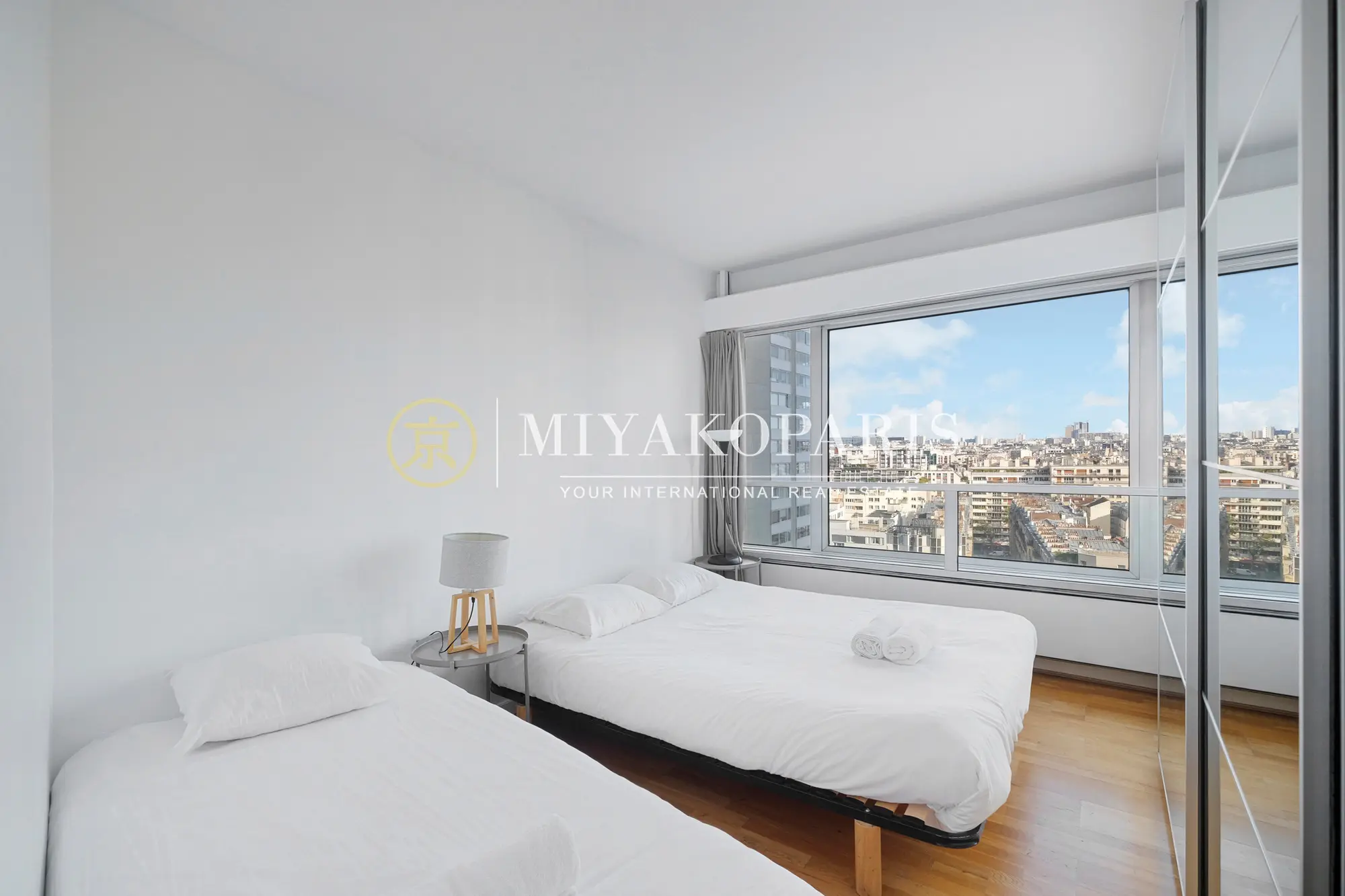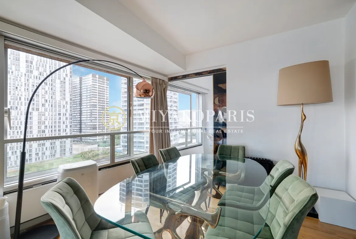 VUE EN HAUTEUR – Paris XVe – Dans un immeuble de bon standing et haute surveillance. Appartement d’angle en bon état de 94m² offrant une vue en hauteur sur Paris et la Seine se compose comme suit: entrée, double séjour d’angle, cuisine indépendante équipée (US possible), 2 chambres, 1 salle de bains avec WC, WC séparés. Belles prestations.
