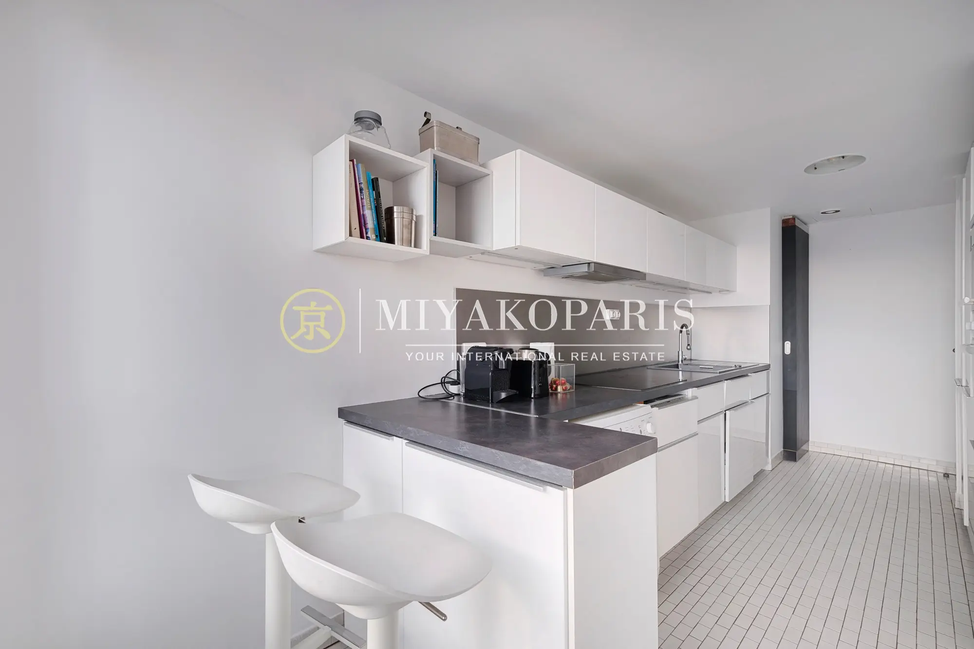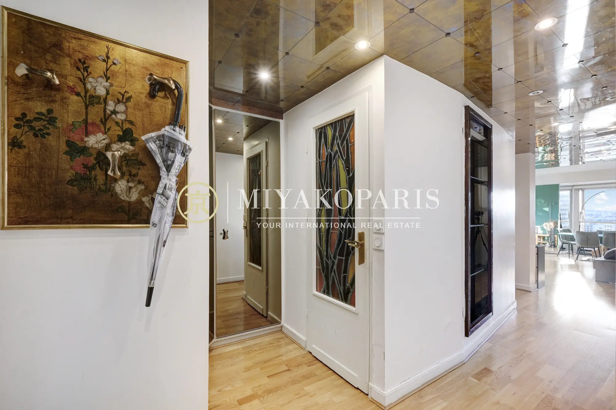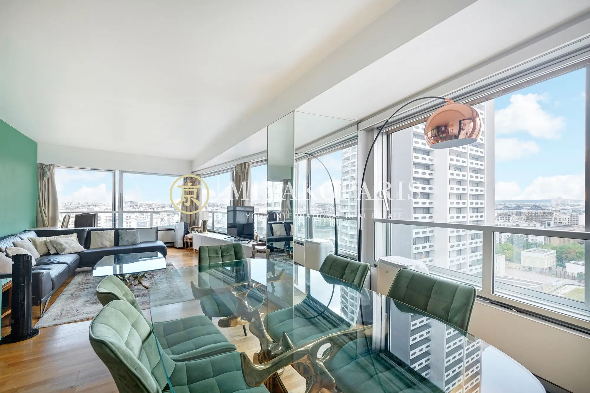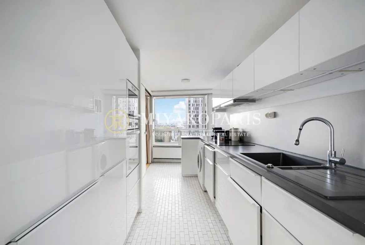 VUE EN HAUTEUR – Paris XVe – Dans un immeuble de bon standing et haute surveillance. Appartement d’angle en bon état de 94m² offrant une vue en hauteur sur Paris et la Seine se compose comme suit: entrée, double séjour d’angle, cuisine indépendante équipée (US possible), 2 chambres, 1 salle de bains avec WC, WC séparés. Belles prestations.