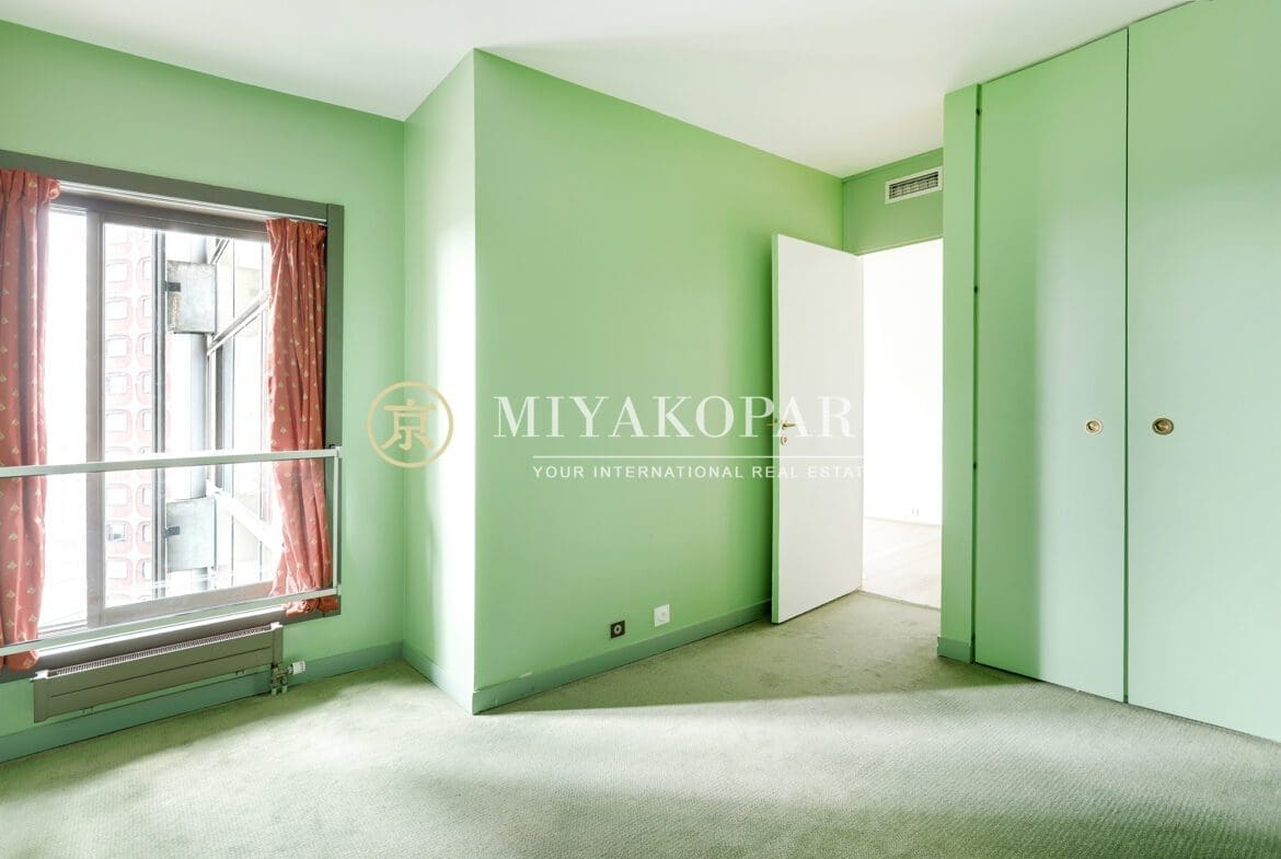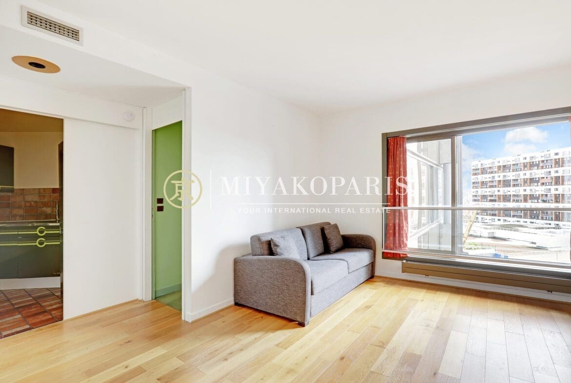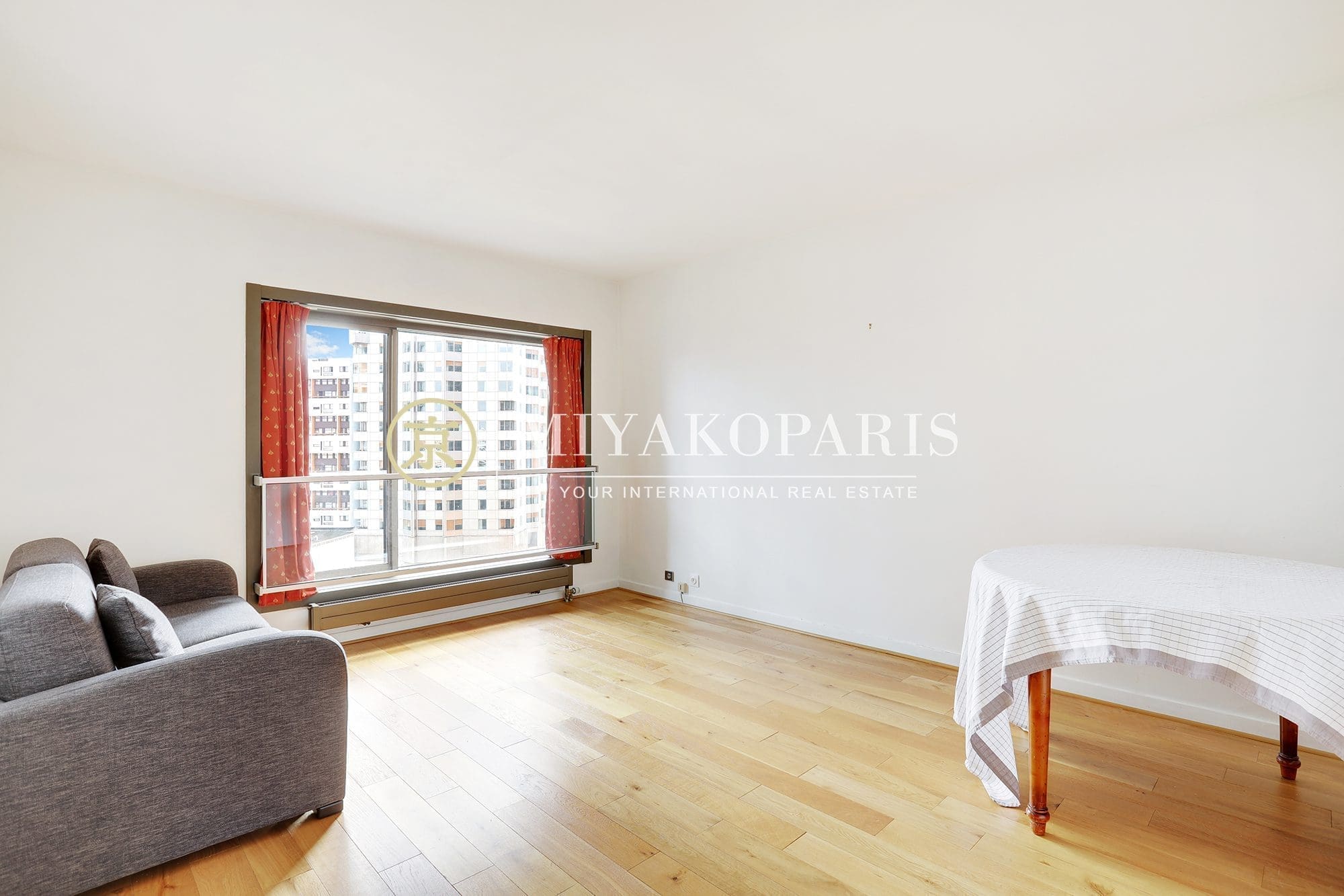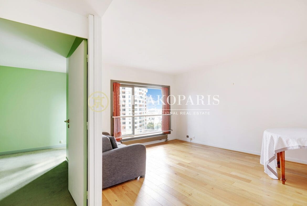 Paris XVe- Situé dans une Tour prestigieuse du Front de Seine : Le Totem, ce confortable deux pièces se compose d’une entrée avec placards, salon, cuisine séparée, 1 chambre, salle de bains avec WC.