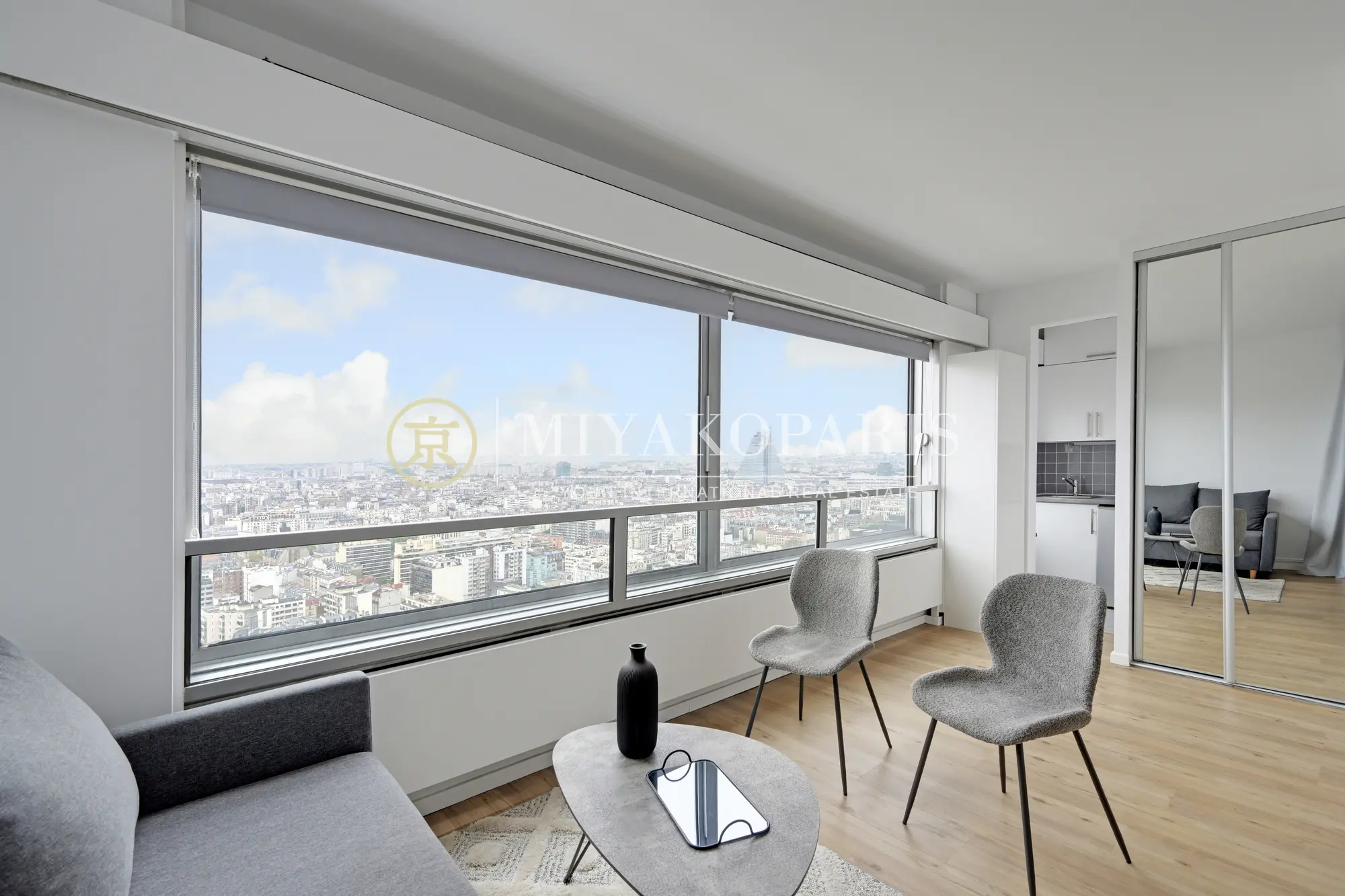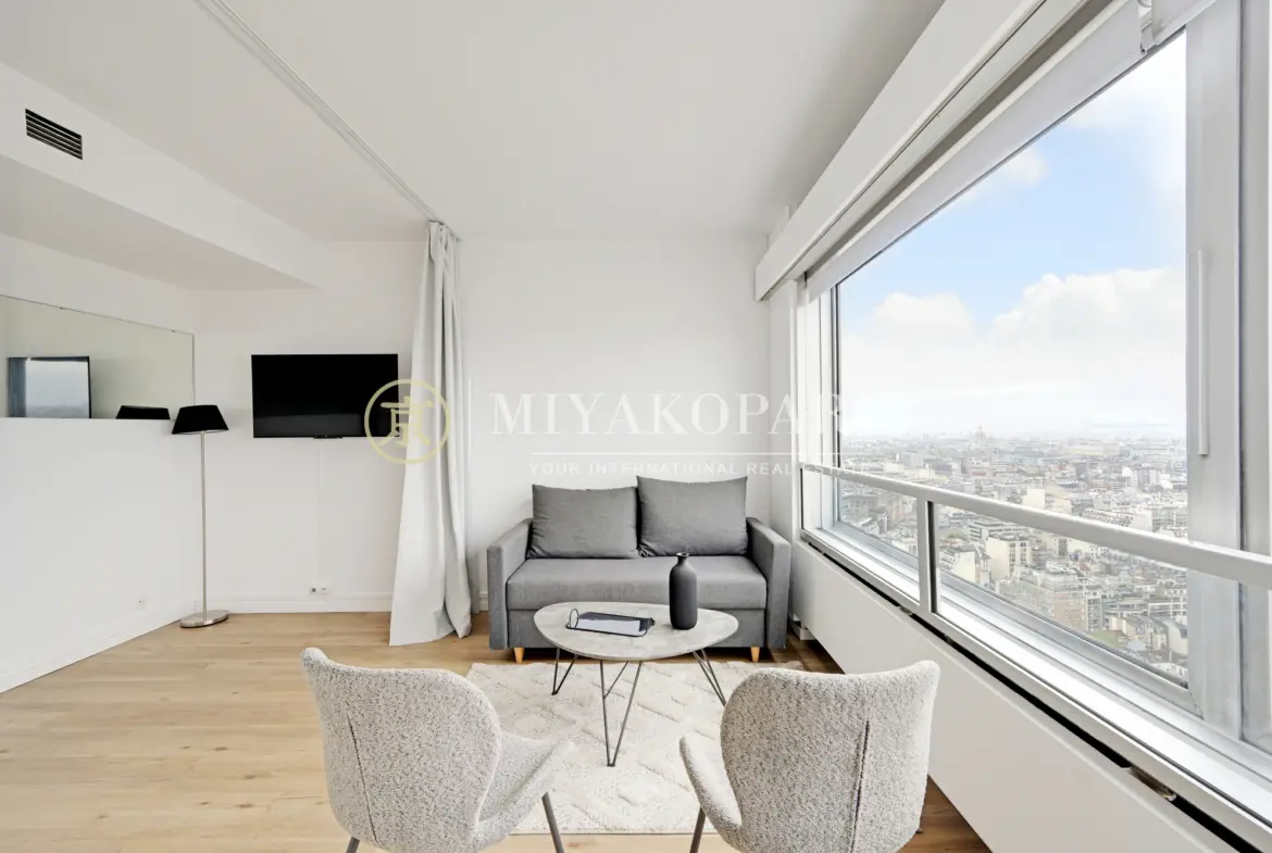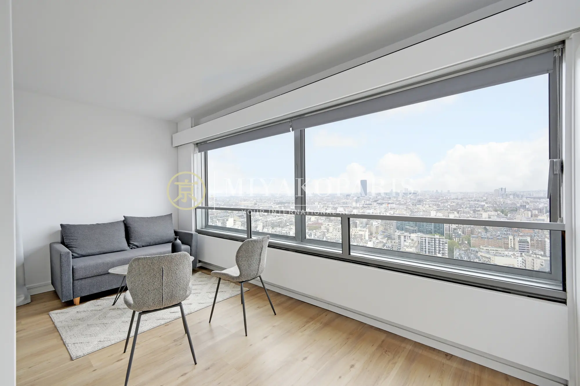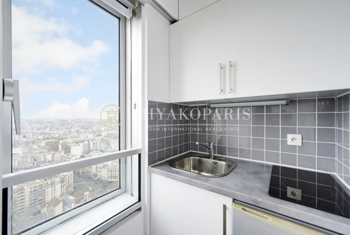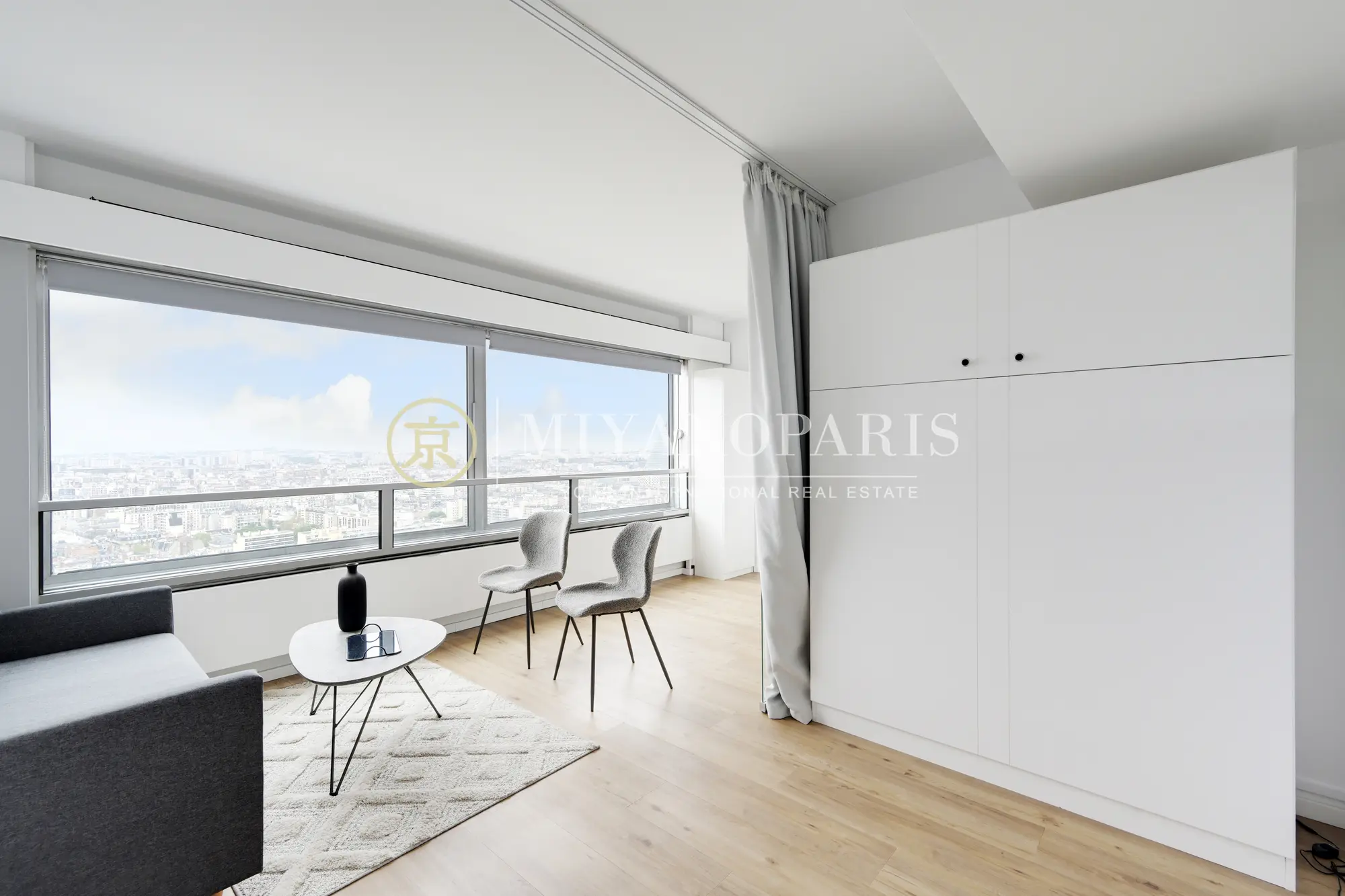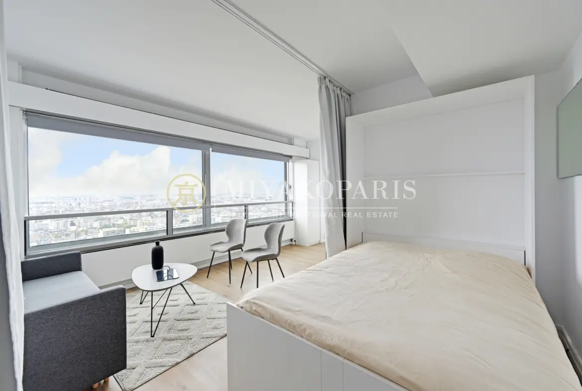 Découvrez ce magnifique studio lumineux, perché en étage très élevé, offrant une vue spectaculaire et dégagée sur tout Paris ainsi que la Seine.