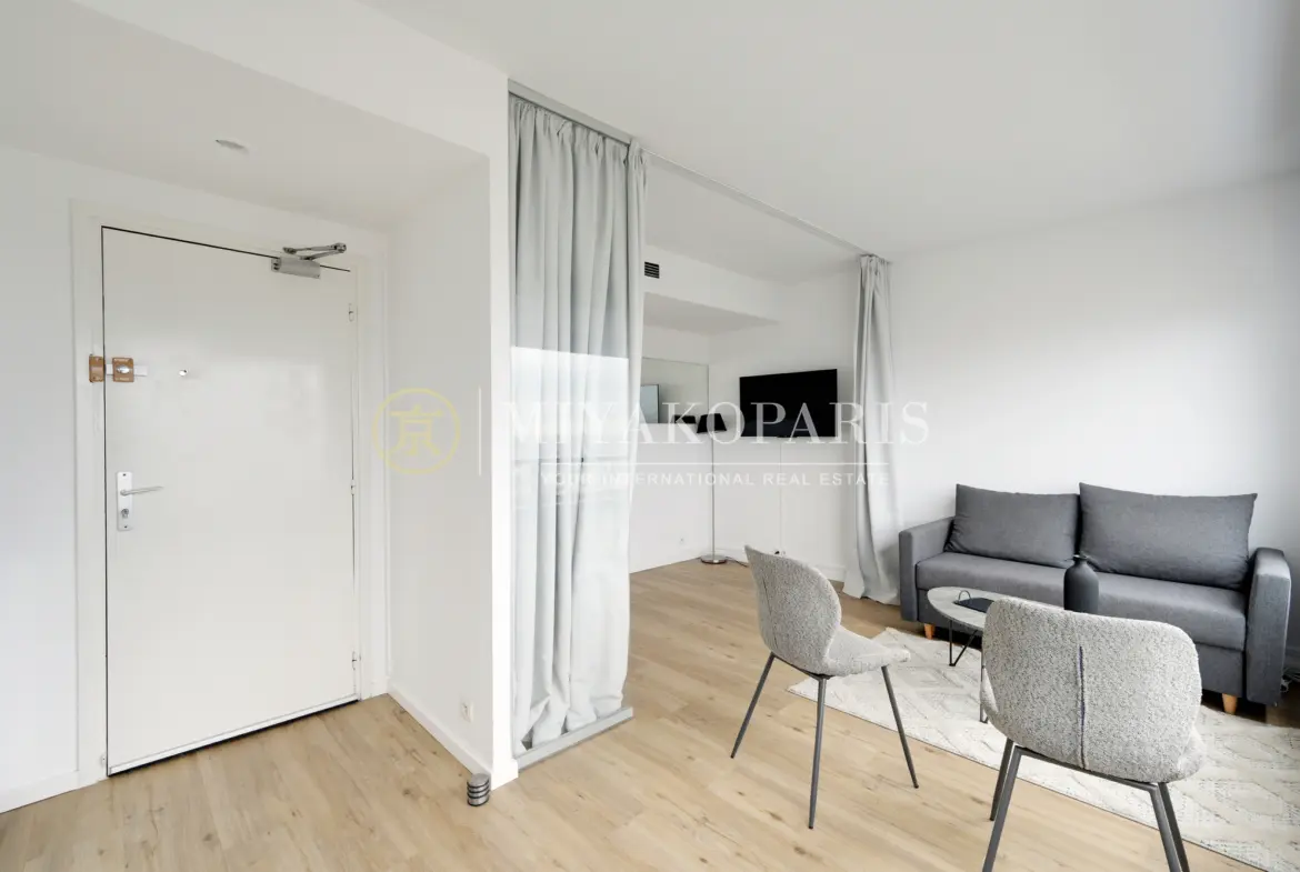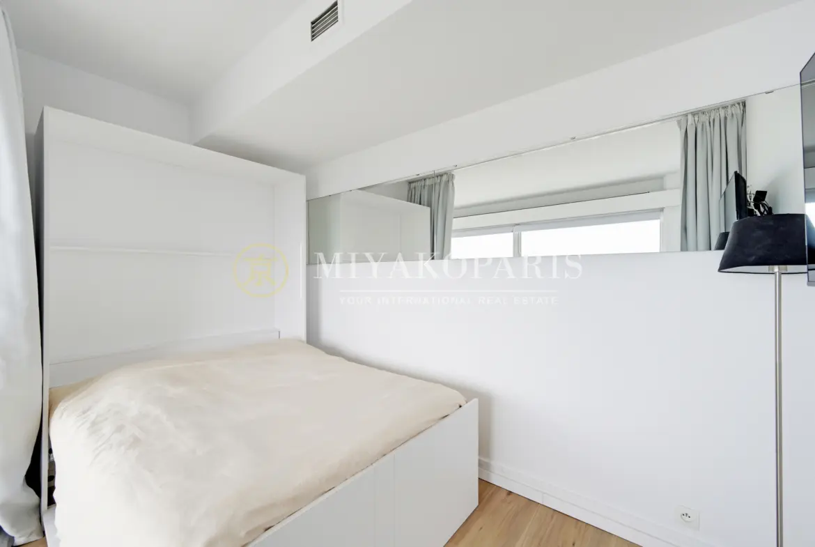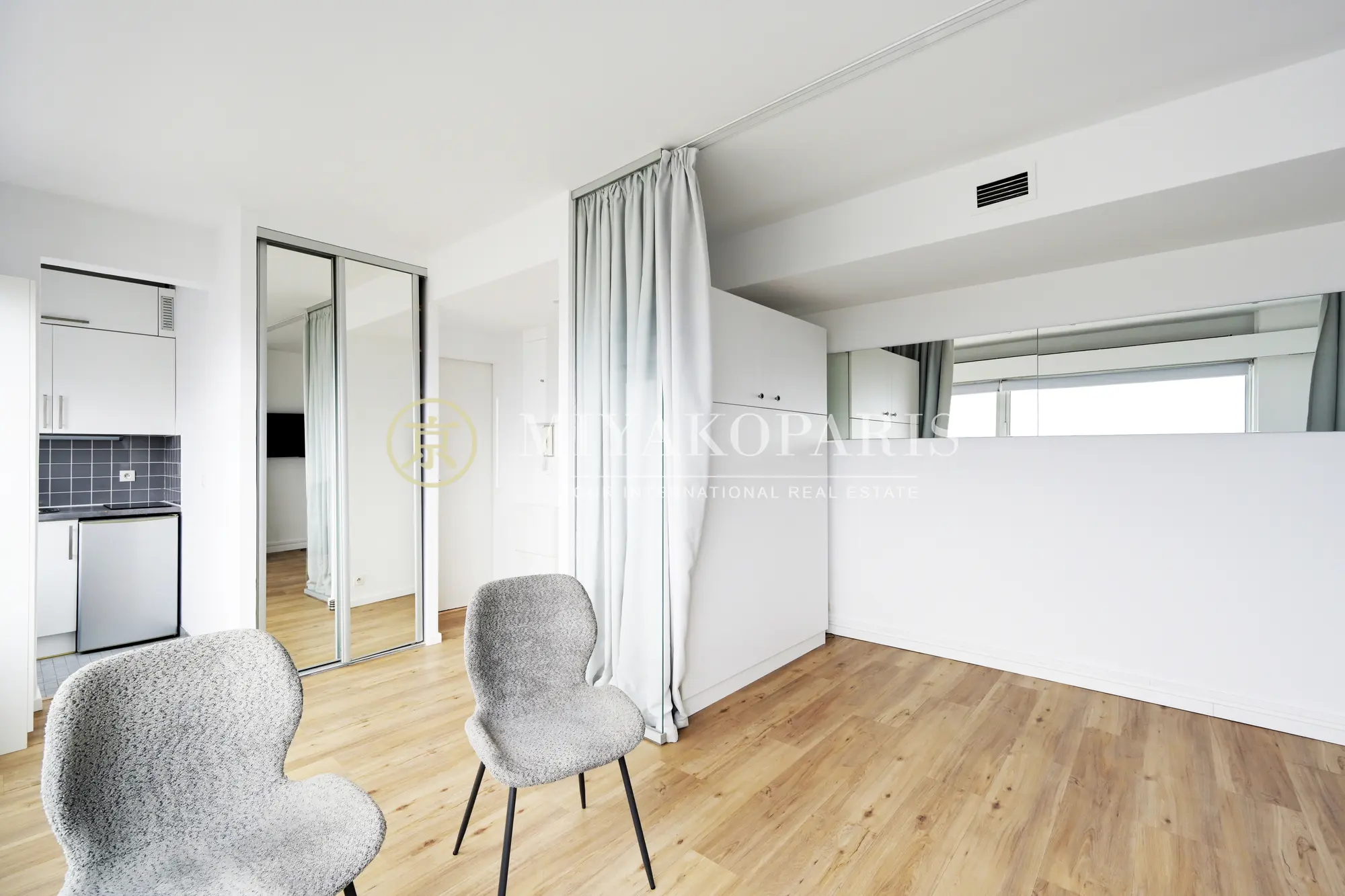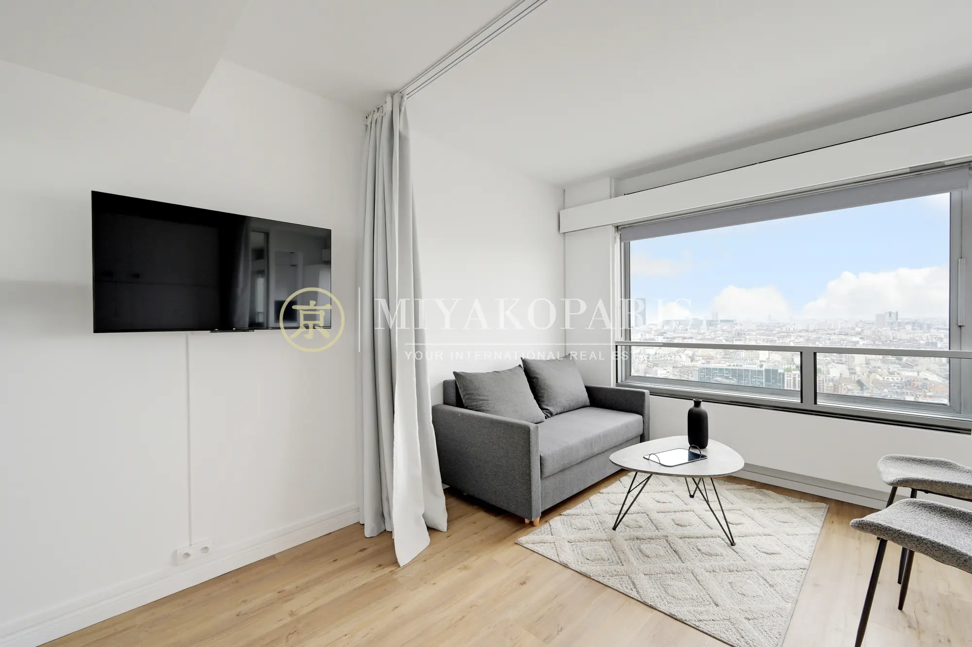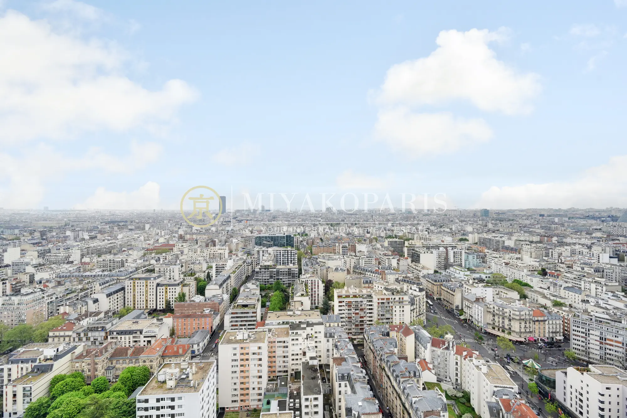 Découvrez ce magnifique studio lumineux, perché en étage très élevé, offrant une vue spectaculaire et dégagée sur tout Paris ainsi que la Seine.