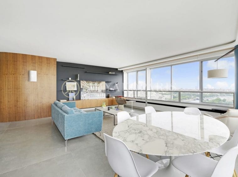 MIYAKOPARIS, L’Agence du Front de Seine ! COUP DE COEUR – Paris XVe – Front de Seine. Dans un immeuble de bon standing et haute surveillance, étage très élevé. Appartement d’angle refait par un architecte offrant une vue à 180 degrés sur la Seine / la Tour Eiffel se compose : entrée, séjour, cuisine américaine entièrement équipée Miele, 2 chambres avec chacune sa salle d’eau et toilette. WC séparés. Belles prestations. Rare. Plan sur demande.