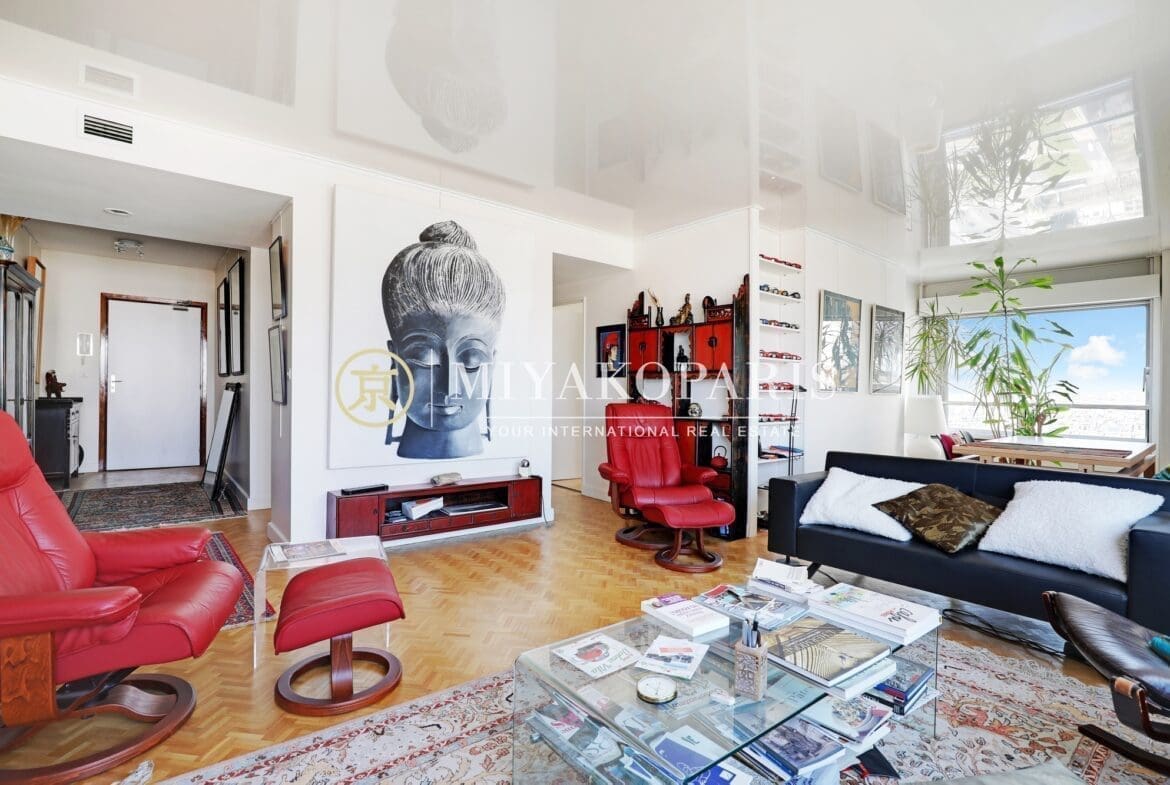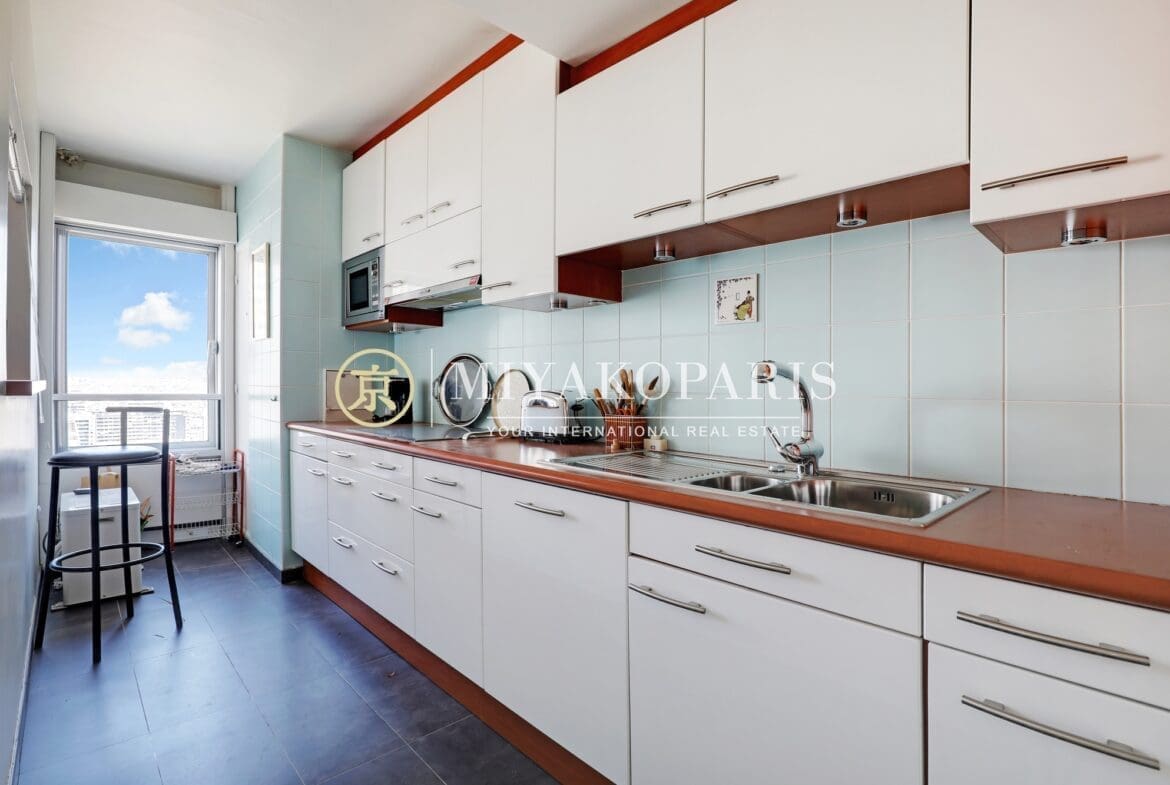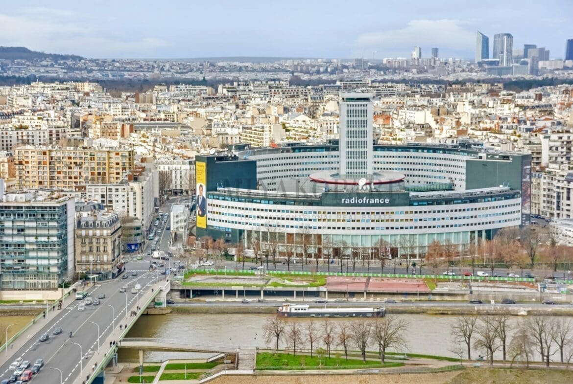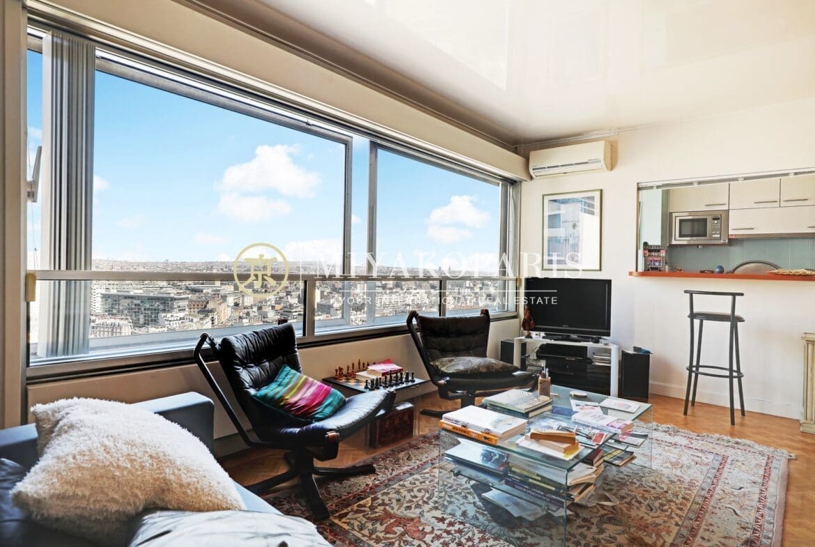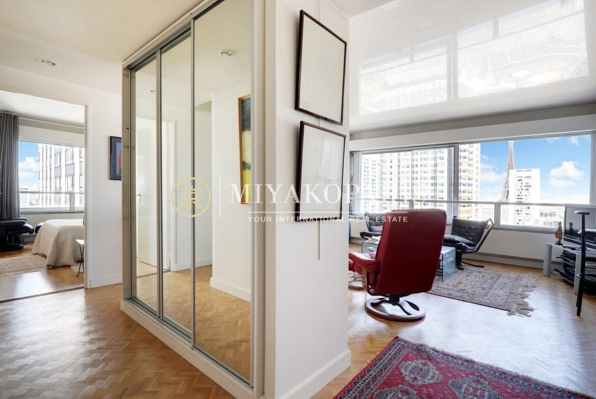 Paris XVe, Beaugrenelle. Situé dans une résidence prisée du Front de Seine, appartement d’angle offrant une vue aérienne sur la Tour Eiffel / Seine / Nombreux Monuments (Invalides, le Panthéon, la Cathédrale Notre-Dame de Paris, Montmartre) composé comme suit : entrée, double séjour d’angle (2 chambres possible), cuisine indépendante entièrement aménagée et équipée (US possible), 1 chambre vue Seine / Radio France / Mont Valérien, 1 salle de bains avec WC, WC d’invités. Rangements.