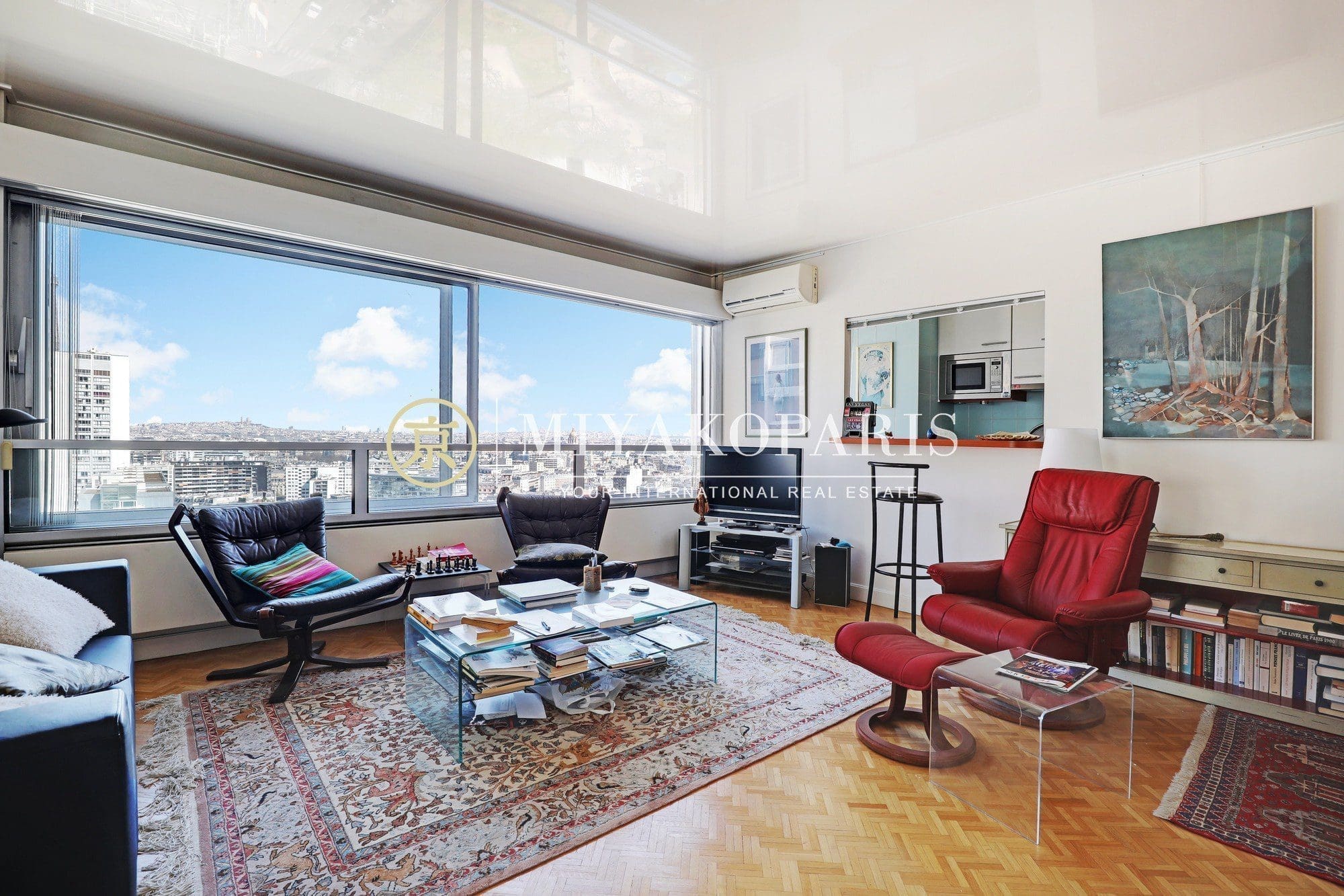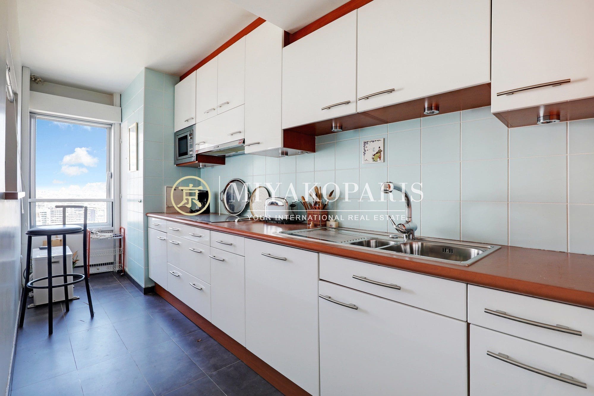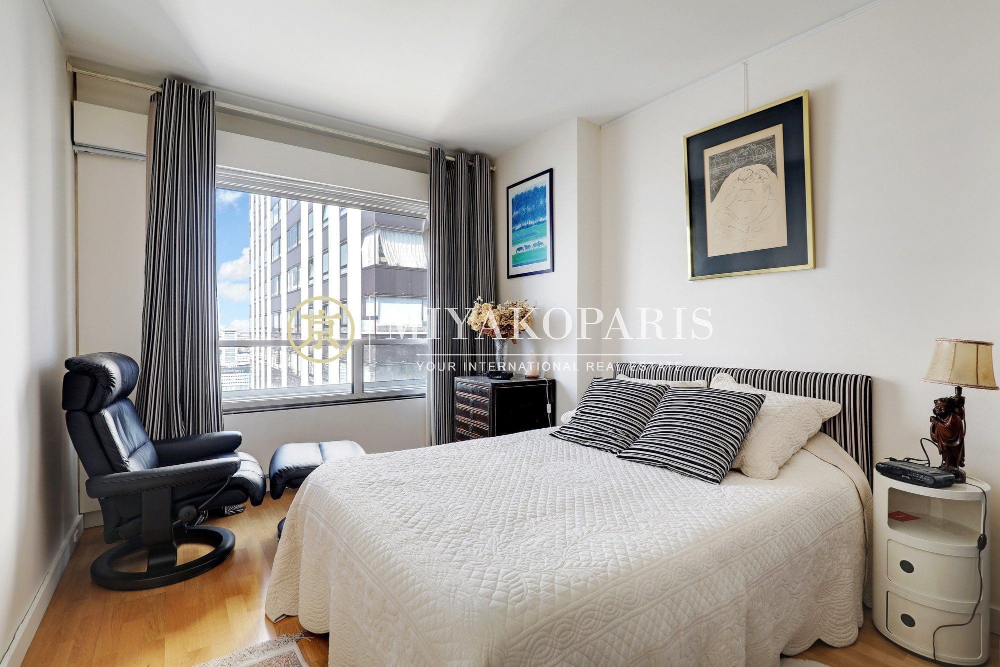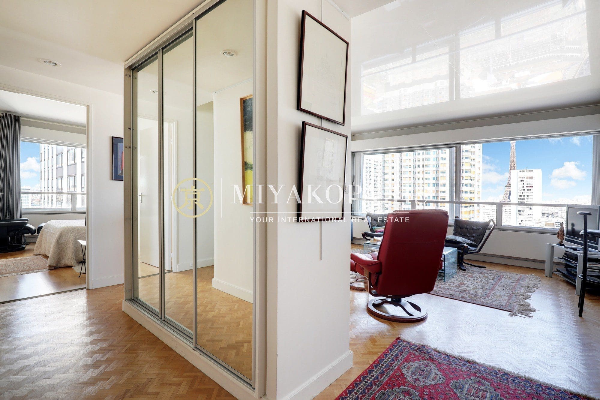Paris XVe, Beaugrenelle. Situé dans une résidence prisée du Front de Seine, appartement d’angle offrant une vue aérienne sur la Tour Eiffel / Seine / Nombreux Monuments (Invalides, le Panthéon, la Cathédrale Notre-Dame de Paris, Montmartre) composé comme suit : entrée, double séjour d’angle (2 chambres possible), cuisine indépendante entièrement aménagée et équipée (US possible), 1 chambre vue Seine / Radio France / Mont Valérien, 1 salle de bains avec WC, WC d’invités. Rangements.