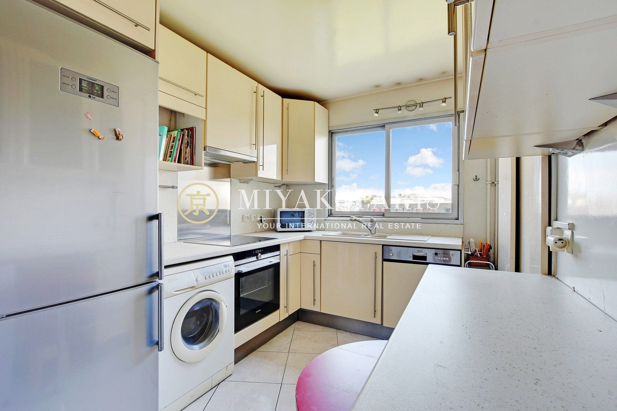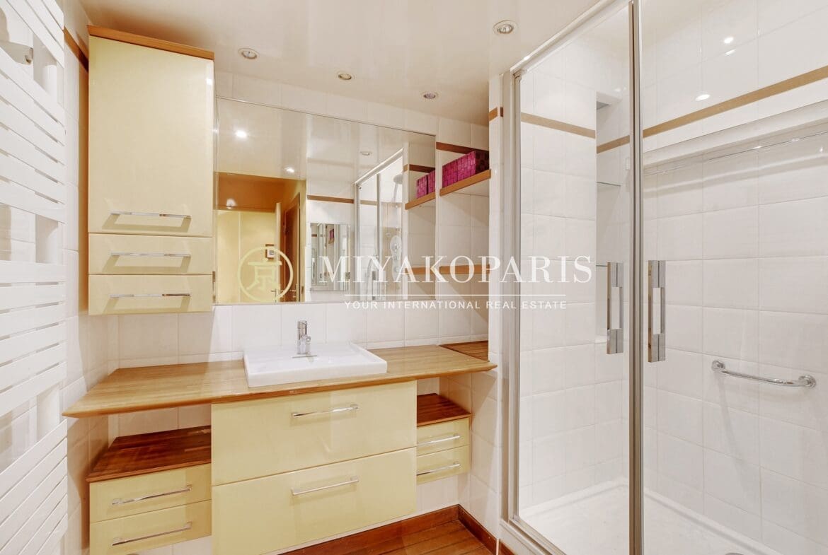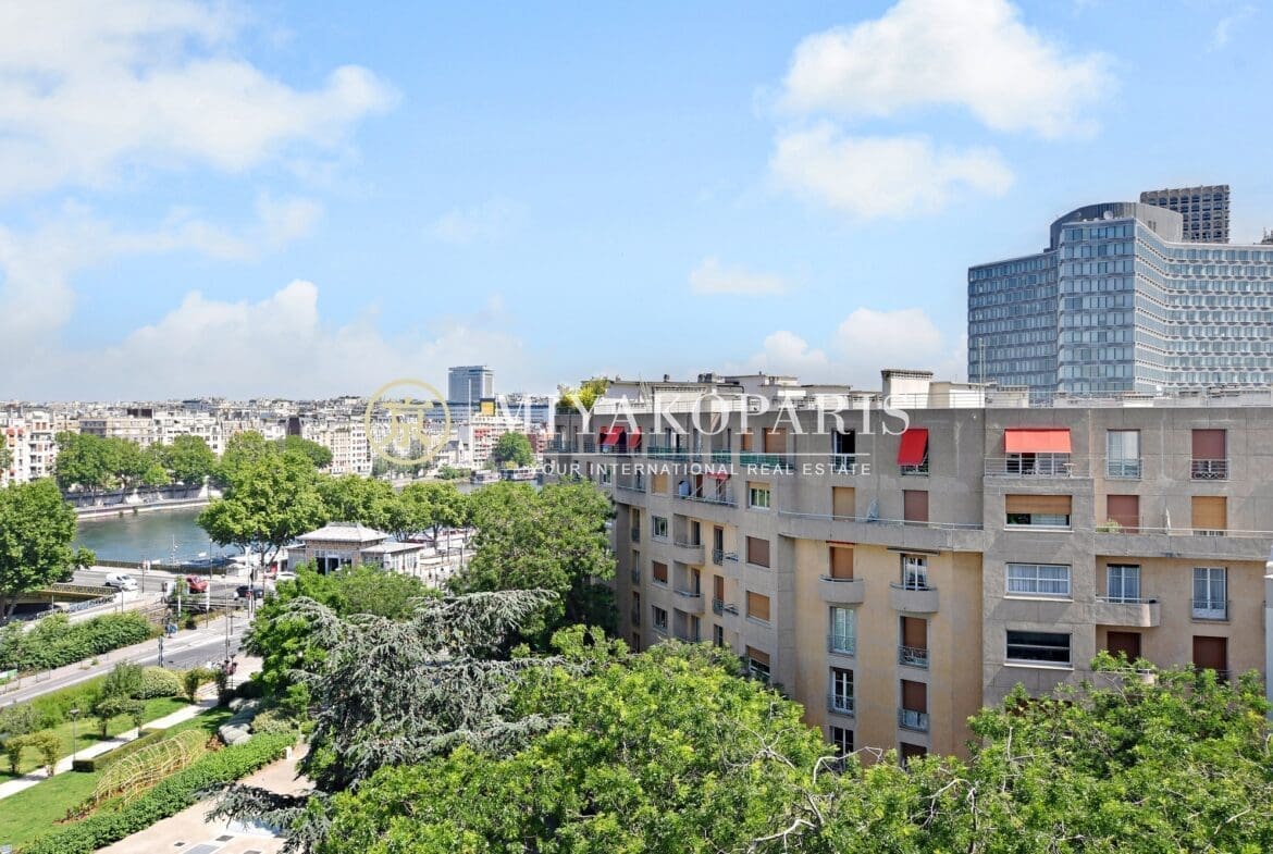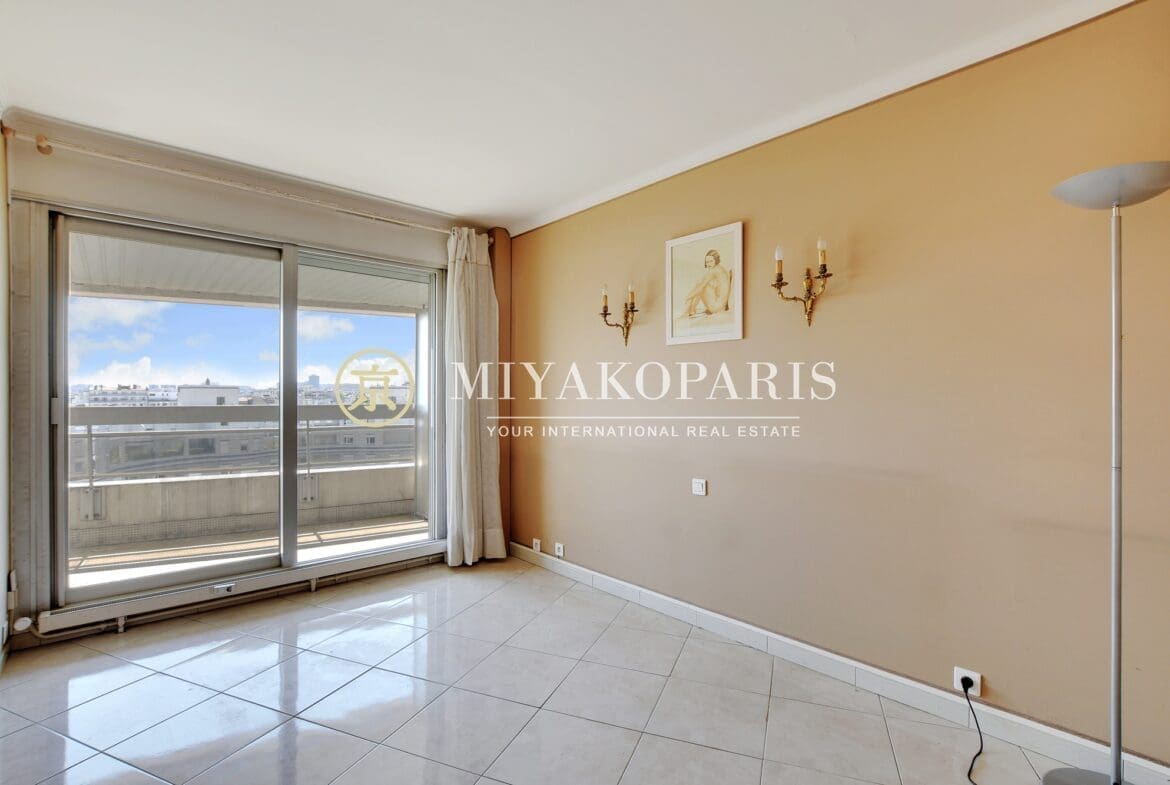 VUE EN HAUTEUR – Paris XVe – Cet appartement de 96,71 m² Loi Carrez se situe dans un immeuble de standing des années 1980. Il se compose d’une entrée, double réception (3ème chambre possible) avec balcon (3,3m2) offrant une vue en hauteur sur la Seine & Paris, cuisine indépendante (US possible), 2 chambres dont une bénéficiant d’une belle terrasse (7,47m2) vue dégagée Paris. 2 salles de bains dont une avec WC.