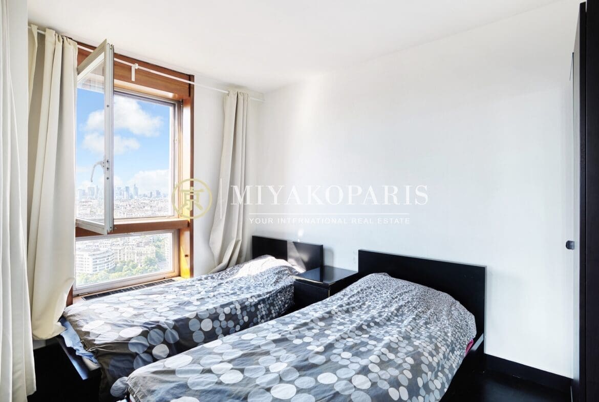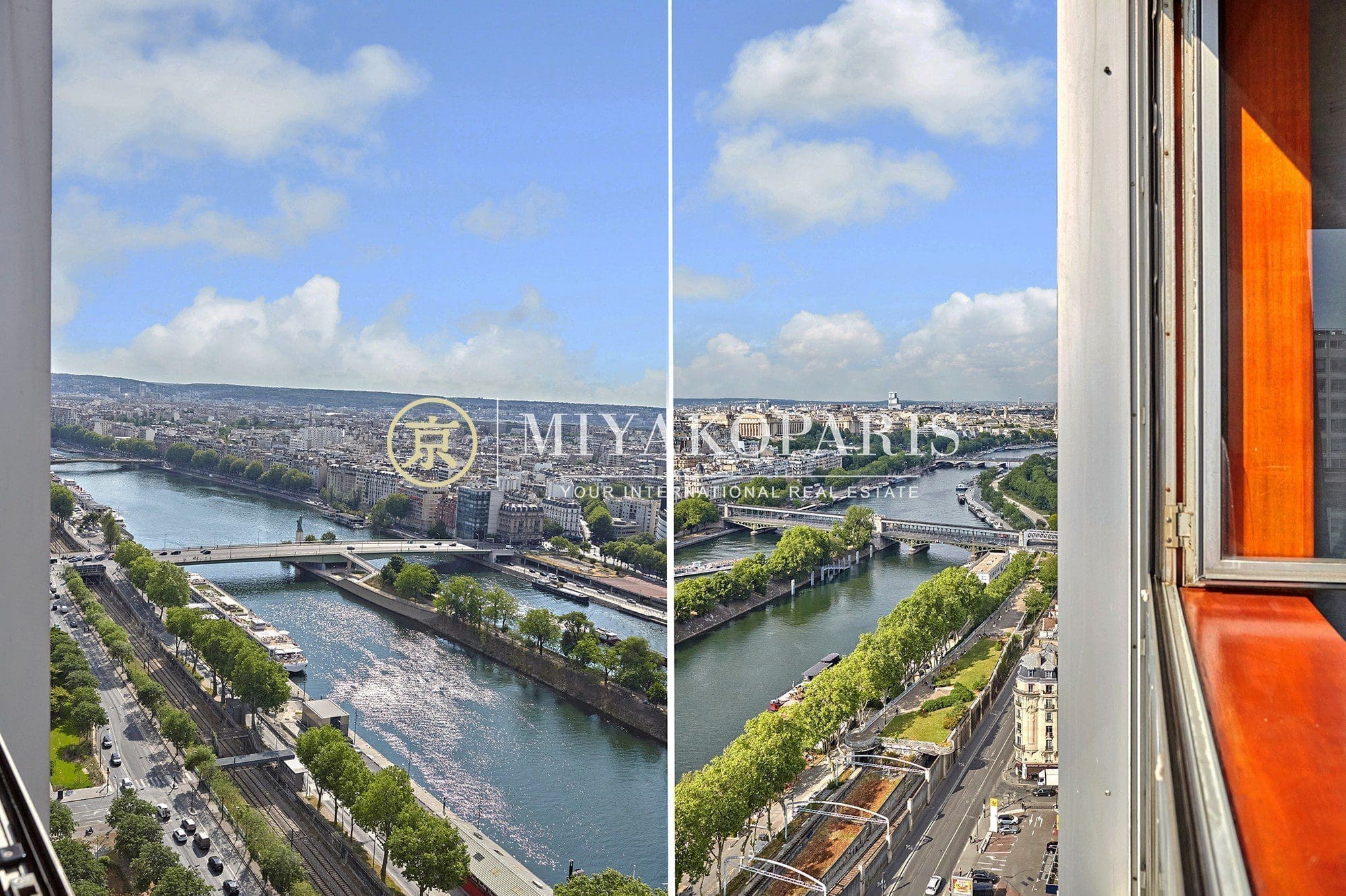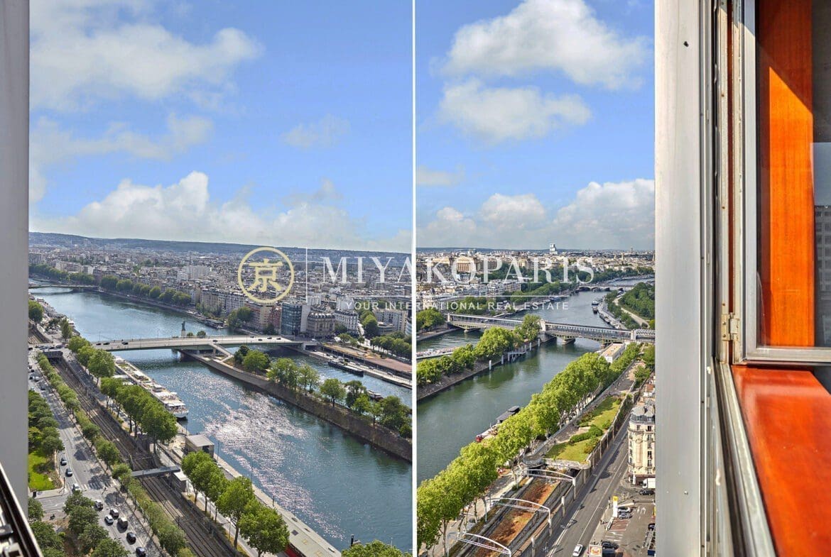 VUE AÉRIENNE ! Paris XVe – Dans un immeuble de bon standing et haute surveillance. Appartement 3 pièces de 69.55m² Loi carrez offrant une vue aérienne sur la Seine se compose : entrée, séjour d’angle avec grandes baies vitrées offrant des vues fabuleuses sur la Seine, les toits de Paris, le Mont Valérien ainsi que la Statue de la Liberté, cuisine indépendante équipée (US possible), 2 chambres, 1 salle de bains, WC séparés. Nombreux rangements. Belles prestations.