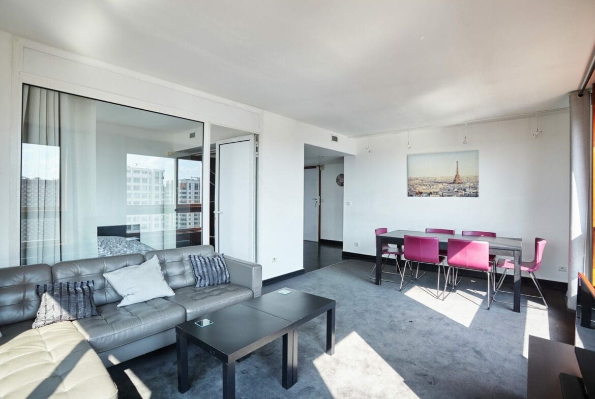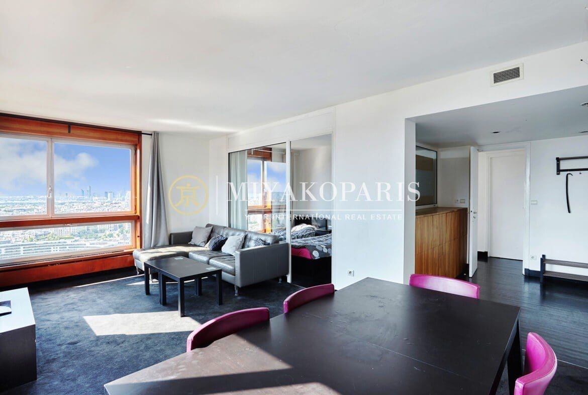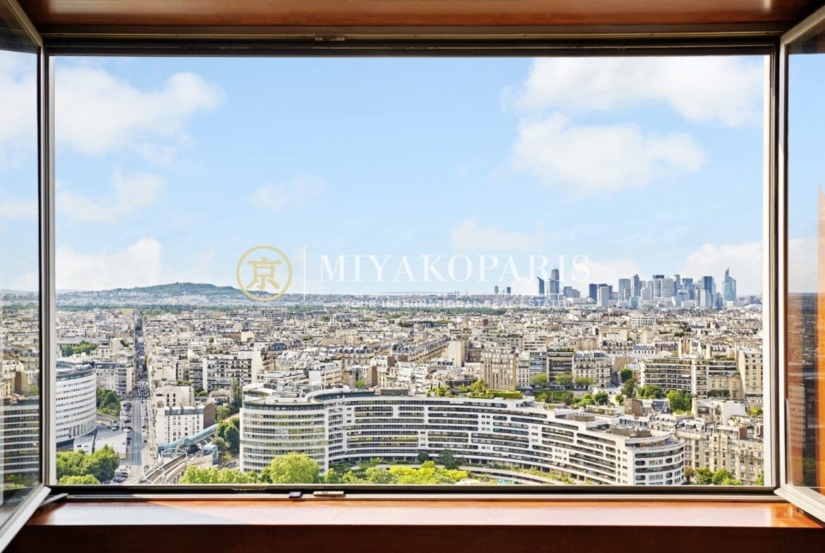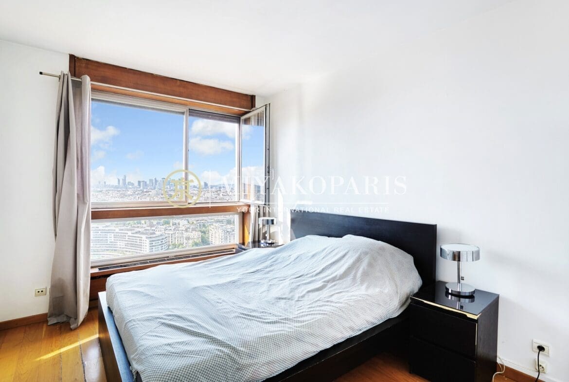 VUE AÉRIENNE ! Paris XVe – Dans un immeuble de bon standing et haute surveillance. Appartement 3 pièces de 69.55m² Loi carrez offrant une vue aérienne sur la Seine se compose : entrée, séjour d’angle avec grandes baies vitrées offrant des vues fabuleuses sur la Seine, les toits de Paris, le Mont Valérien ainsi que la Statue de la Liberté, cuisine indépendante équipée (US possible), 2 chambres, 1 salle de bains, WC séparés. Nombreux rangements. Belles prestations.