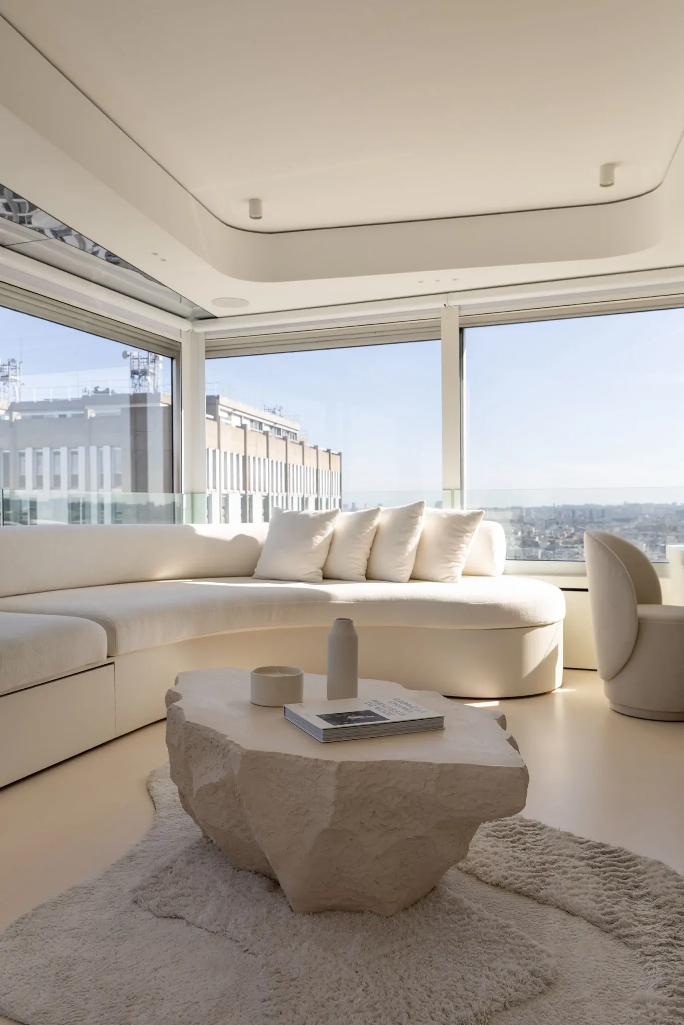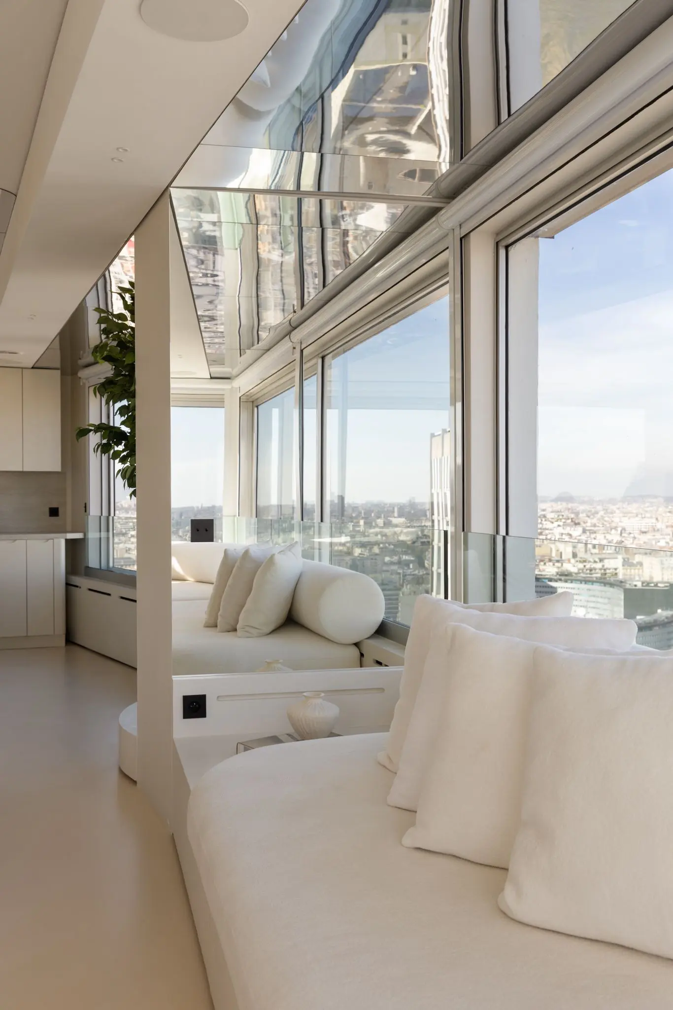 Véritable écrin de lumière, le séjour aux immenses baies vitrées crée une sensation de vivre dans le ciel.