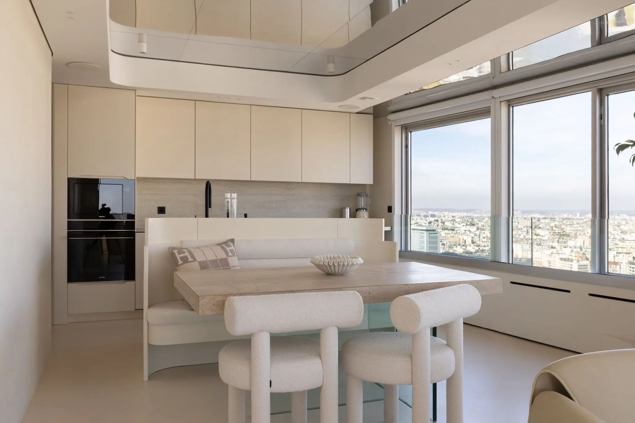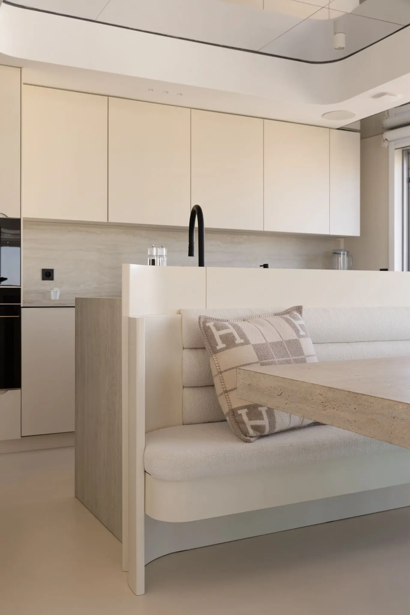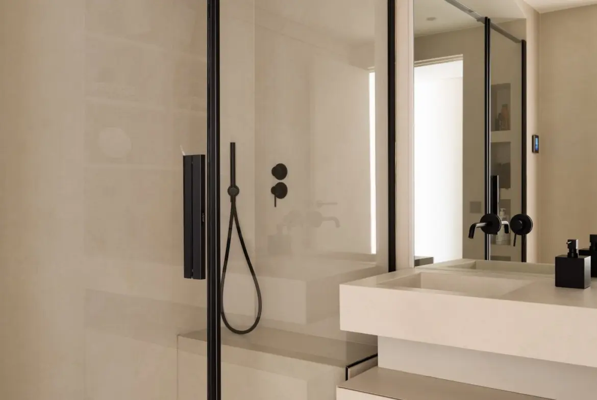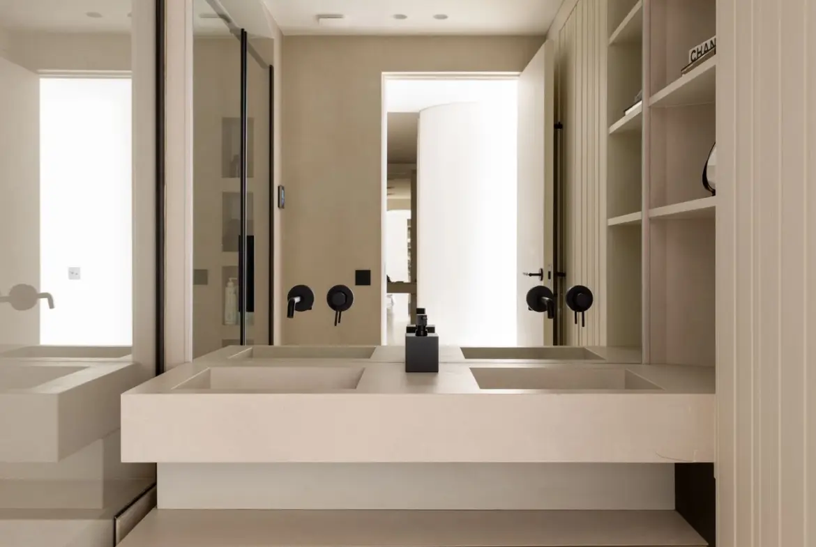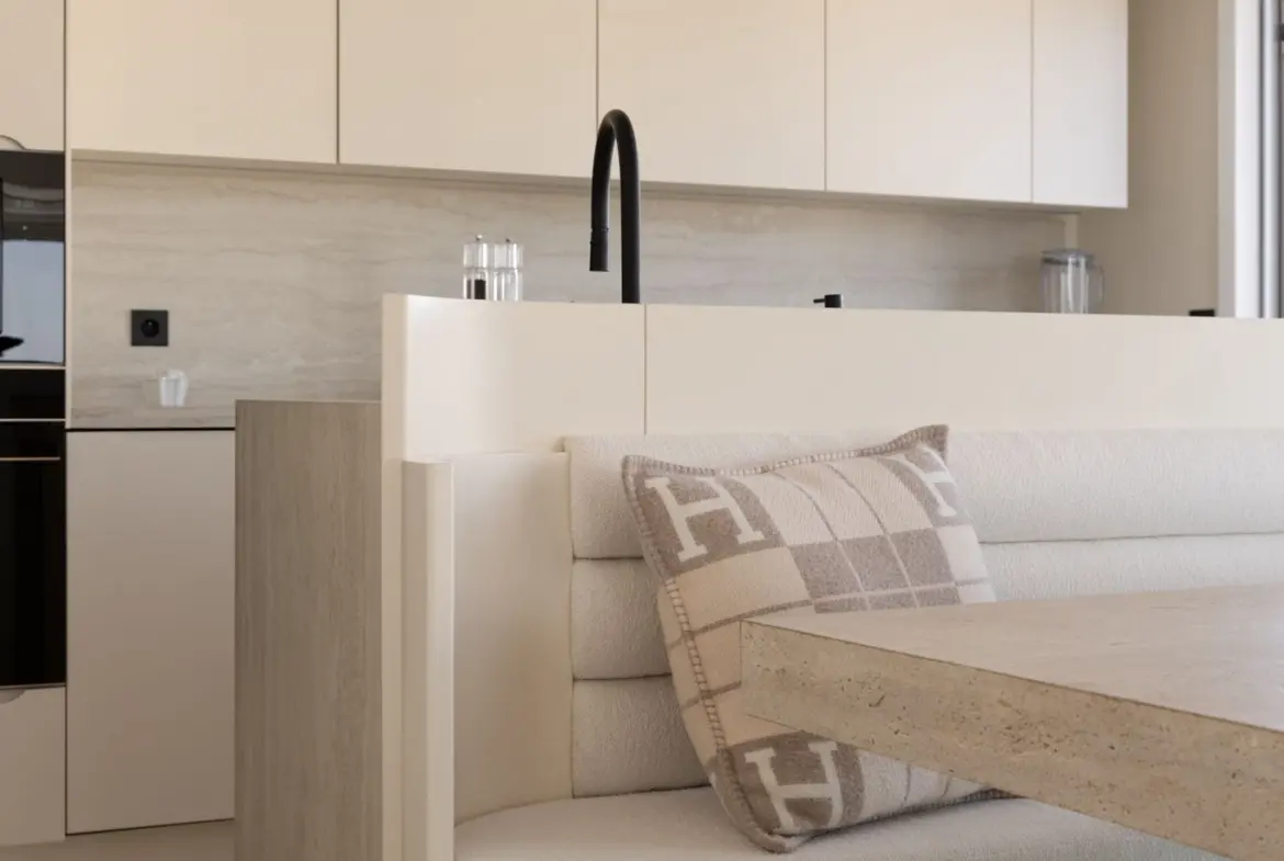 Prestations ultra haut de gamme : béton ciré, mobilier sur mesure, robinetterie Tremme, accessoires Decor Walther, WC Versace modèle trône, chaises Noom, fauteuil Poliform, système audio Sonos, éclairages Studio On, Wever & Ducré, poignées Buster & Punch, canapé du salon sur mesure en tissu Pierre Frey.