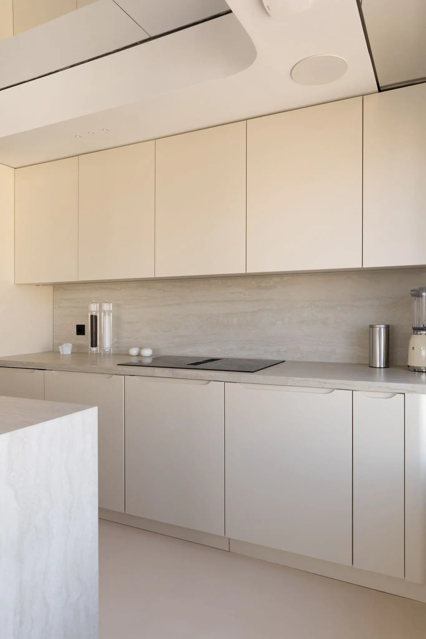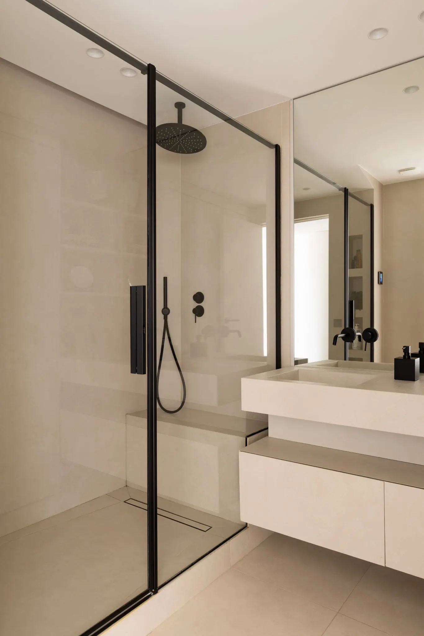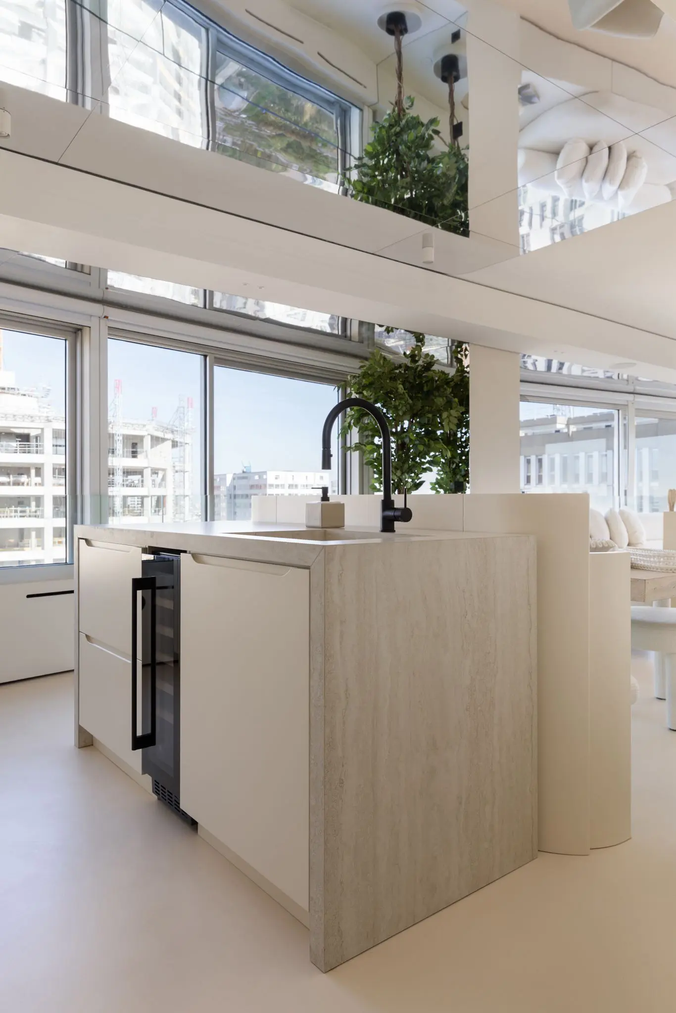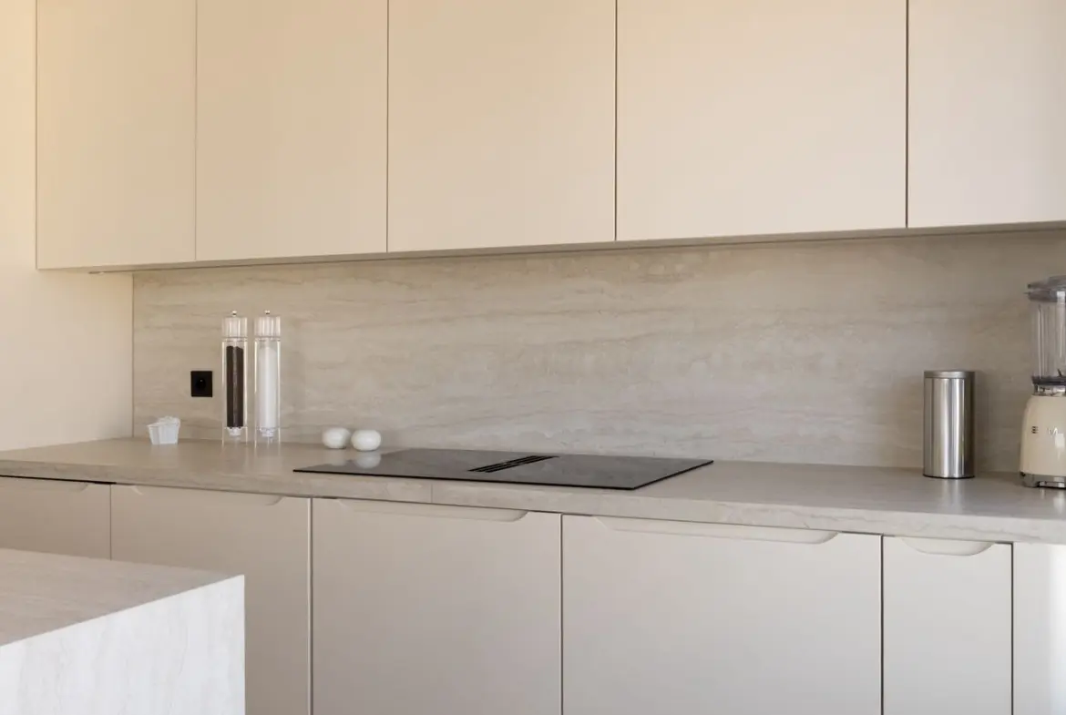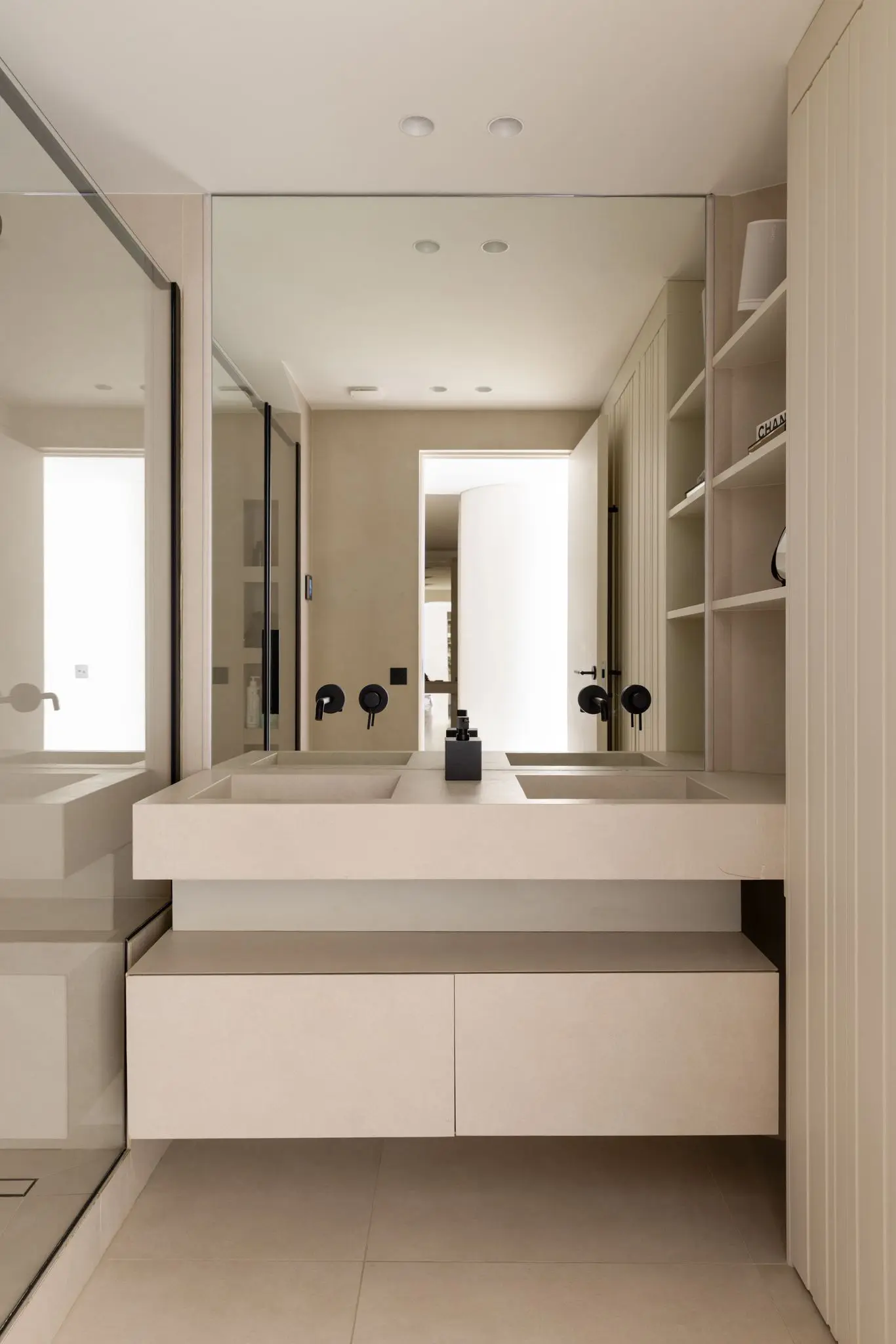 Prestations ultra haut de gamme : béton ciré, mobilier sur mesure, robinetterie Tremme, accessoires Decor Walther, WC Versace modèle trône, chaises Noom, fauteuil Poliform, système audio Sonos, éclairages Studio On, Wever & Ducré, poignées Buster & Punch, canapé du salon sur mesure en tissu Pierre Frey.