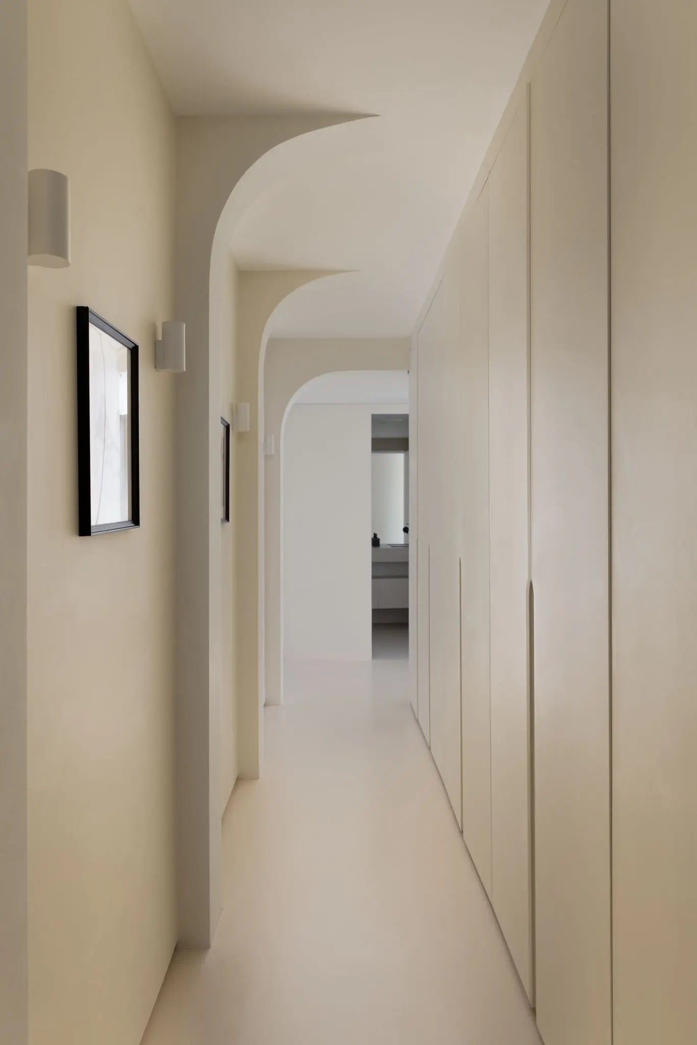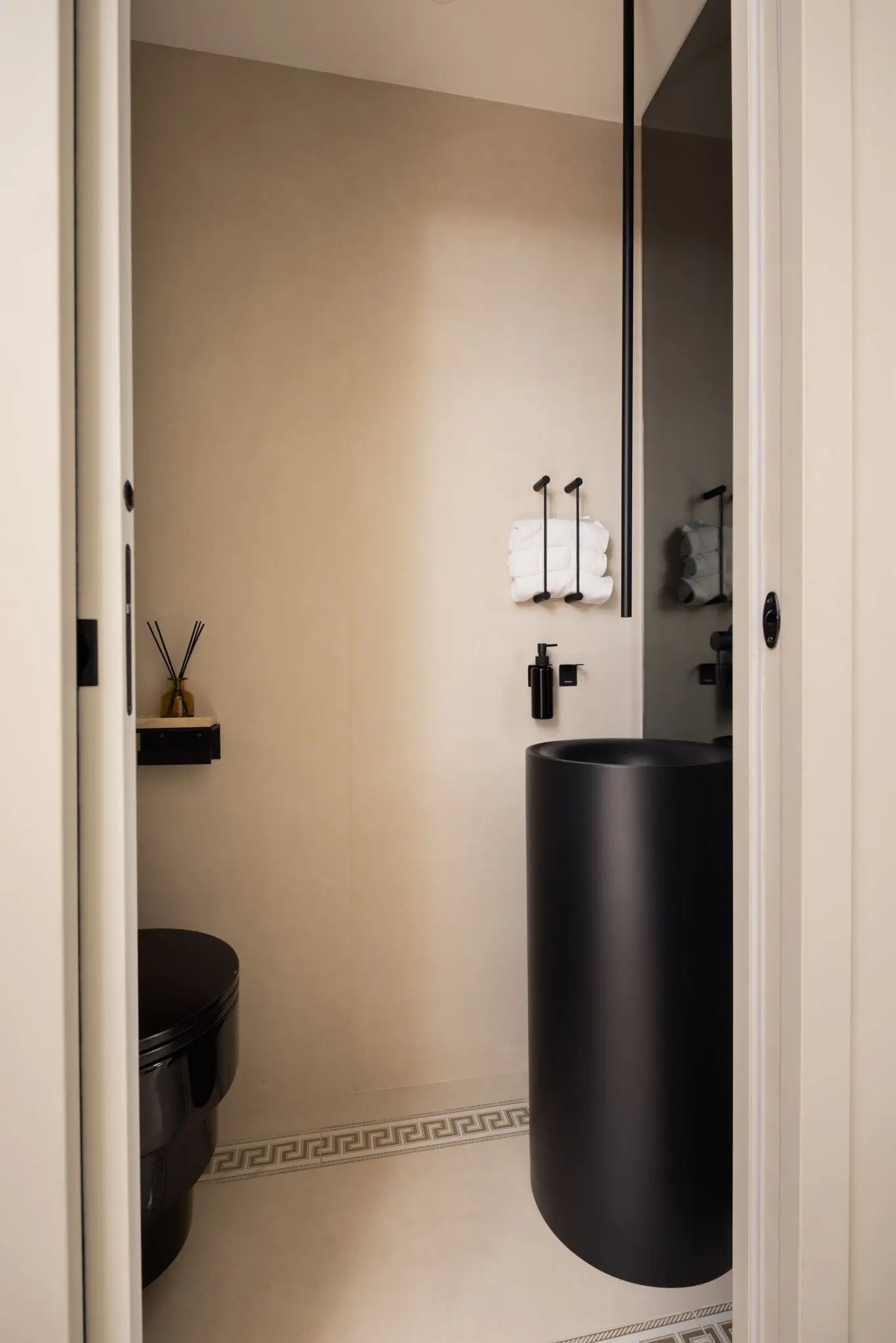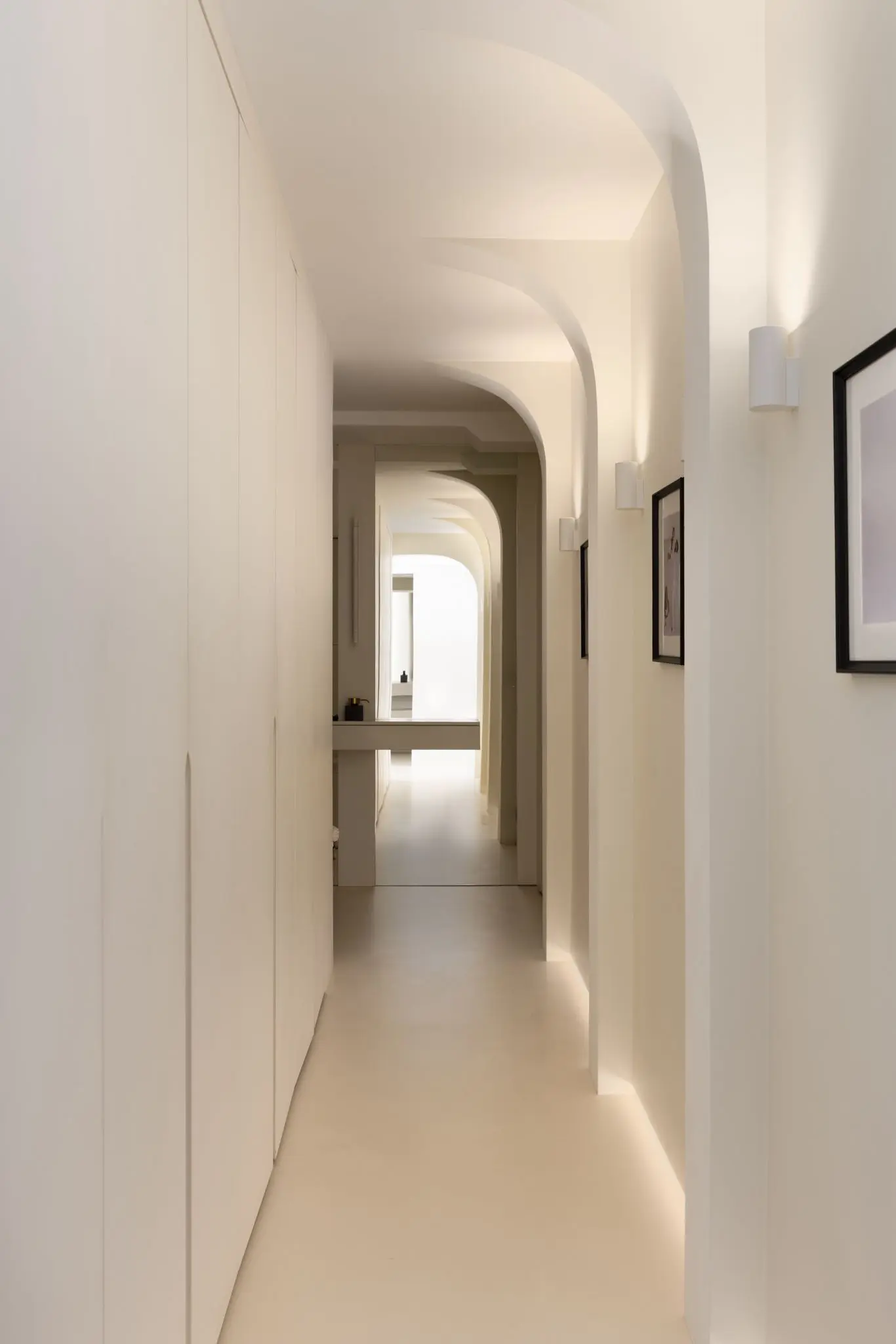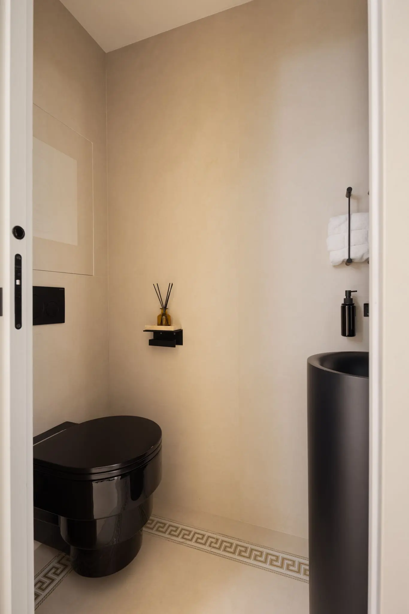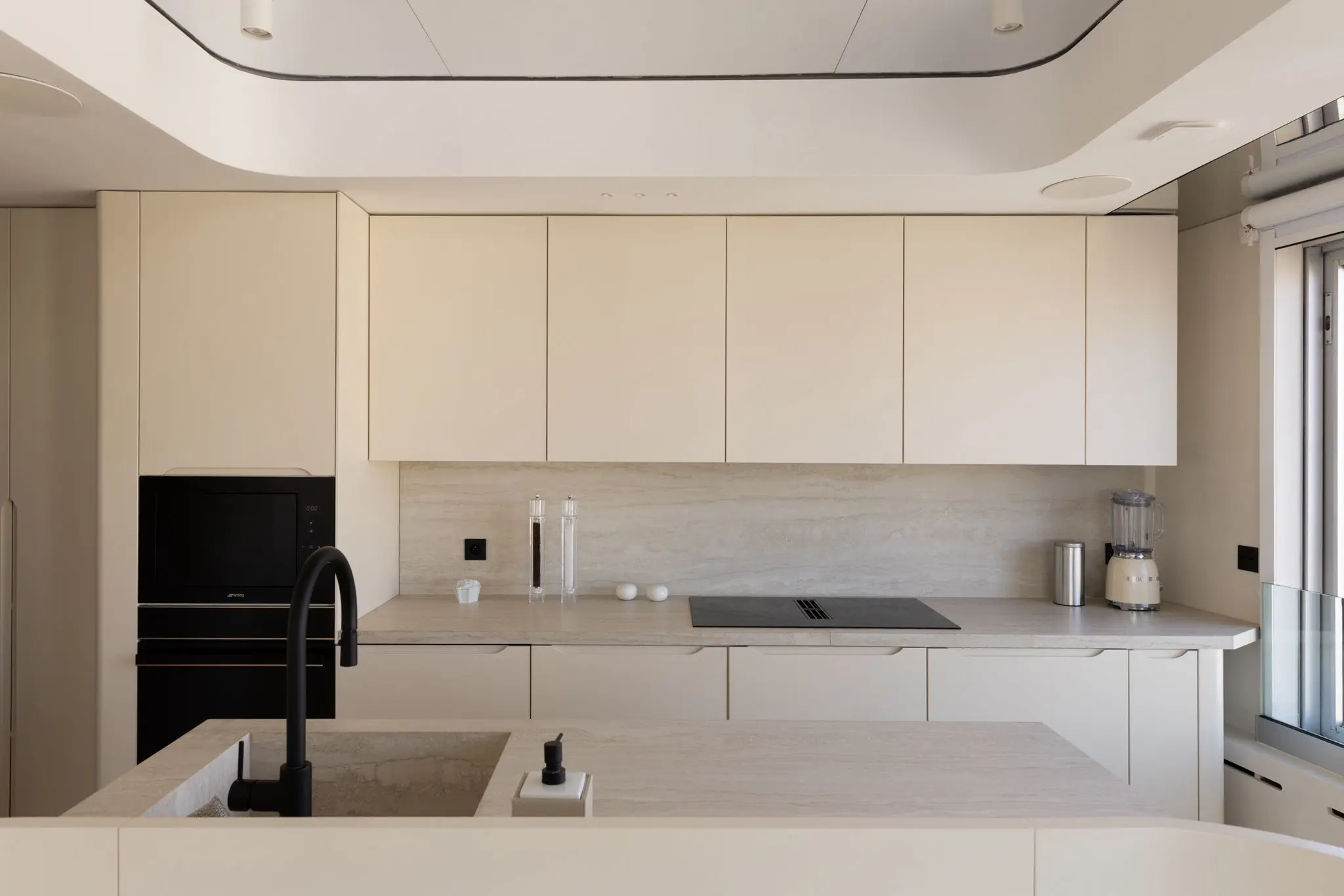 Prestations ultra haut de gamme : béton ciré, mobilier sur mesure, robinetterie Tremme, accessoires Decor Walther, WC Versace modèle trône, chaises Noom, fauteuil Poliform, système audio Sonos, éclairages Studio On, Wever & Ducré, poignées Buster & Punch, canapé du salon sur mesure en tissu Pierre Frey.