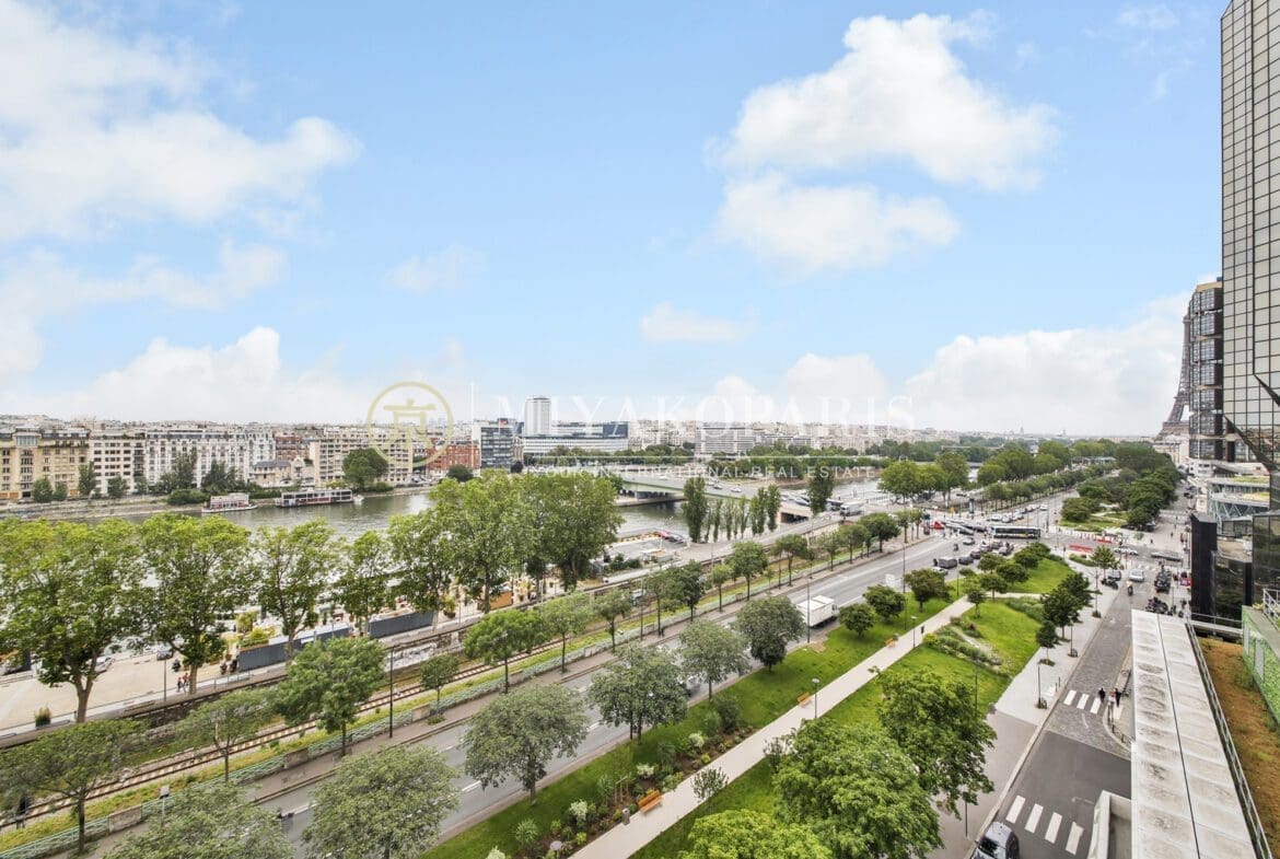 Paris XVe – Front de Seine. Dans un immeuble de bon standing et haute surveillance. Appartement d’angle offrant une vue à 180 degrés sur la Seine ainsi que la Tour Eiffel se compose comme suit: entrée, spacieux séjour (3ème chambre possible), cuisine indépendante équipée, 2 chambres, salle de bains avec WC, 1 salle de douche, WC invités. Dressing Belles prestations.