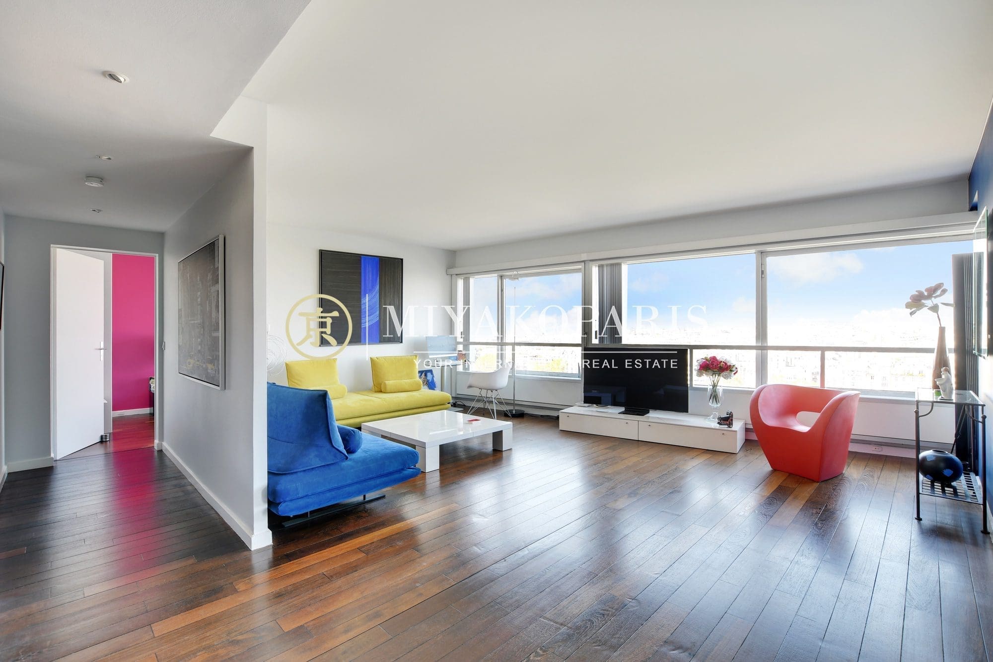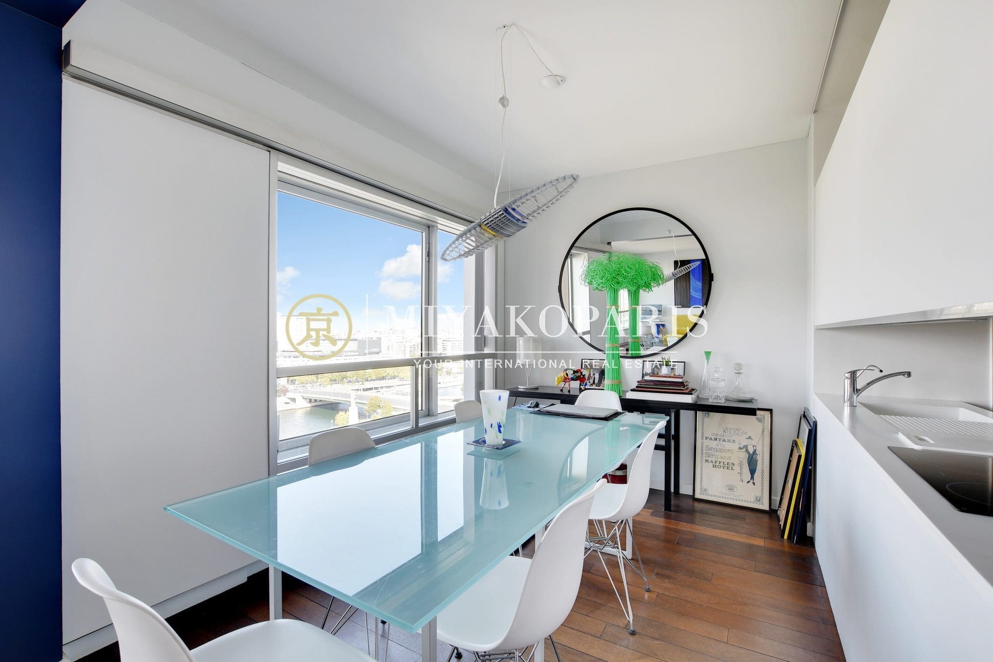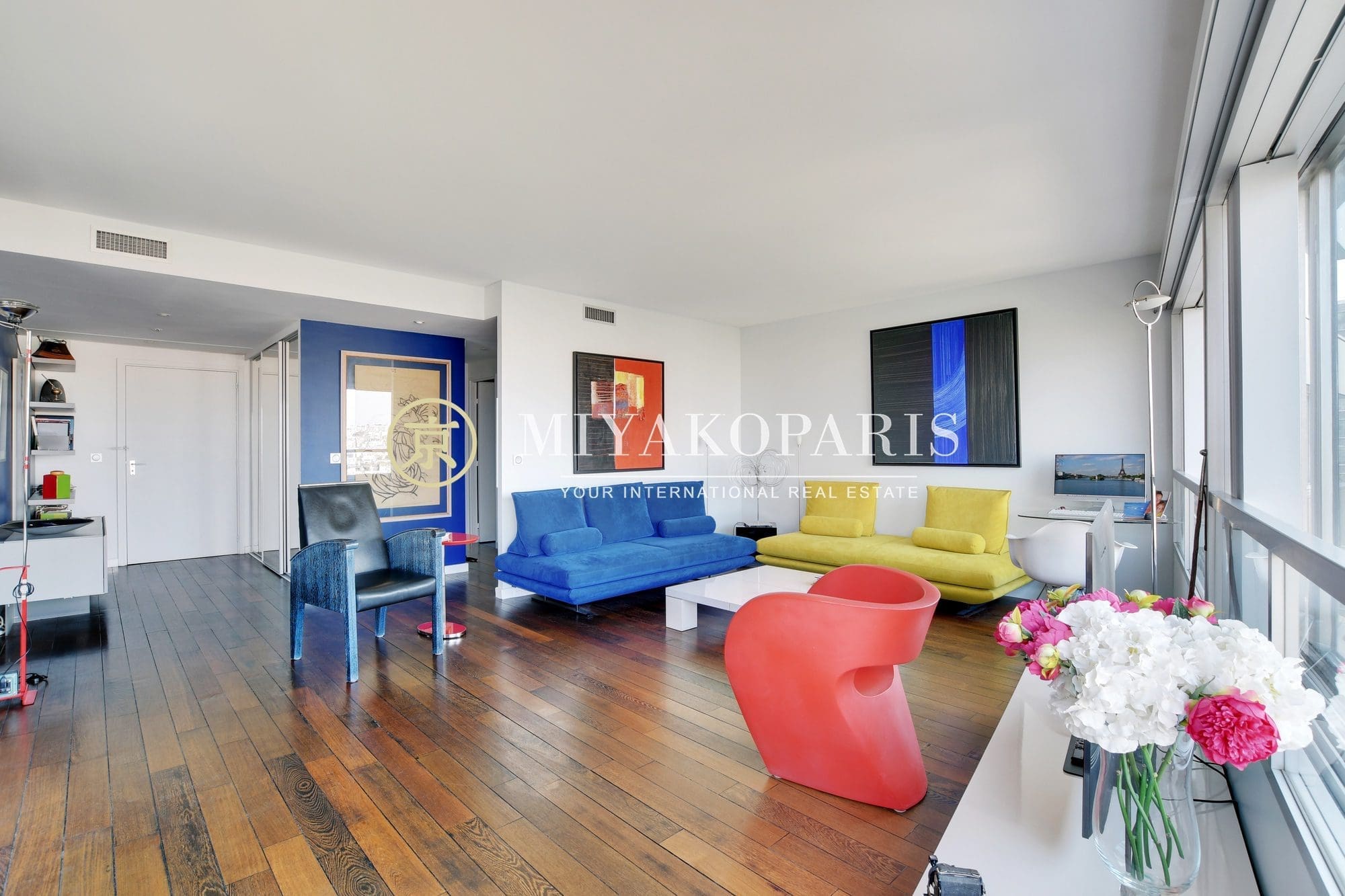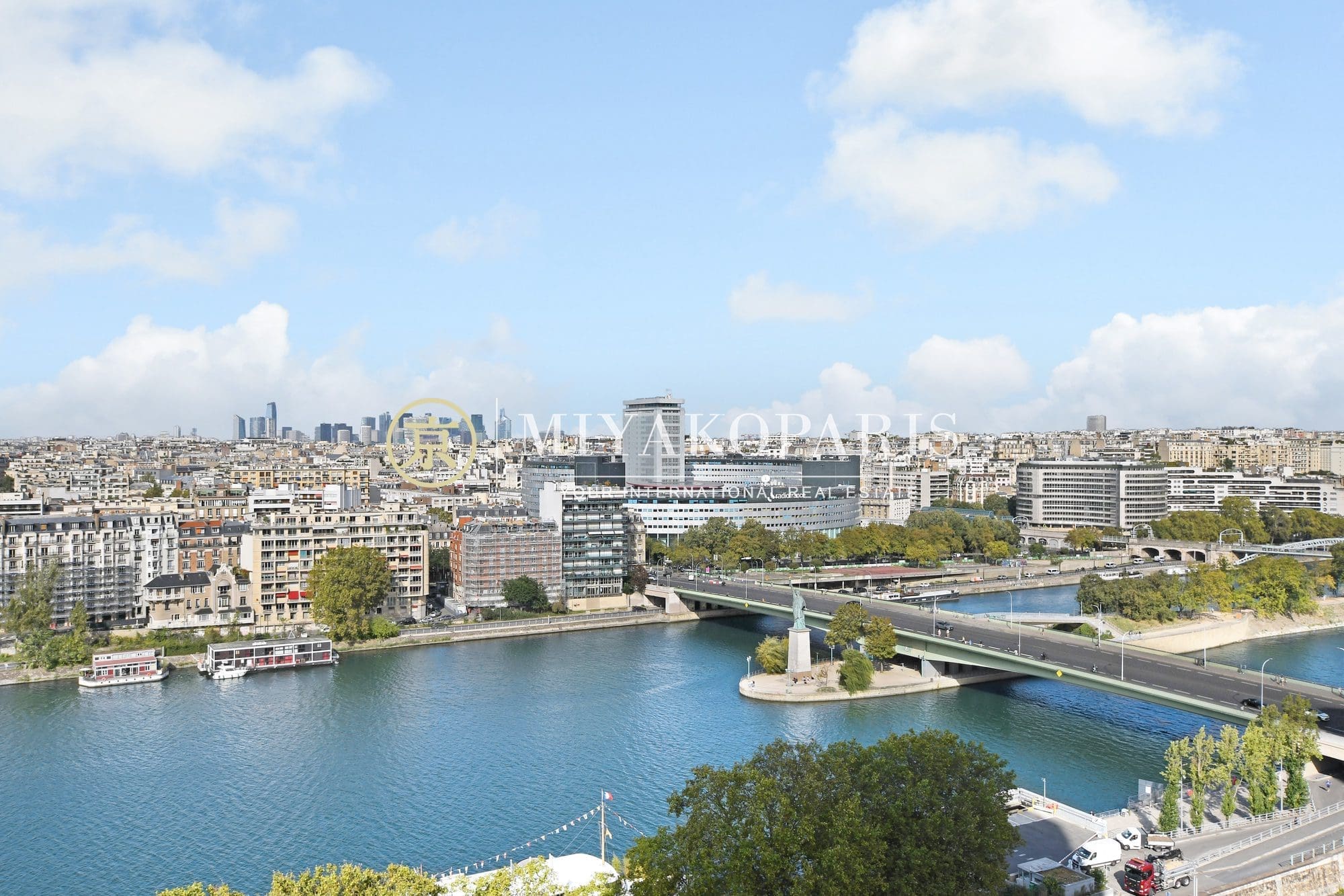 VUE PANORAMIQUE SEINE – COUP DE CŒUR ASSURÉ – Paris XVe, Front de Seine. Appartement 3 pièces de 74.82m² Loi Carrez offrant une vue en hauteur et panoramique sur la Seine, les toits de Paris, le Mont Valérien ainsi que la Statue de la Liberté composé comme suit : Entrée, séjour, cuisine indépendante équipée (US possible), 2 chambres baignées de lumière, 1 salle de douche, W.C séparés. Nombreux rangements. Matériaux de qualité. Parties communes au design haut de gamme. Rare.