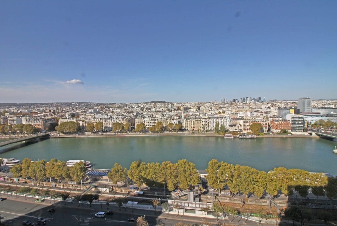Paris XVe- Front de Seine. Ce studio offrant une vue panoramique sur la Seine se compose d’une entrée, salle de bains avec WC, cuisine séparée, pièce principale , coin chambre avec portes coulissantes.