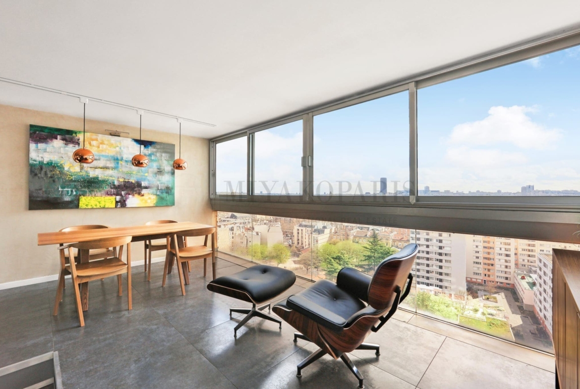 Exclusivité – Paris XVe – Appartement d’angle refait entièrement à neuf par un architecte bénéficiant d’une vue panoramique sur Paris ainsi que les Invalides se compose d’une entrée avec rangements, séjour, salle à manger, cuisine américaine baignée de lumière, 2 chambres, 1 salle de bains avec douche à l’italienne, WC séparés. Ravalement façade payé et achevé.