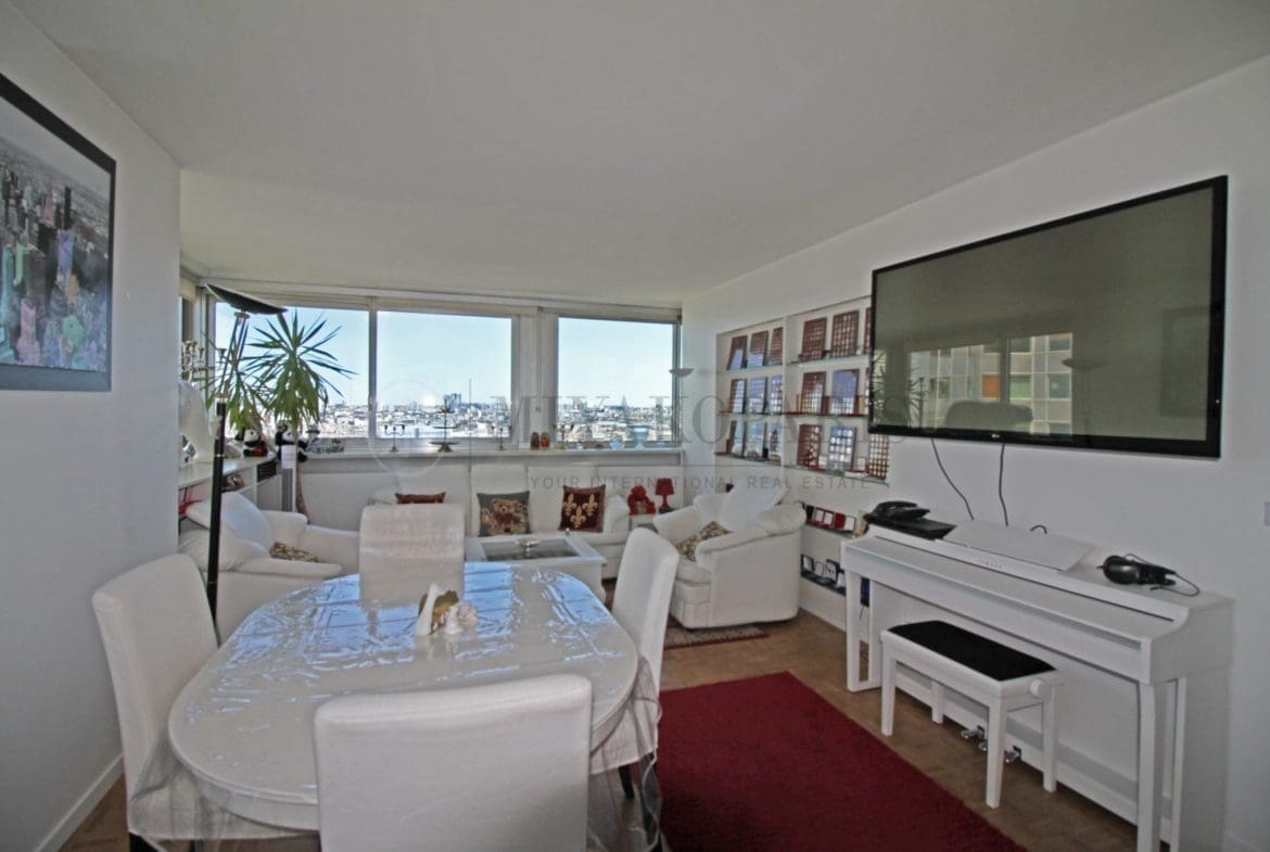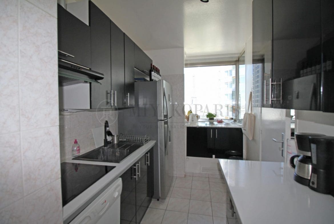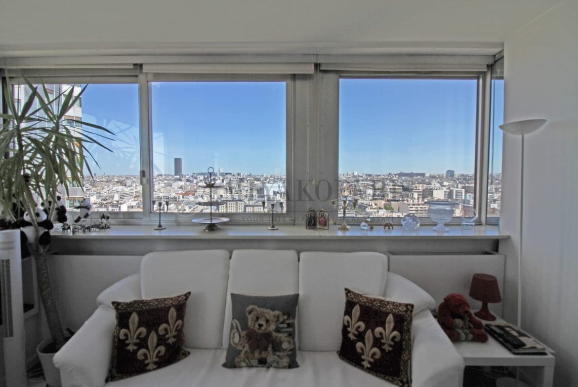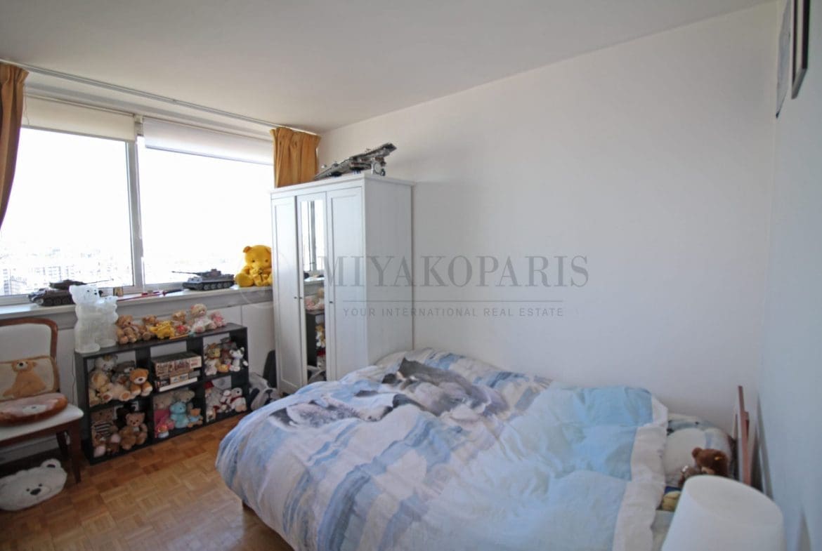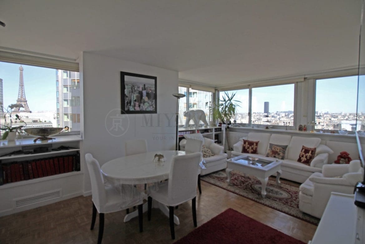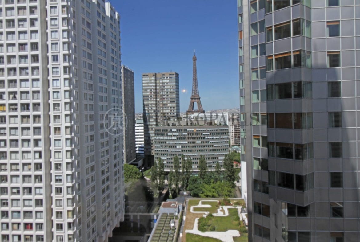 Paris XVe, Front de Seine – Cet appartement bénéficiant d’une vue dégagée sur Paris et la Tour Eiffel vous offre un séjour, cuisine séparée équipée, 3 chambres, 1 salle de bains, 1 salle de douche, 2 WC séparés, 1 débarras.