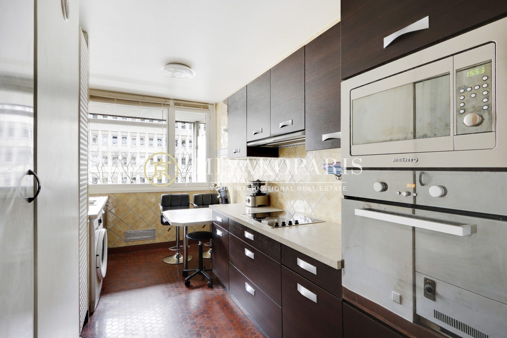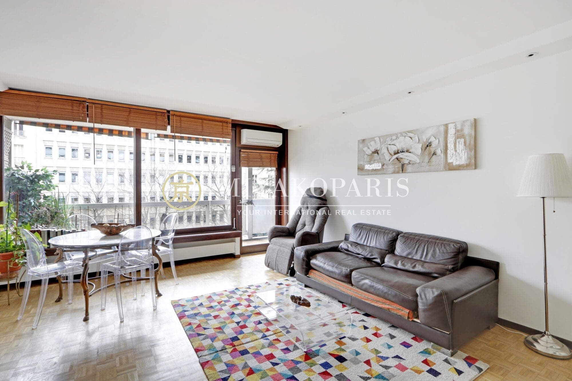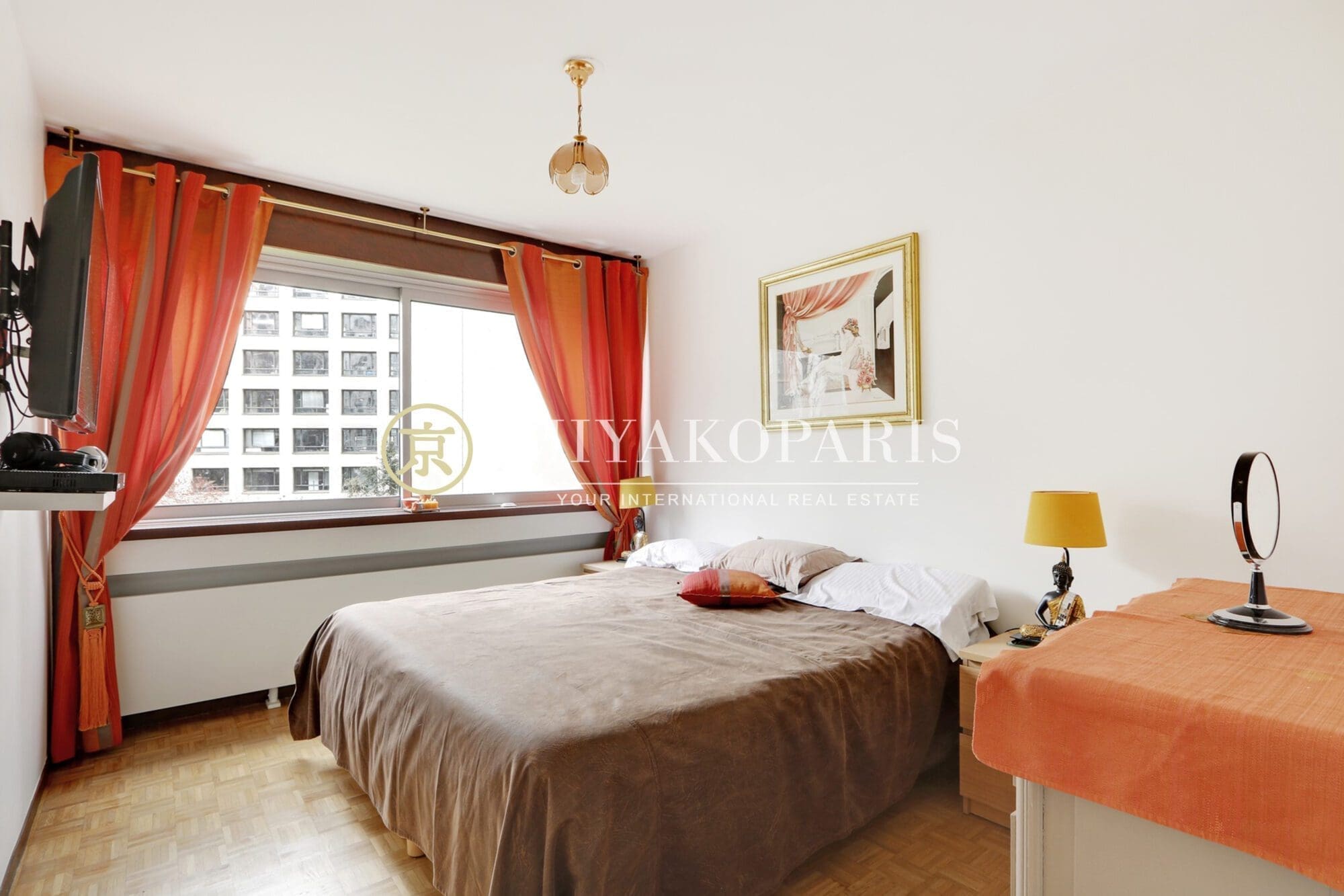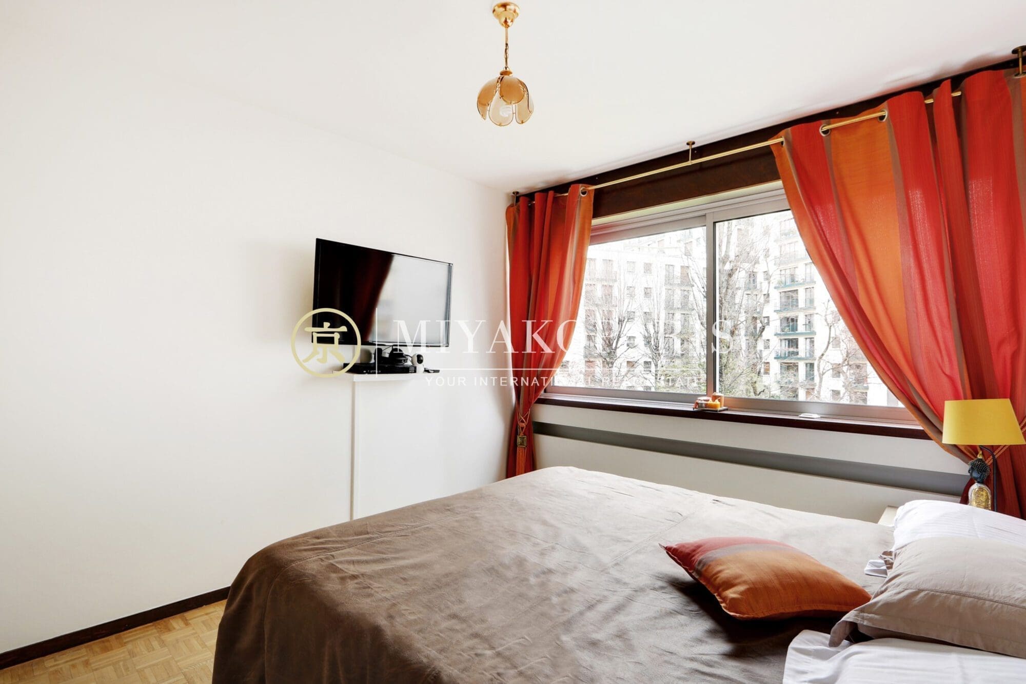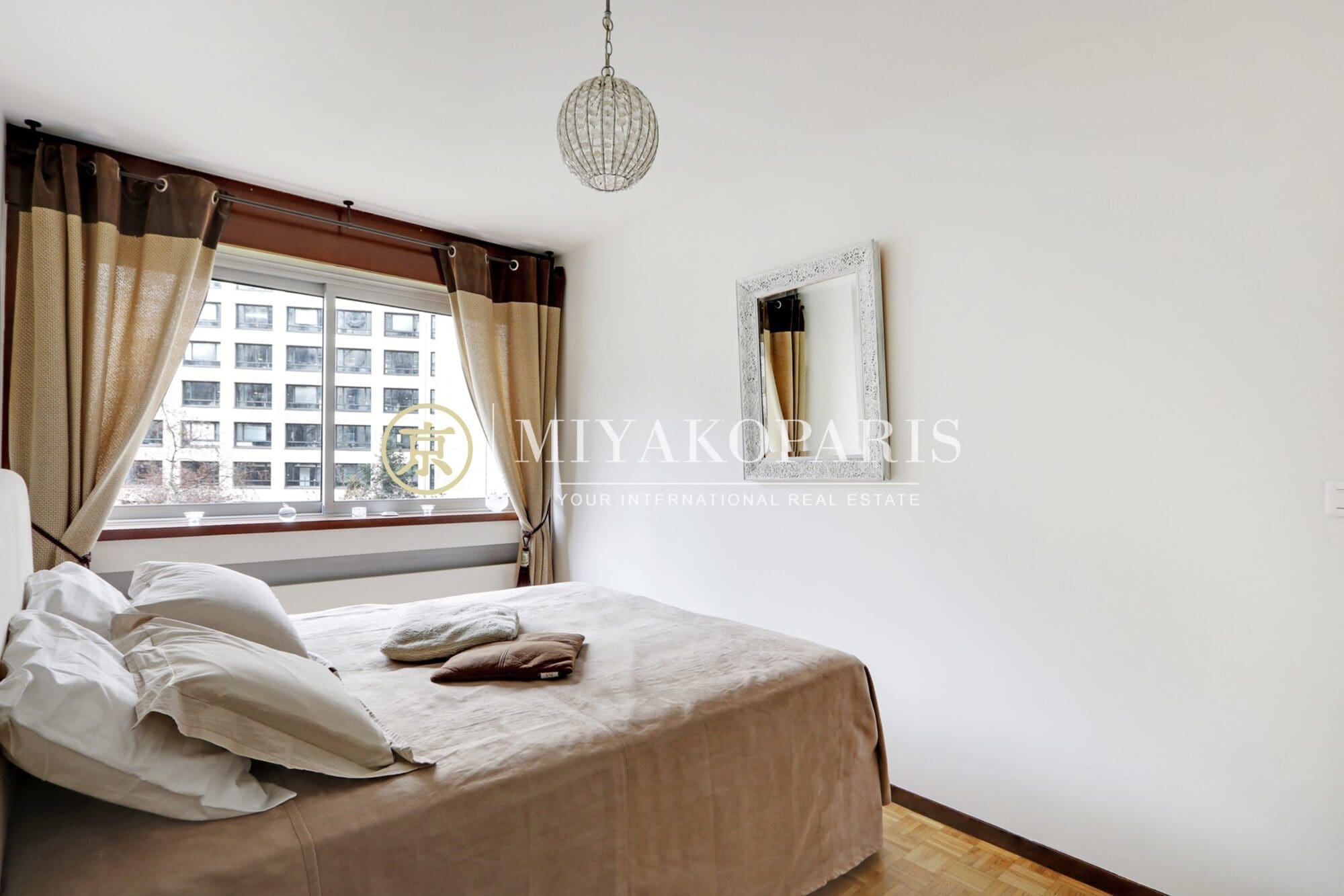 Paris XVe, Appartement 3 pièces offrant une vue sur verdure composé comme suit: Entrée, séjour donnant sur un balcon de 10 m², cuisine indépendante équipée, 2 chambres, 1 salle de douche, WC séparés. Dressing. Nombreux rangements. Parties communes moderne.