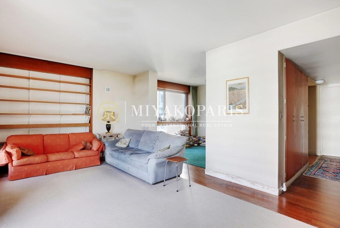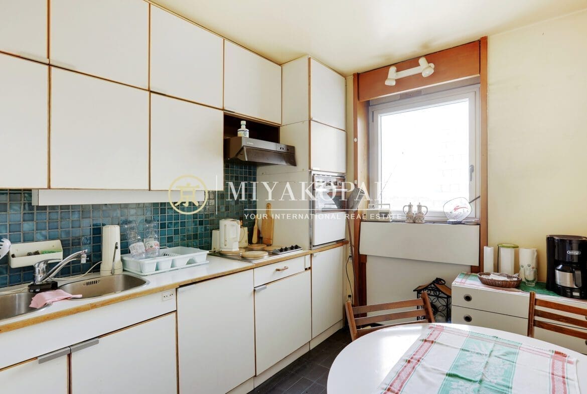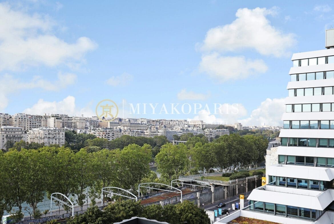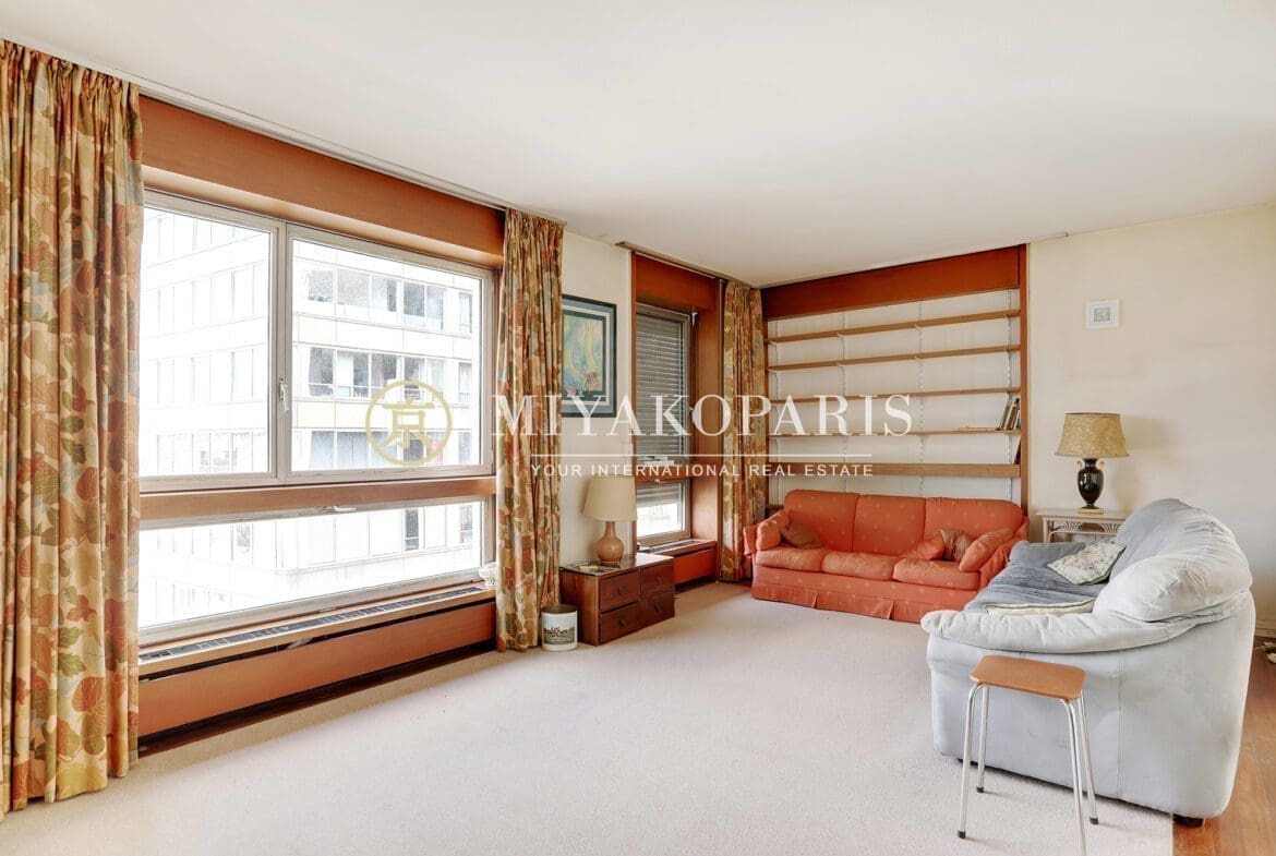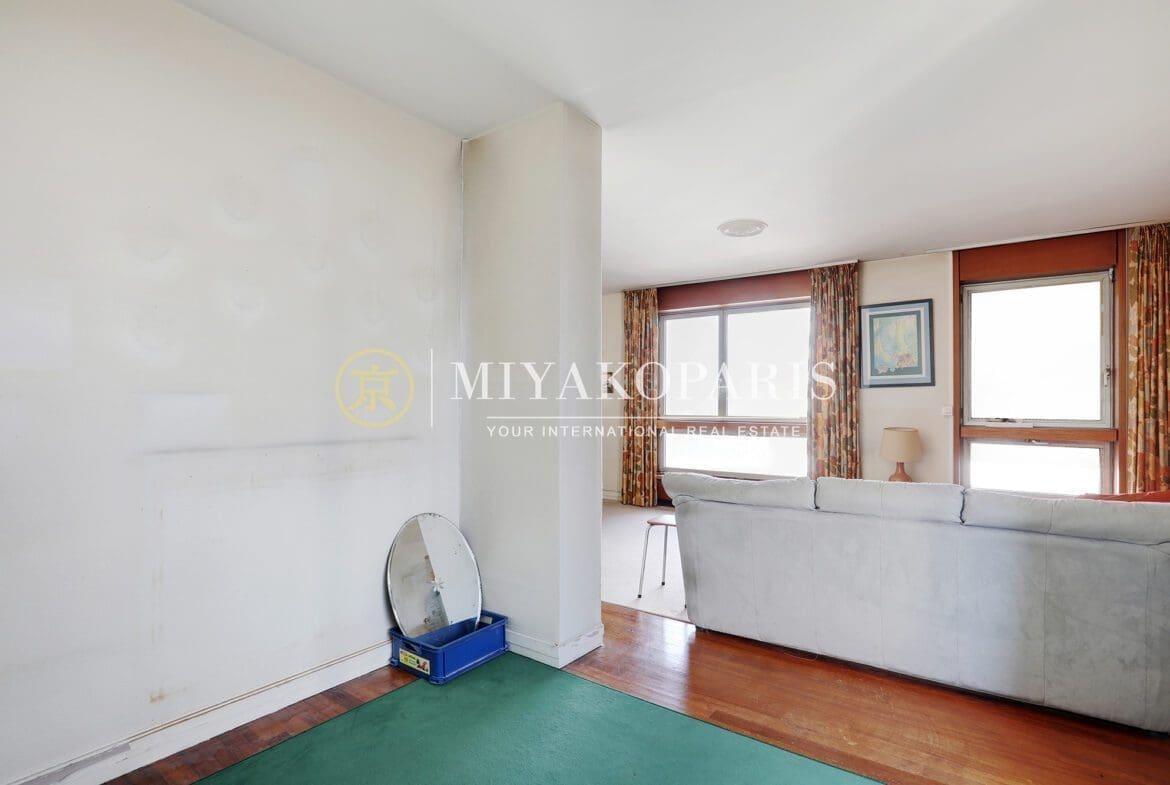 MIYAKOPARIS, L’Agence du Front de Seine ! EXCLUSIVITÉ – Paris XVe – Dans un immeuble de bon standing et haute surveillance, en hauteur. Appartement d’angle à rénover de 70,42m² Loi Carrez offrant une vue partielle sur la Seine ainsi que la Tour Eiffel se compose : entrée, double séjour (2ème chambre possible), cuisine indépendante équipée (US possible), 1 chambre, 1 salle de bains, WC invités. Belles prestations.