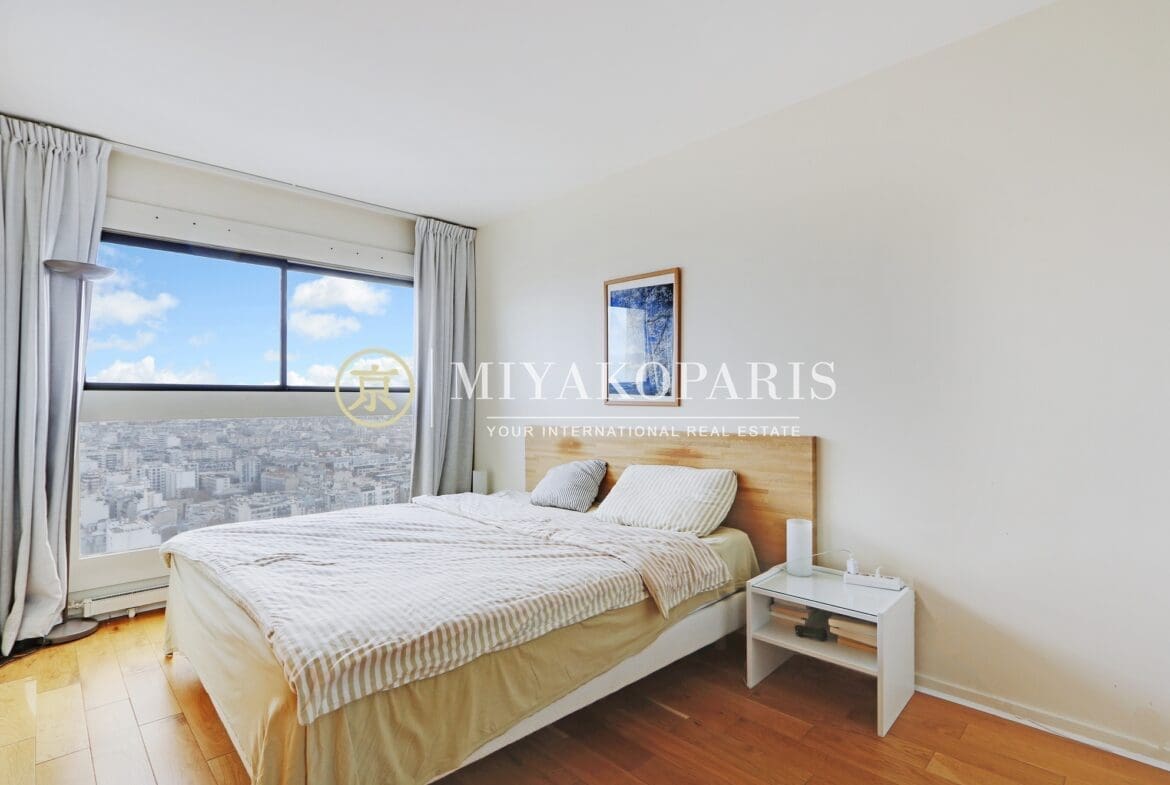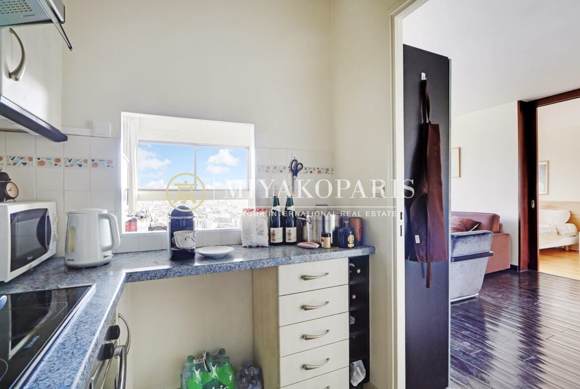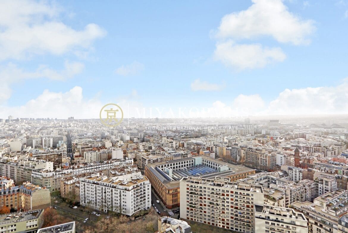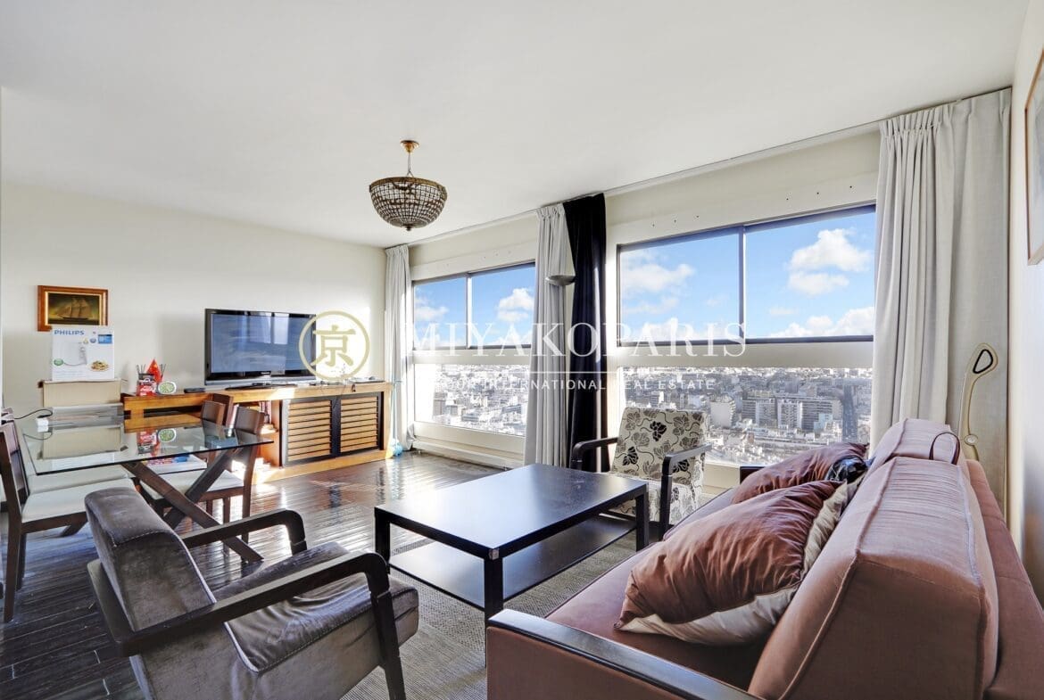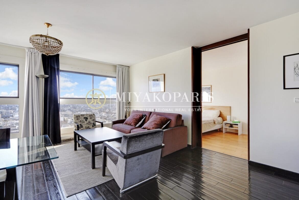 MIYAKOPARIS, L’Agence du Front de Seine ! Exclusivité – Paris XVe – Appartement 2 pièces de 51,34m² Loi Carrez bénéficiant d’une vue aérienne sur Paris / Monuments se compose: entrée, salon, cuisine semi-ouverte entièrement aménagée et équipée, 1 chambre, 1 salle de bains, WC séparés. Calme absolu.