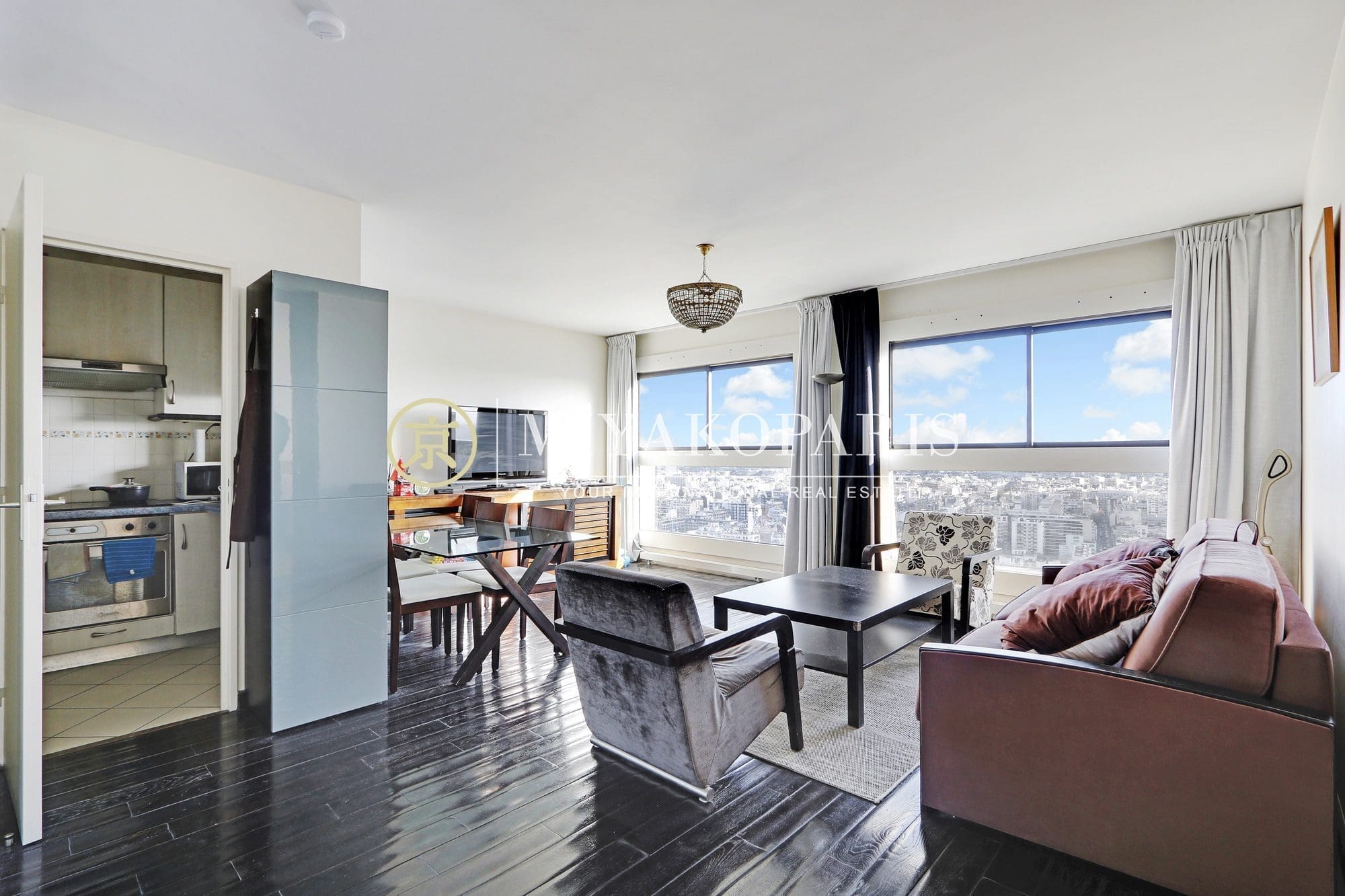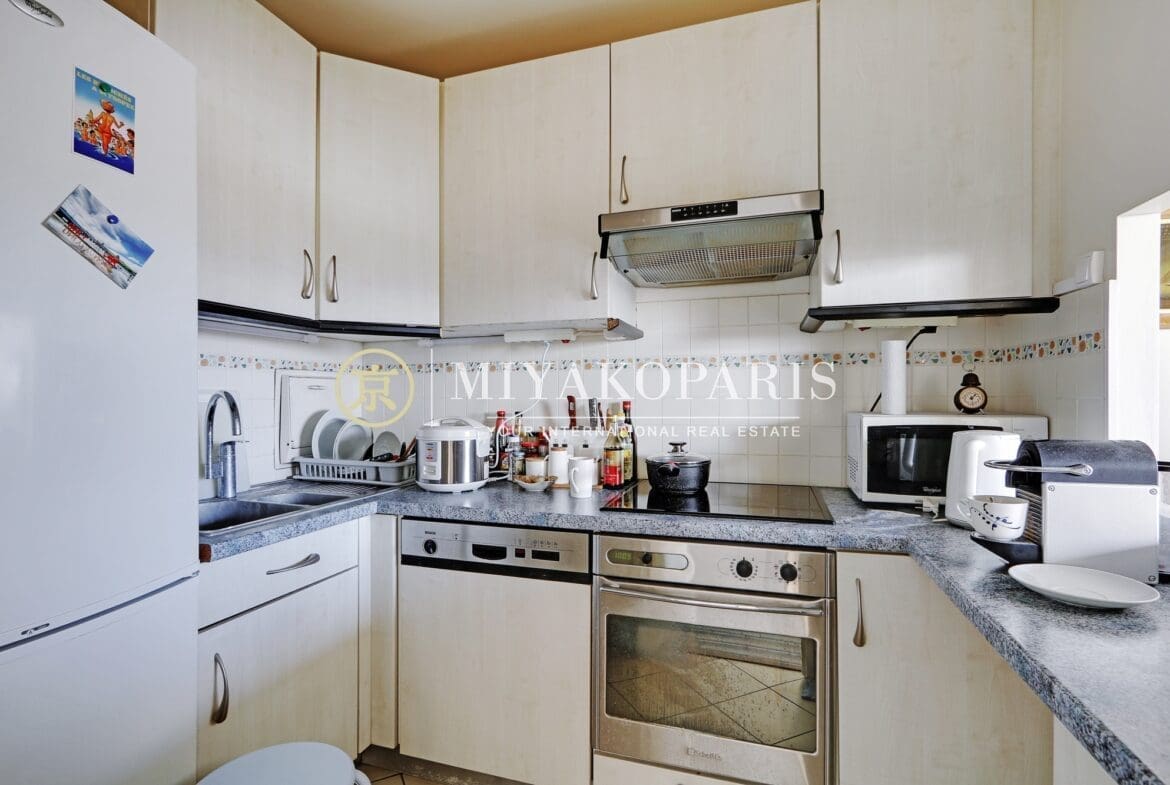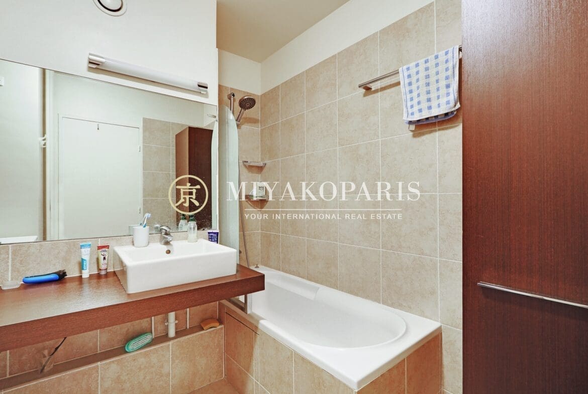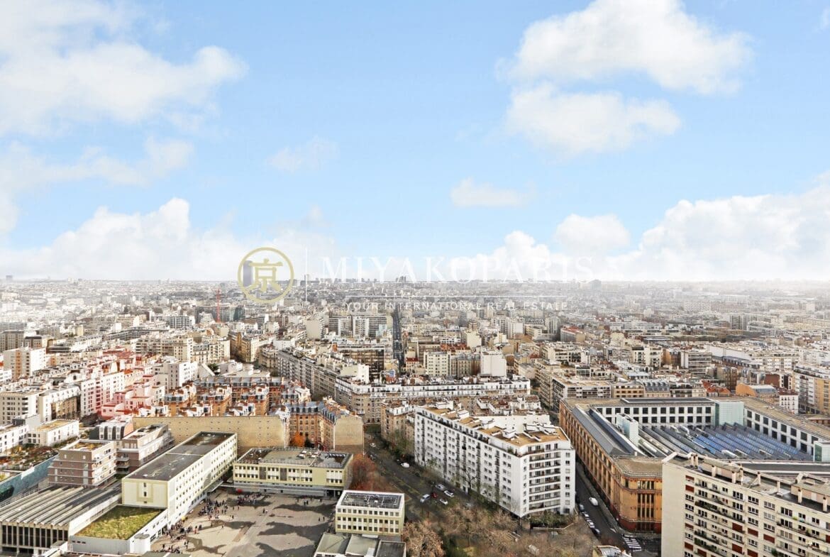 MIYAKOPARIS, L’Agence du Front de Seine ! Exclusivité – Paris XVe – Appartement 2 pièces de 51,34m² Loi Carrez bénéficiant d’une vue aérienne sur Paris / Monuments se compose: entrée, salon, cuisine semi-ouverte entièrement aménagée et équipée, 1 chambre, 1 salle de bains, WC séparés. Calme absolu.