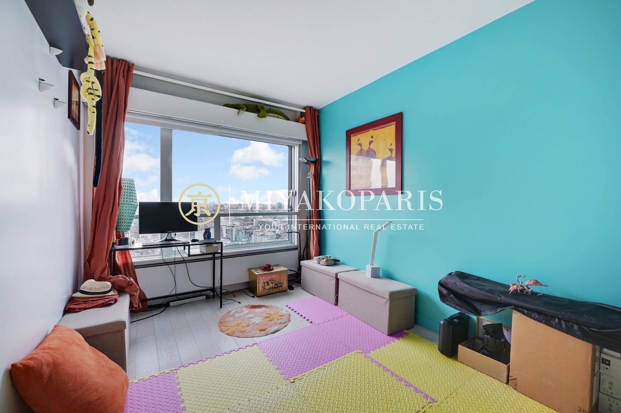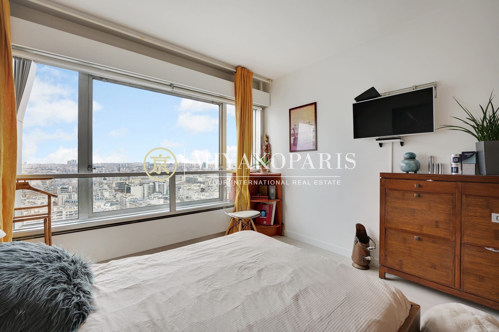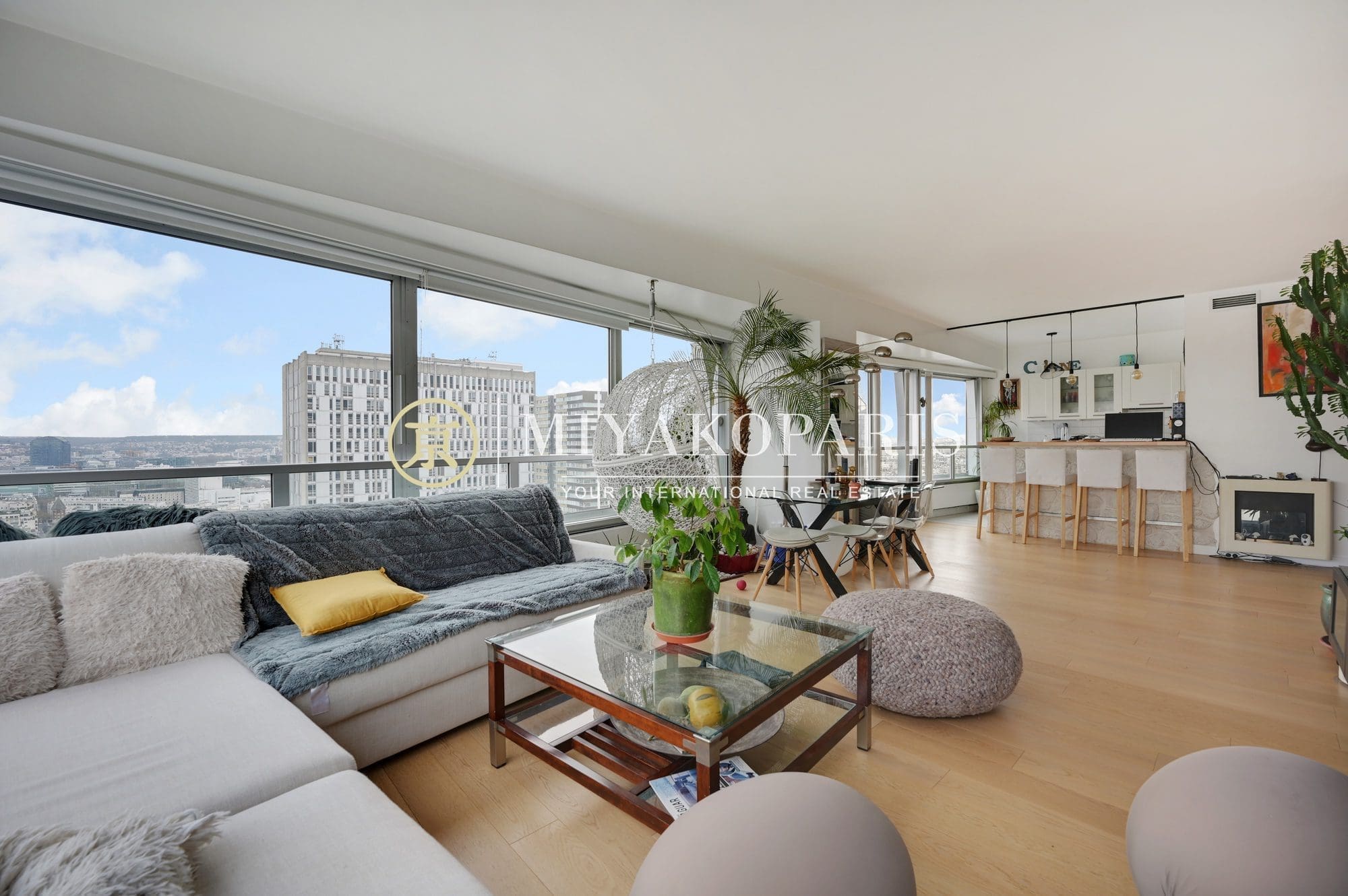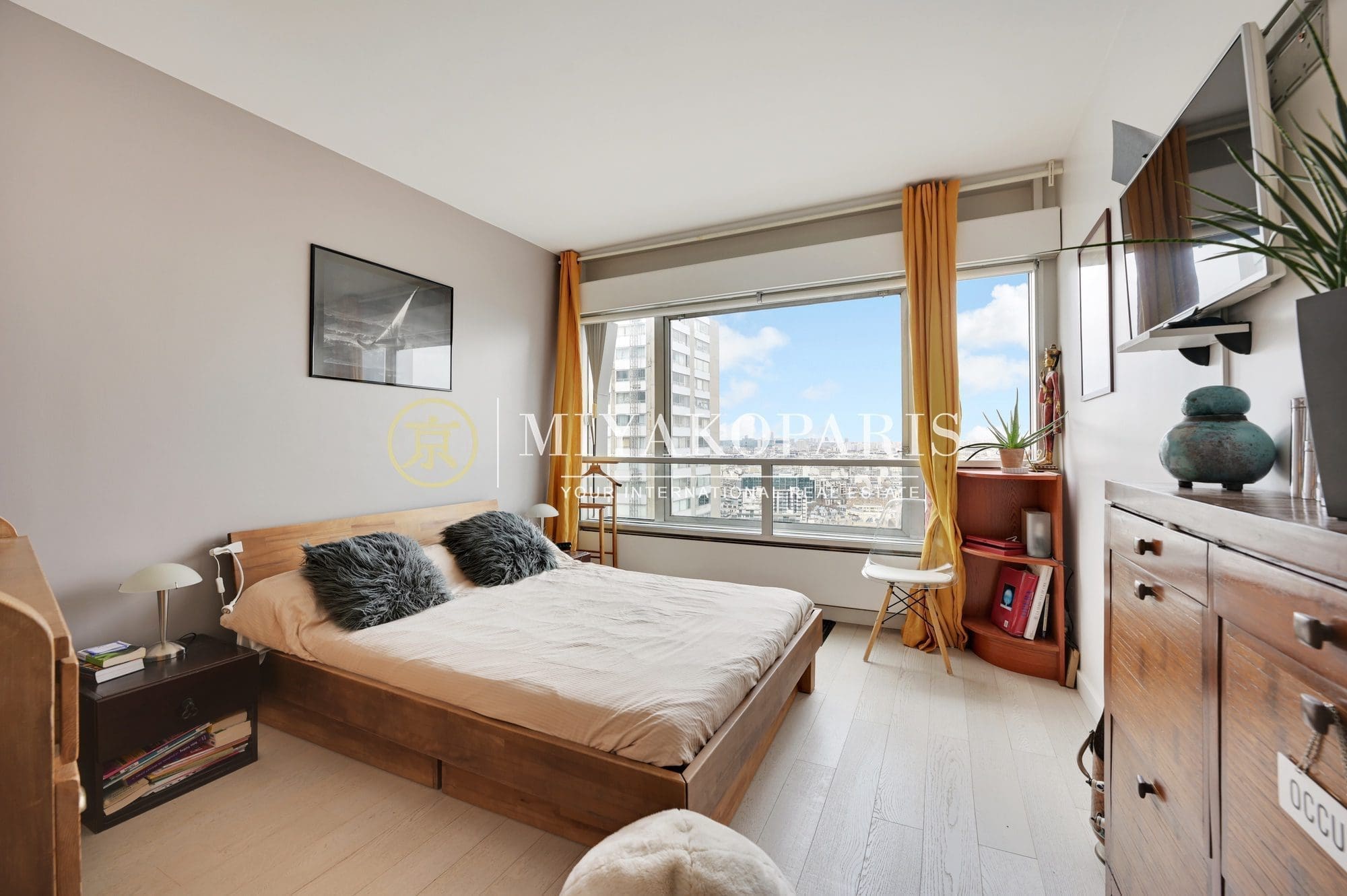 VUE DOMINANTE ET D’ANGLE l COUP DE COEUR l Paris XVe – Dans un immeuble de bon standing et haute surveillance, étage élevé. Appartement climatisé d’angle de 106,89m² Loi Carrez refait à neuf offrant une vue aérienne à 180 degrés sur les toits de Paris ainsi que la Seine se compose comme suit: entrée, spacieux séjour, cuisine américaine entièrement équipée, 3 chambres, 1 salle de bains, 1 salle de douche, WC invités. Belles prestations.