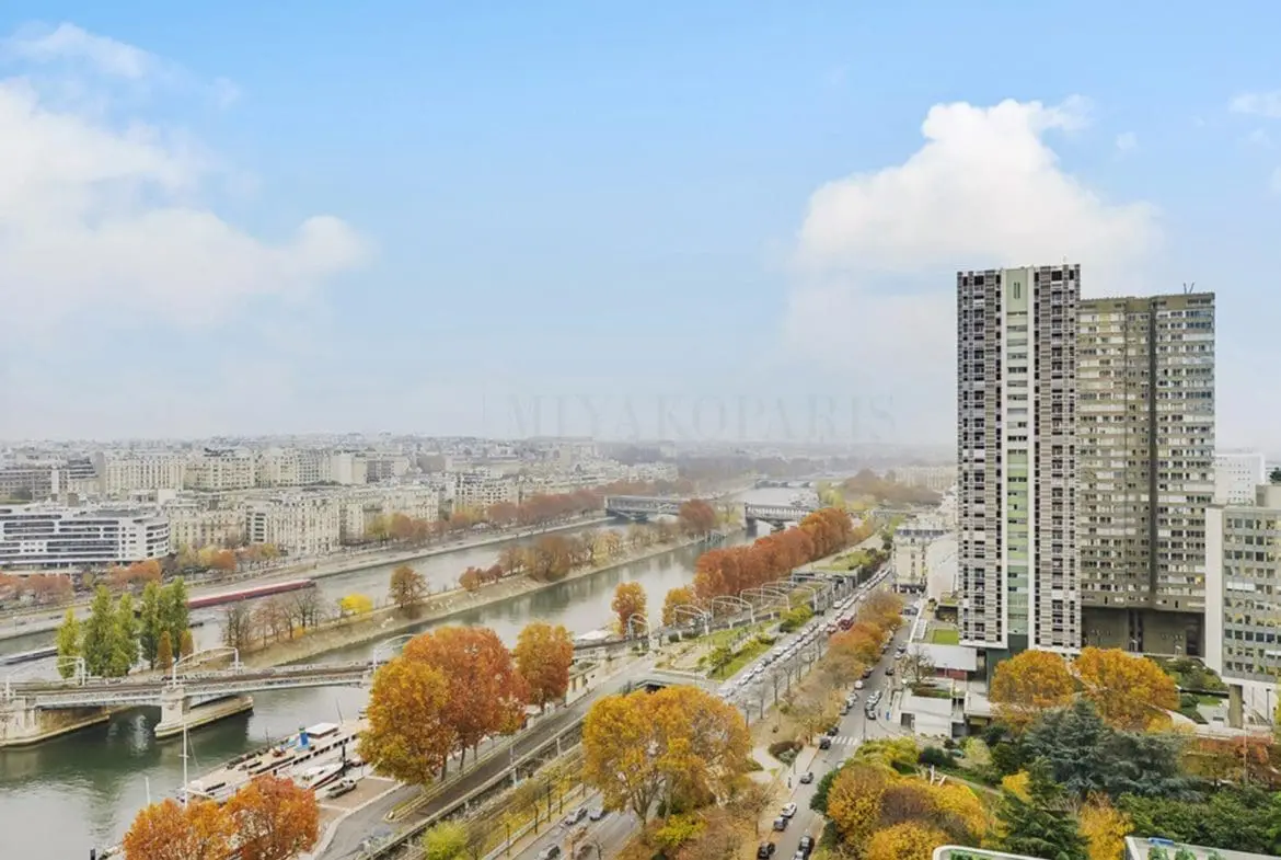 MIYAKOPARIS, L’Agence du Front de Seine – Exclusivité – Paris XVe – Front de Seine, venez découvrir ce spacieux 4 pièces offrant une vue en hauteur sur la Seine composé comme suit : entrée, double séjour d’angle, cuisine américaine, 3 chambres, 1 salle de bains avec WC, 1 salle de douche avec WC.