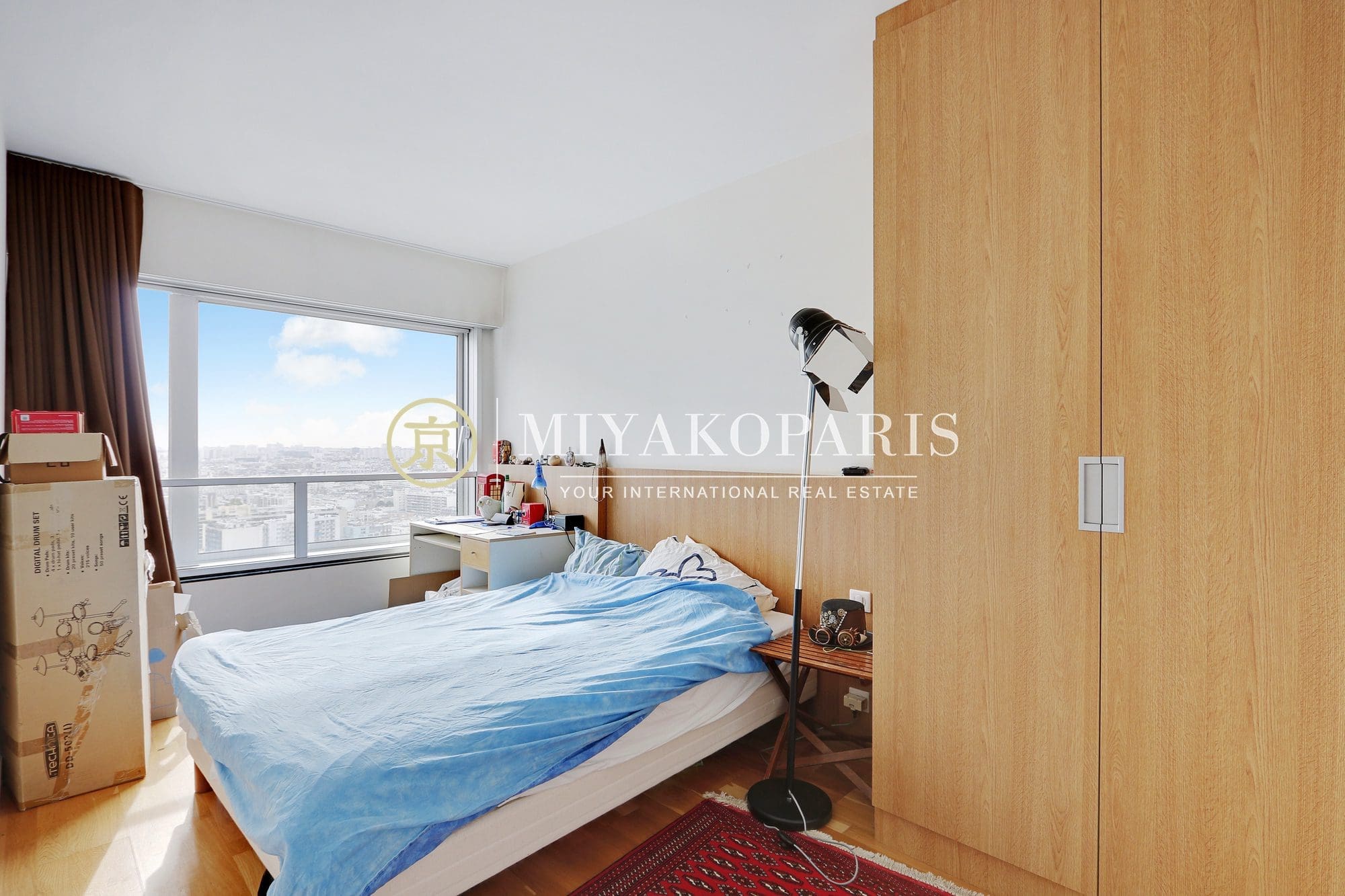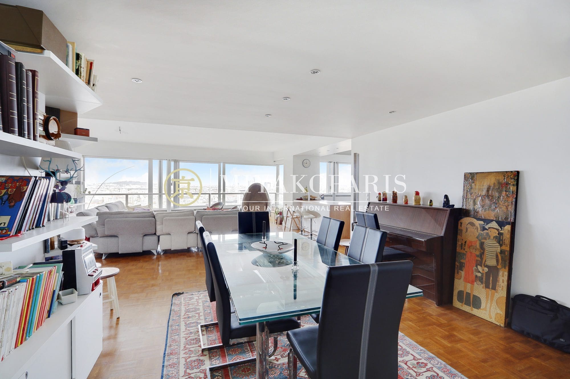 VUE PANORAMIQUE ET AÉRIENNE l Paris XVe, Beaugrenelle. Spectaculaire appartement traversant de 153.87m2 Loi Carrez en étage très élevé d’une résidence de bon standing et haute surveillance se compose comme suit : entrée, immense double séjour offrant une vue panoramique et dominante sur la Seine, les toits de Paris, le Mont Valérien et La Défense, cuisine américaine équipée.