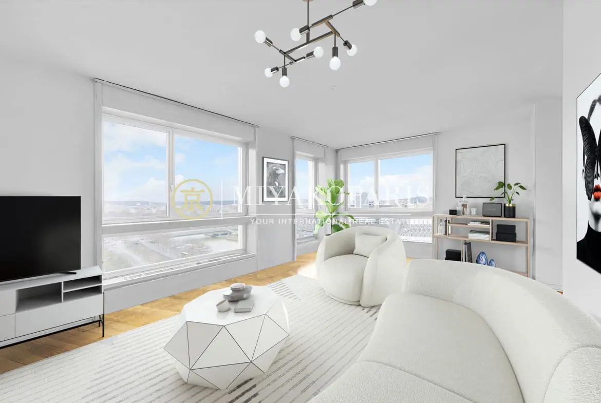 Venez découvrir cet appartement 5 pièces de 93,80m² Loi Carrez offrant une vue baignée sur la Seine, les toits de Paris, le Mont Valérien et La Défensese compose : entrée, triple séjour d’angle (3ème chambre possible), cuisine indépendante équipée (US possible), 2 chambres offrant des vues dégagées sur le paysage parisien, 1 salle de bains, 1 salle de douche, WC séparés. Nombreux rangements. Belles prestations.
