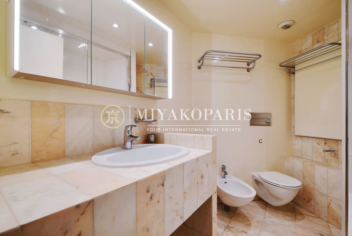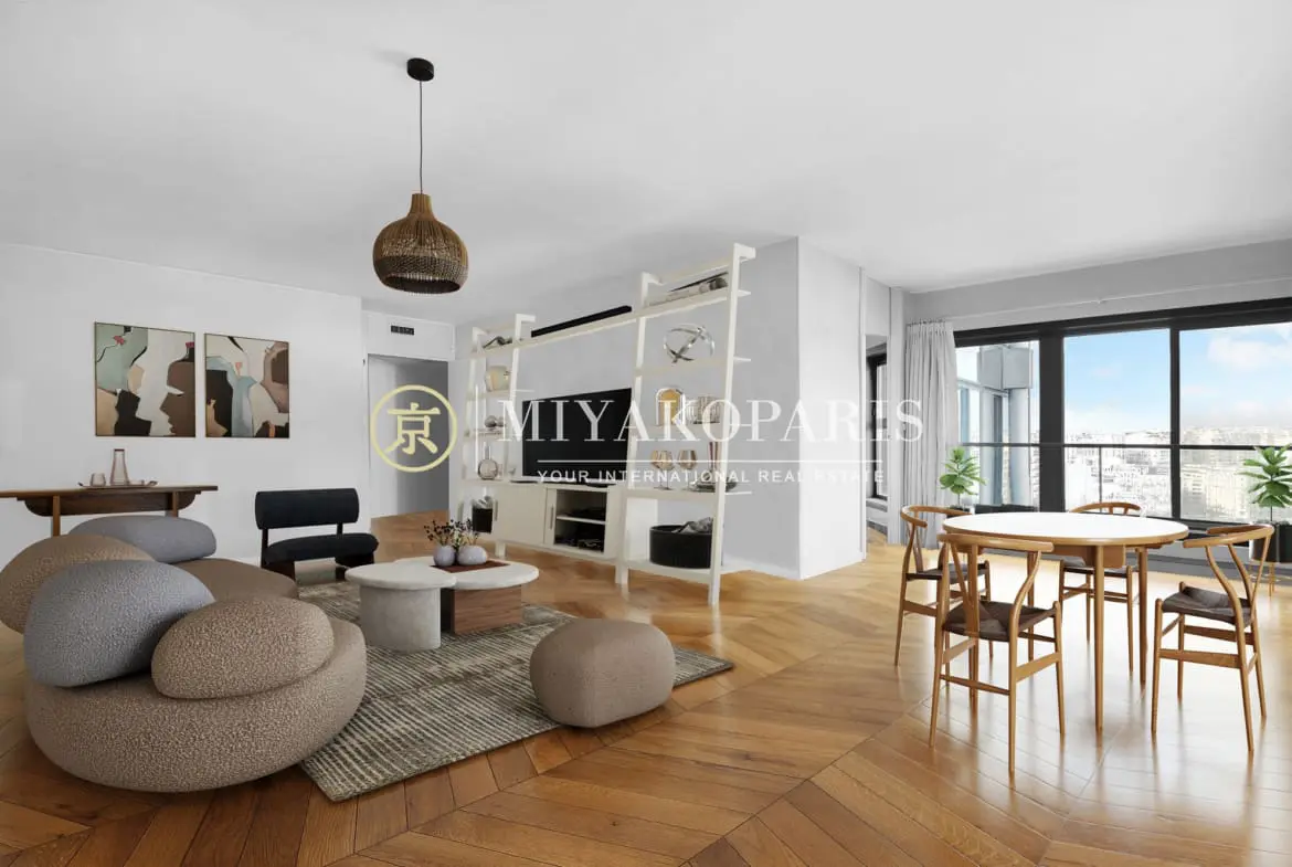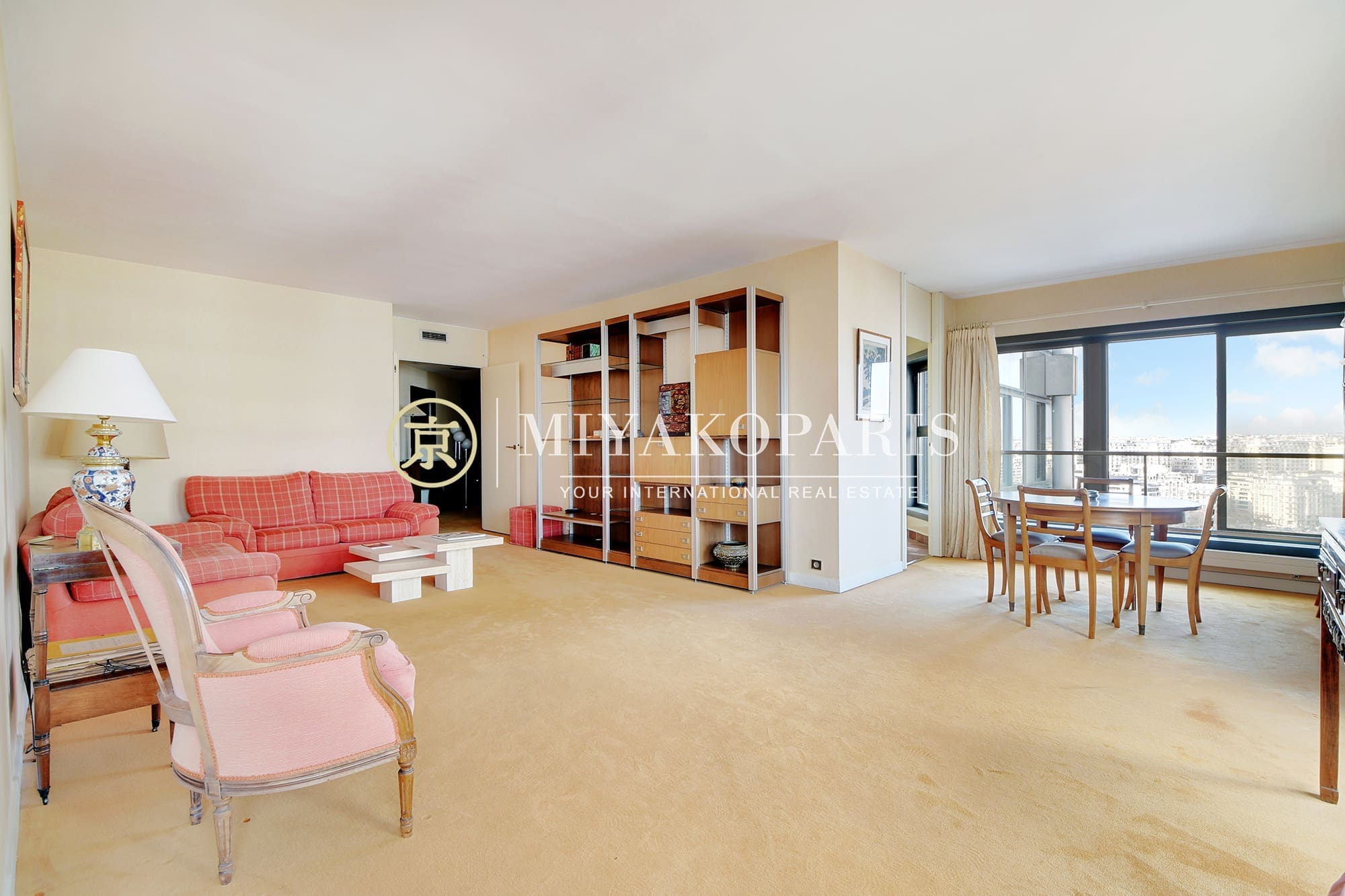 Tour TOTEM – VUE SEINE – Paris XVe – Front de Seine. Dans un immeuble de haute surveillance, étage élevé. Appartement de 106,29m² Loi Carrez offrant une vue sur la Seine et le paysage parisien se compose comme suit: entrée, double séjour baigné de lumière naturelle, cuisine indépendante équipée (US possible), 2 chambres dont 1 avec sa salle de bains en marbre d’origine, WC invités. Belles prestations. Rare.