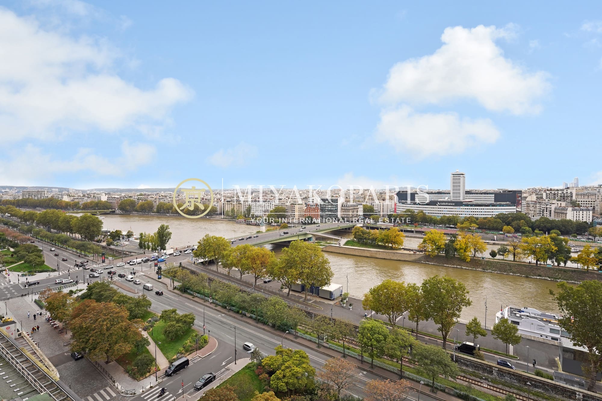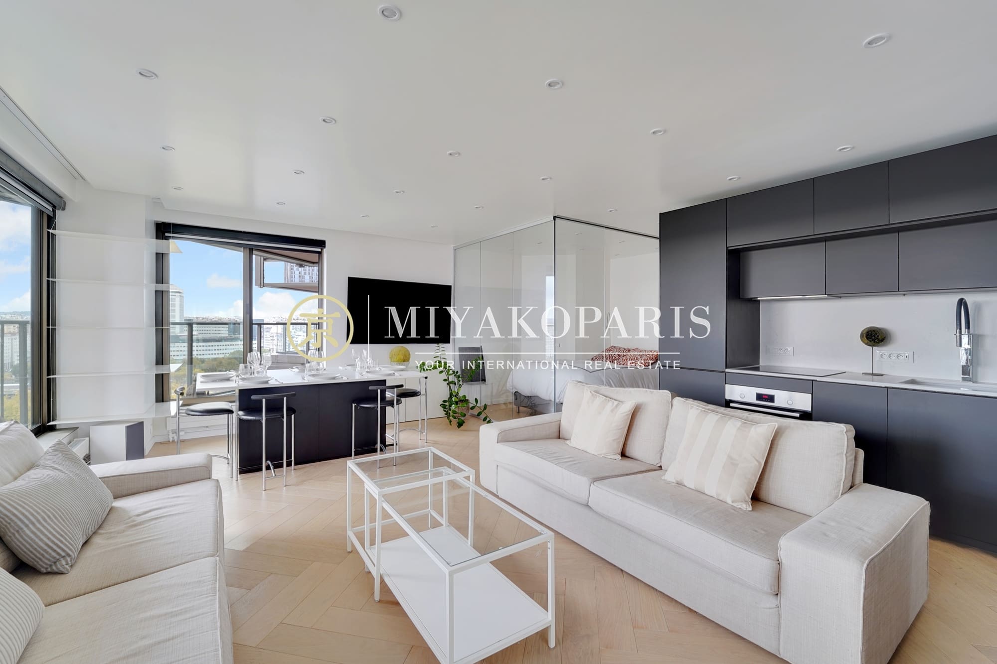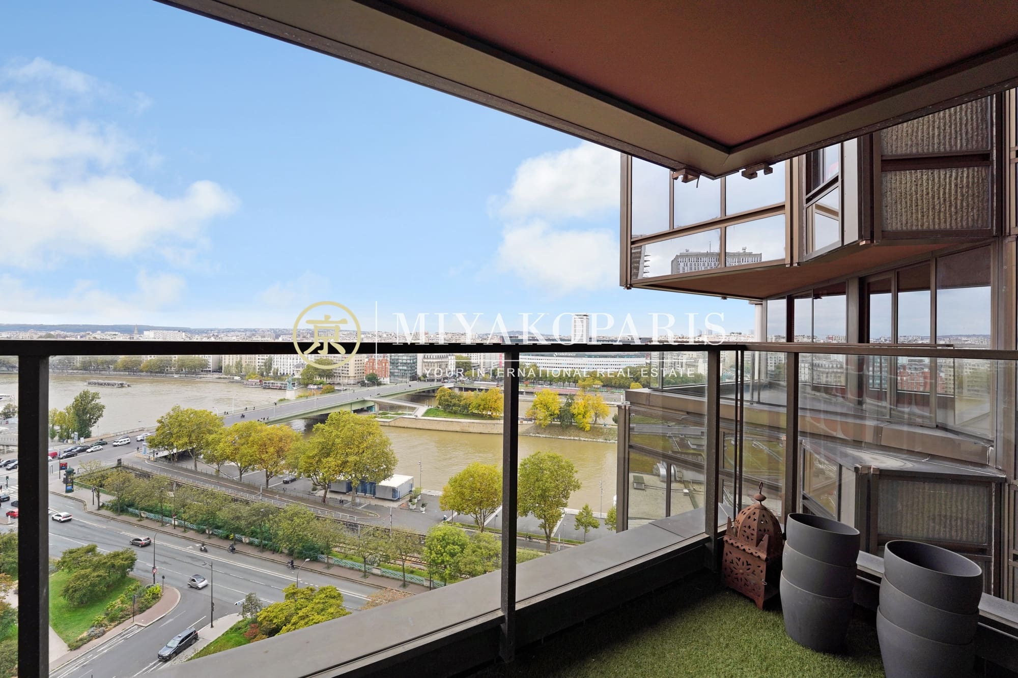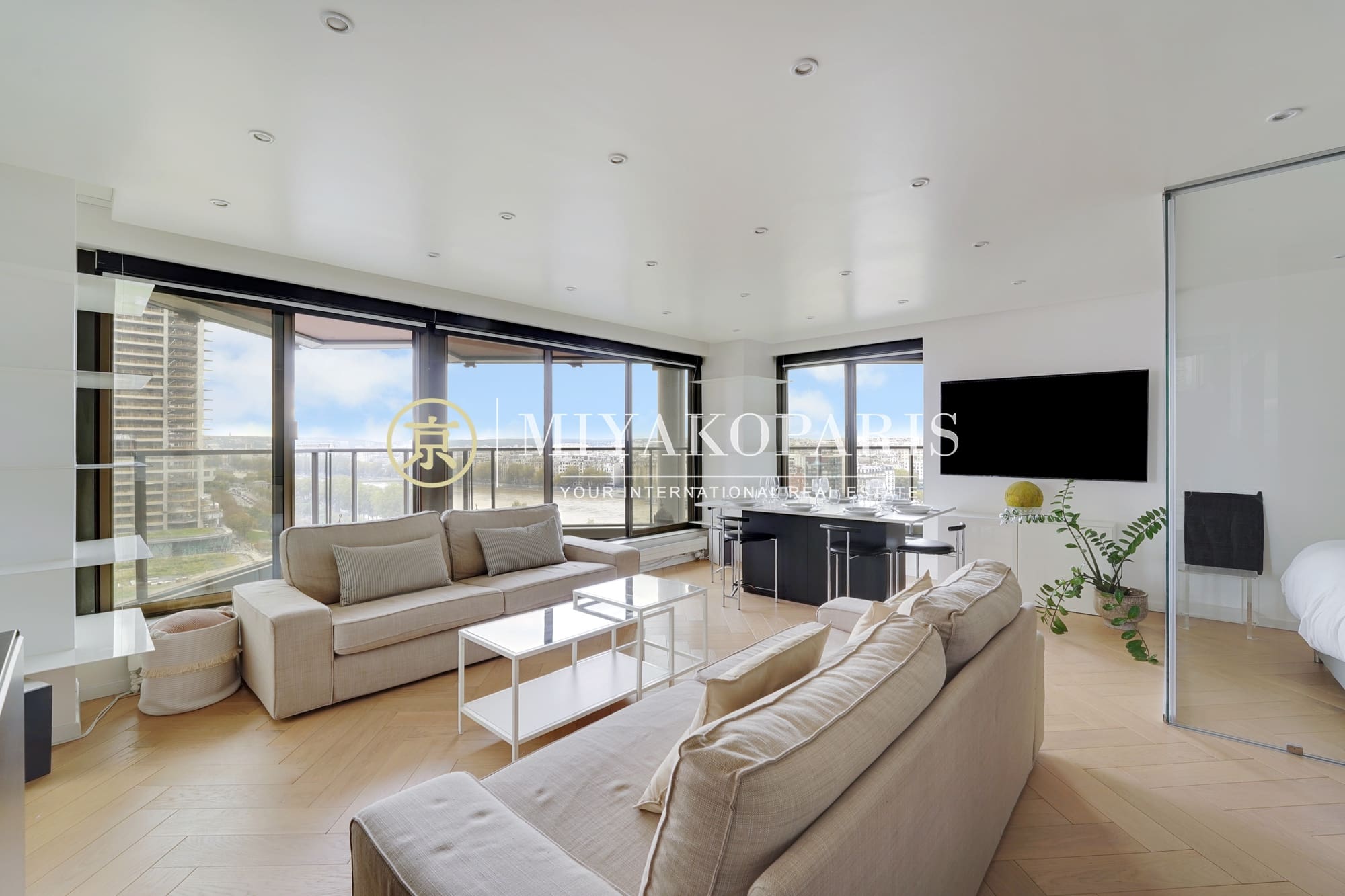 Tour TOTEM – Exclusivité – Paris XVe, Front de Seine – Situé dans la Tour la plus prisée, cet appartement refait entièrement à neuf bénéficiant d’une vue sur la Seine, les toits de Paris, ainsi que la Statue de la Liberté se compose d’une entrée, séjour baigné de lumière naturelle, coin nuit, cuisine US entièrement aménagée et équipée, 1 salle de douche avec douche à l’italienne, WC séparé. 3 balcons de 12m2 au total. Rare. Prestations réalisées avec des matériaux haut-de-gamme.