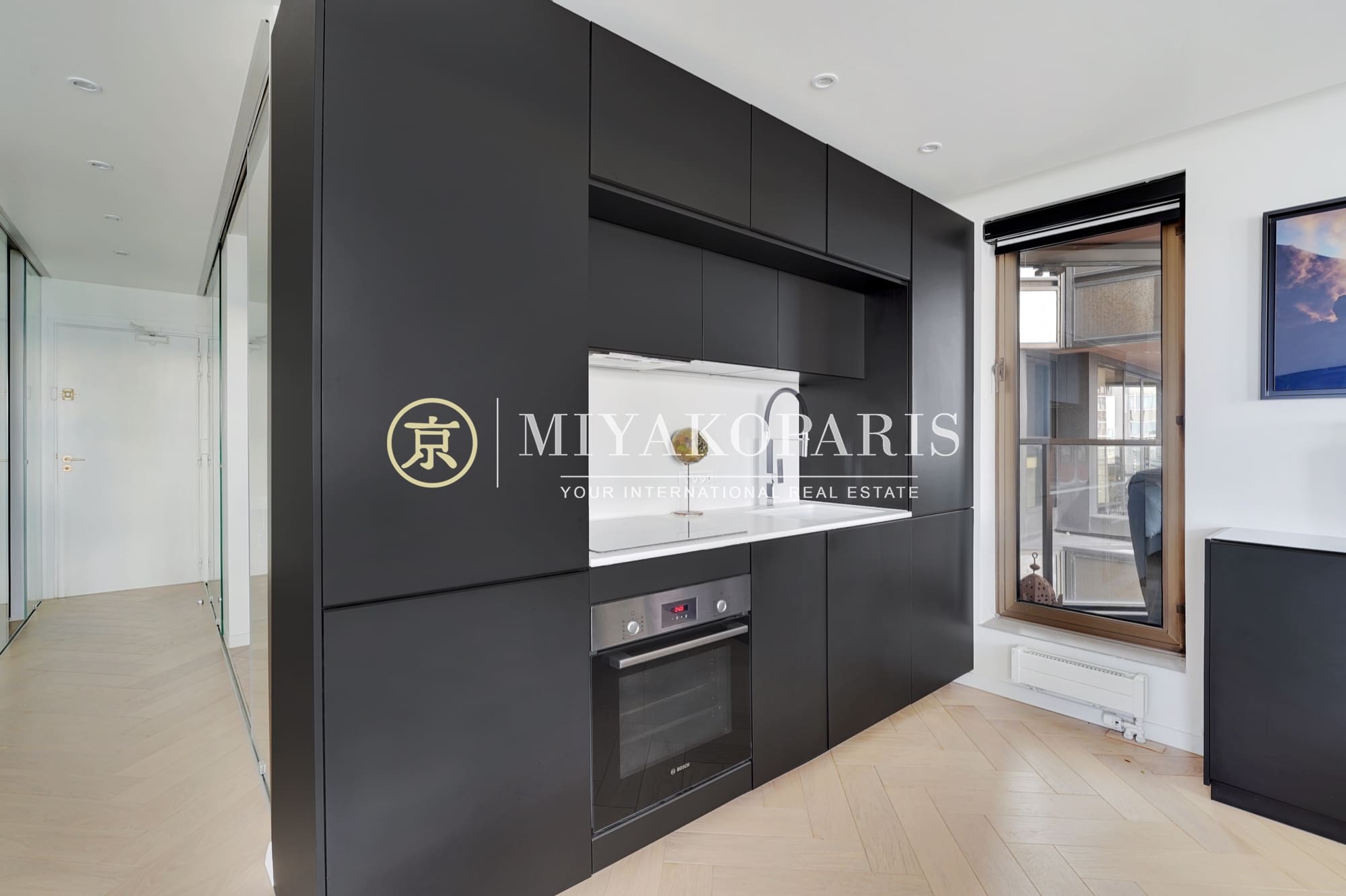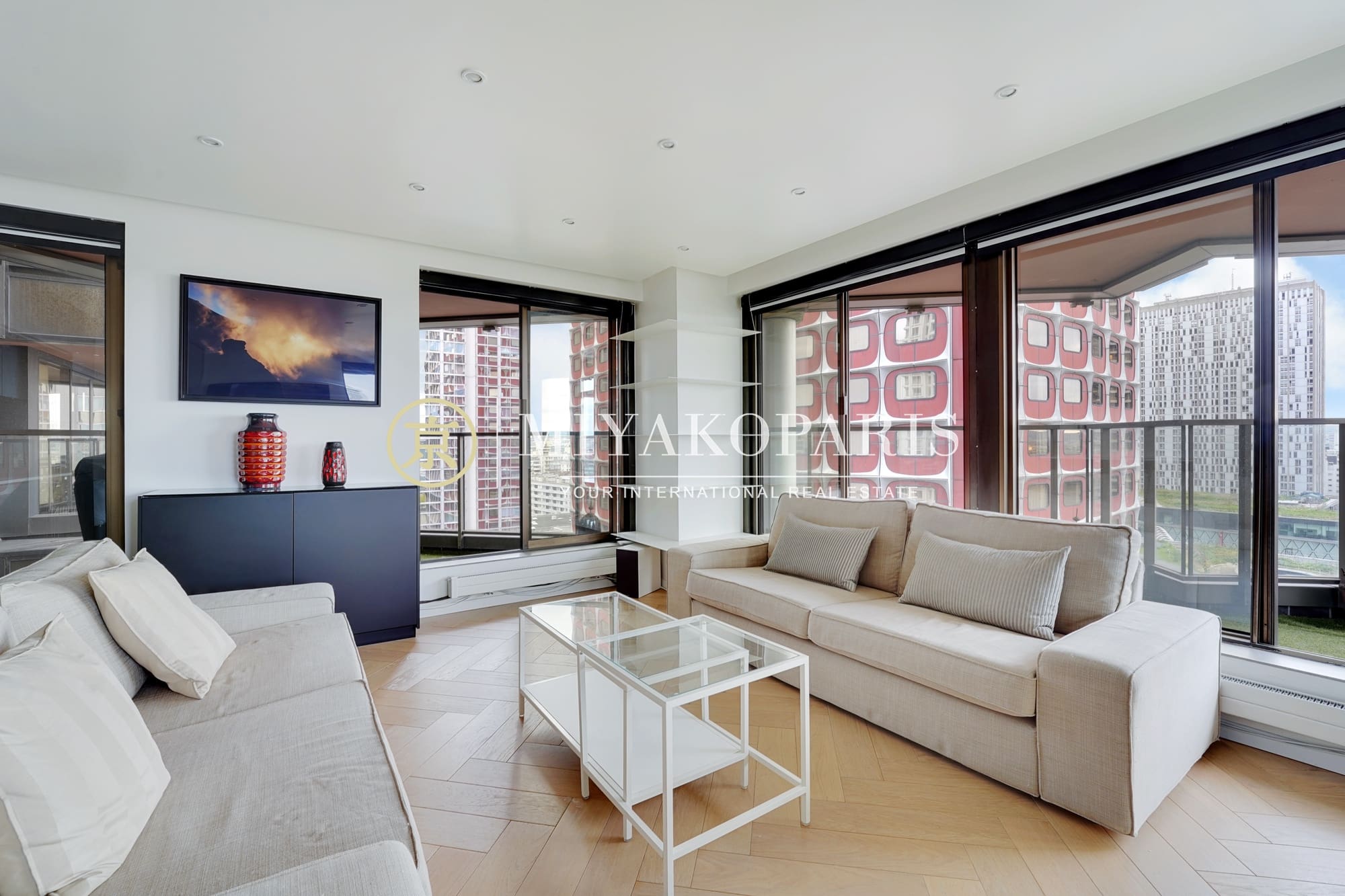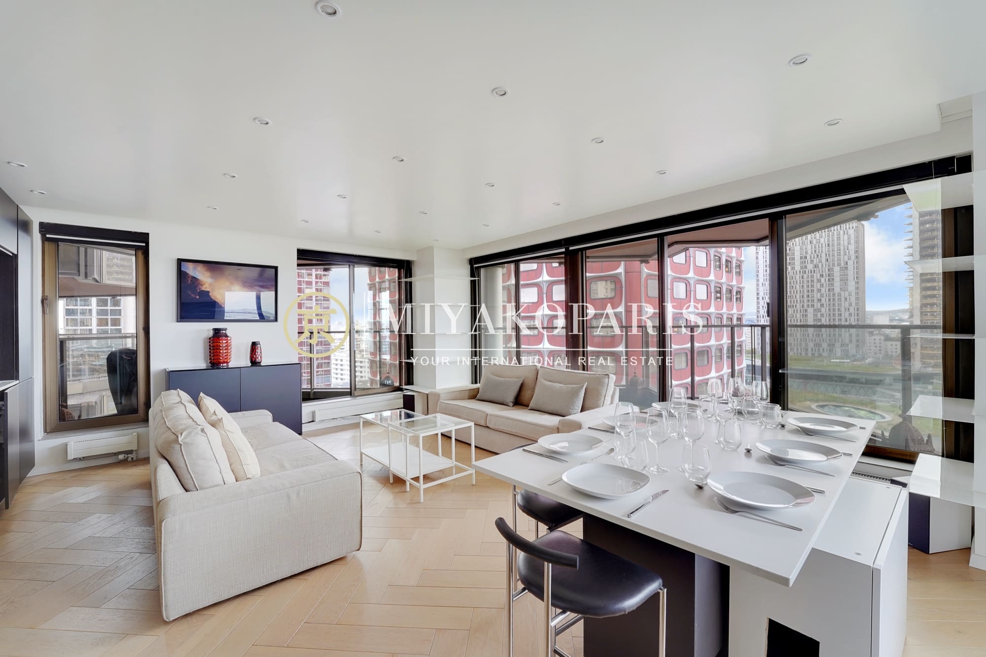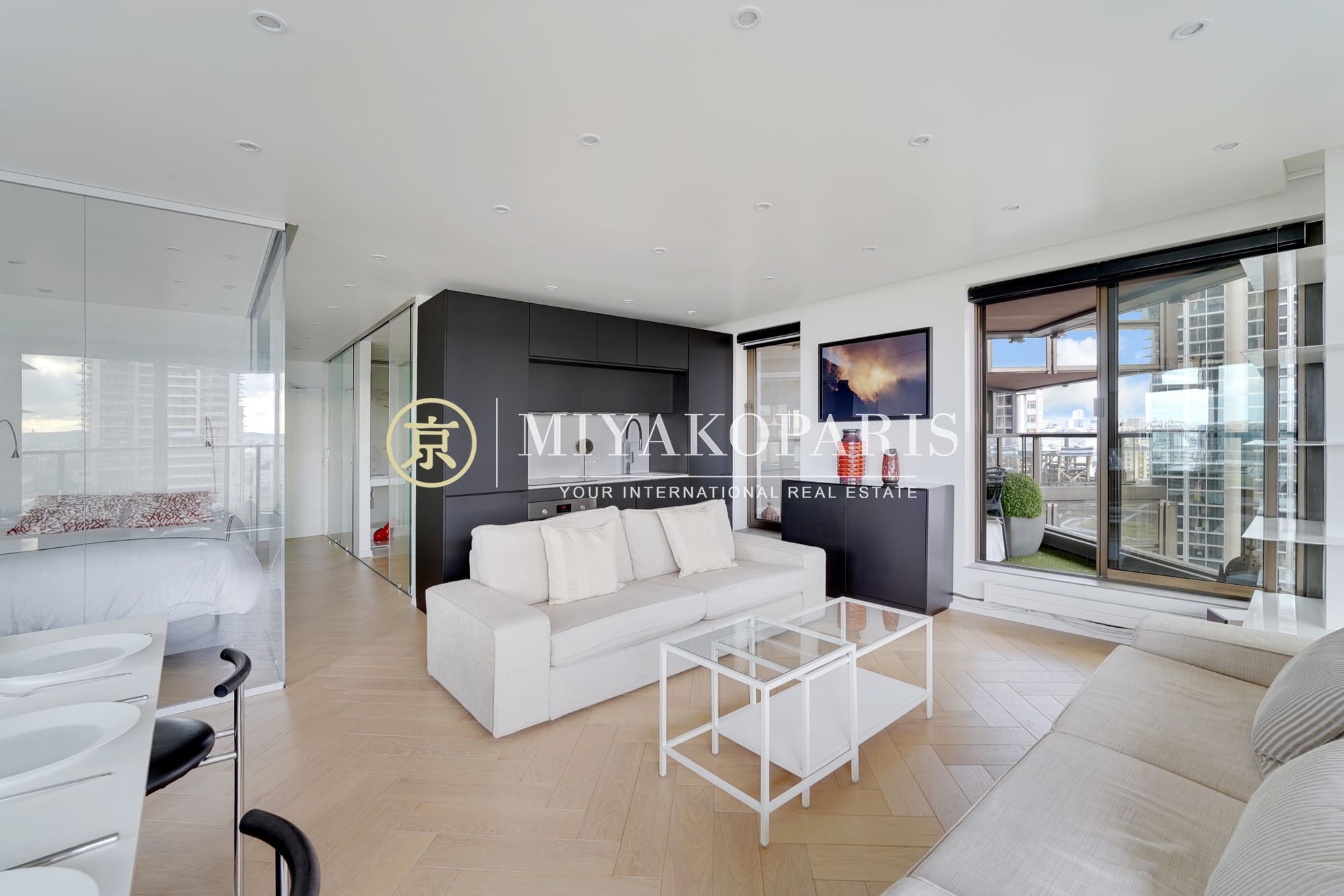 Tour TOTEM – Exclusivité – Paris XVe, Front de Seine – Situé dans la Tour la plus prisée, cet appartement refait entièrement à neuf bénéficiant d’une vue sur la Seine, les toits de Paris, ainsi que la Statue de la Liberté se compose d’une entrée, séjour baigné de lumière naturelle, coin nuit, cuisine US entièrement aménagée et équipée, 1 salle de douche avec douche à l’italienne, WC séparé. 3 balcons de 12m2 au total. Rare. Prestations réalisées avec des matériaux haut-de-gamme.
