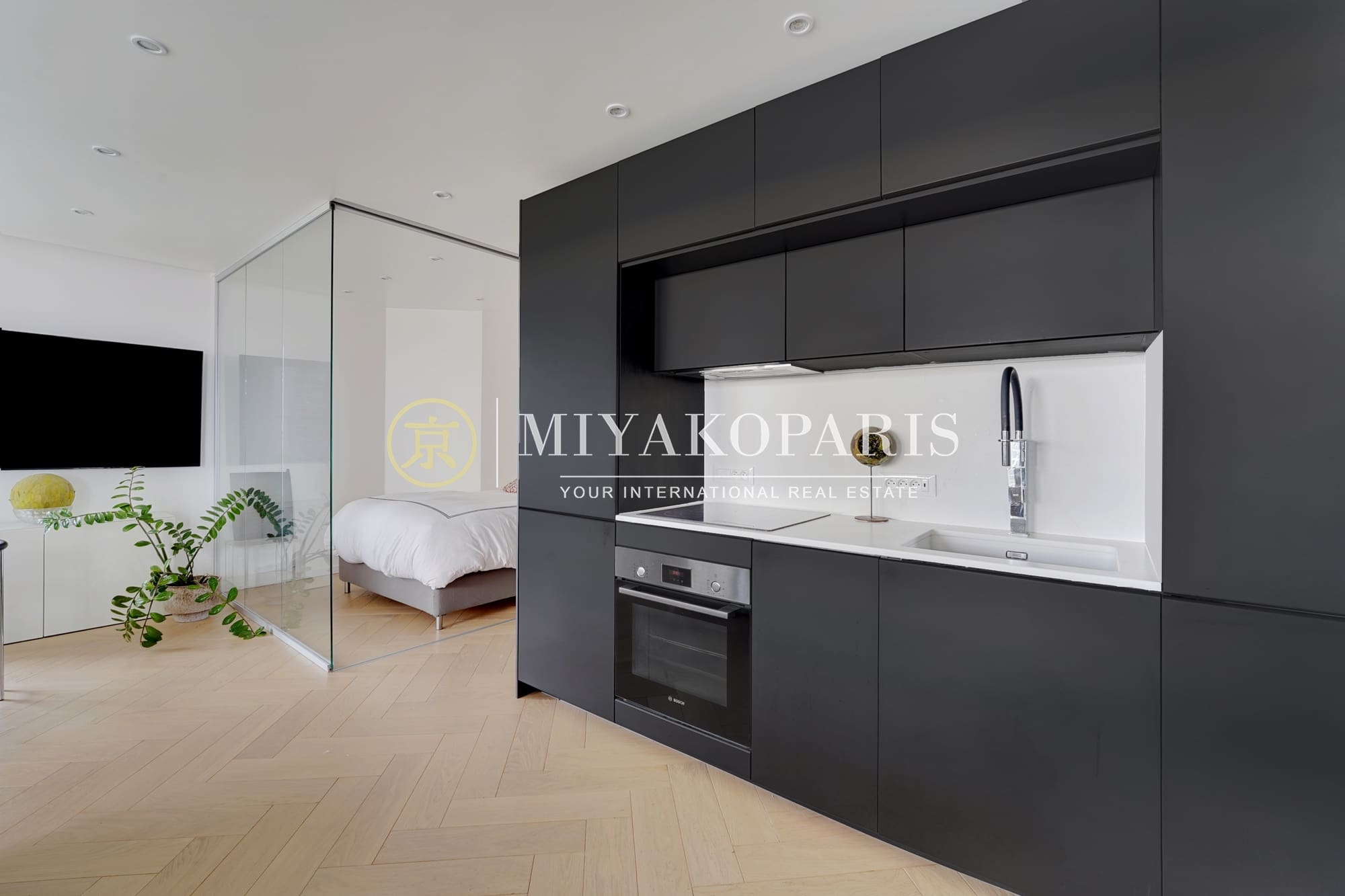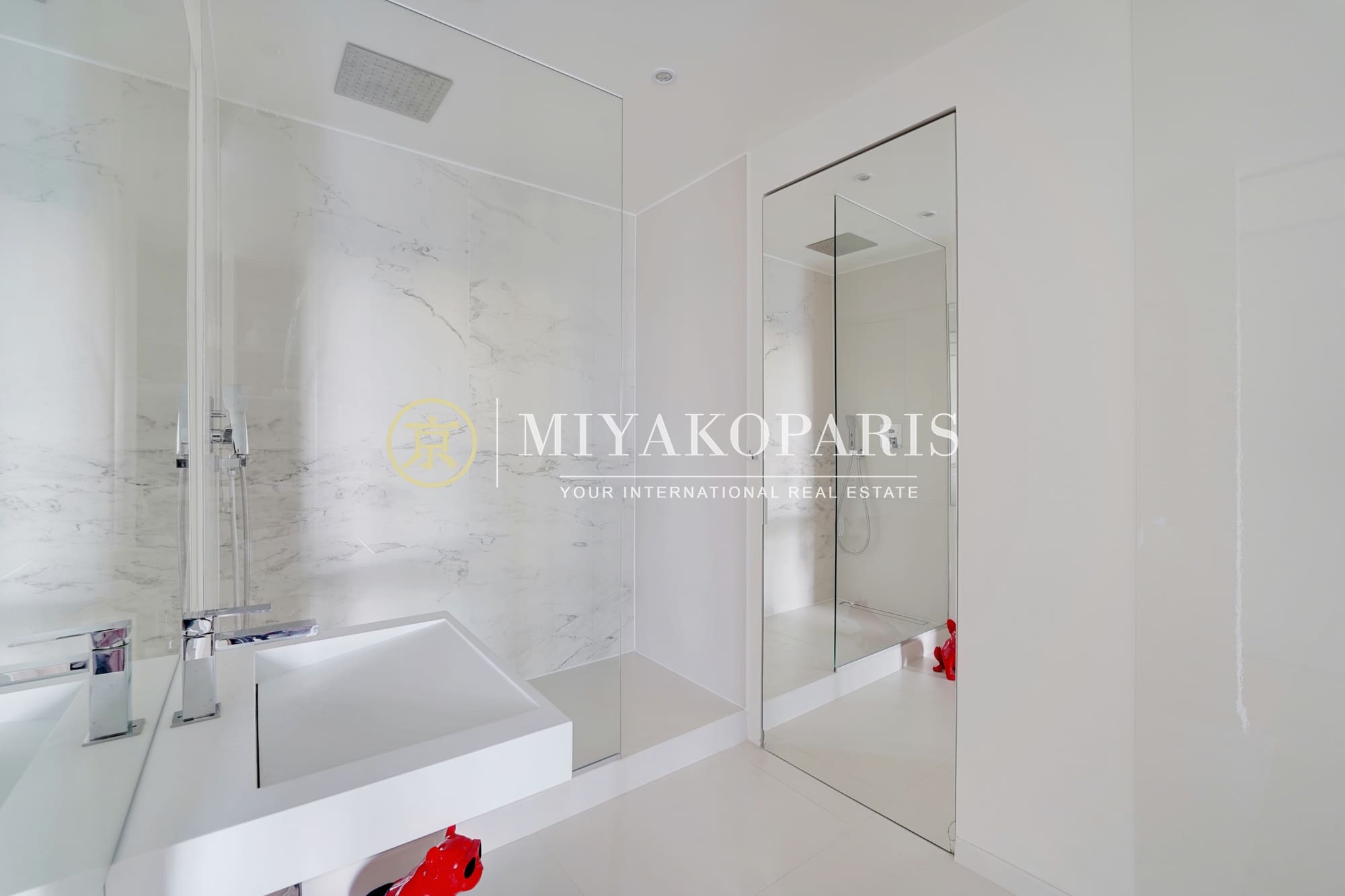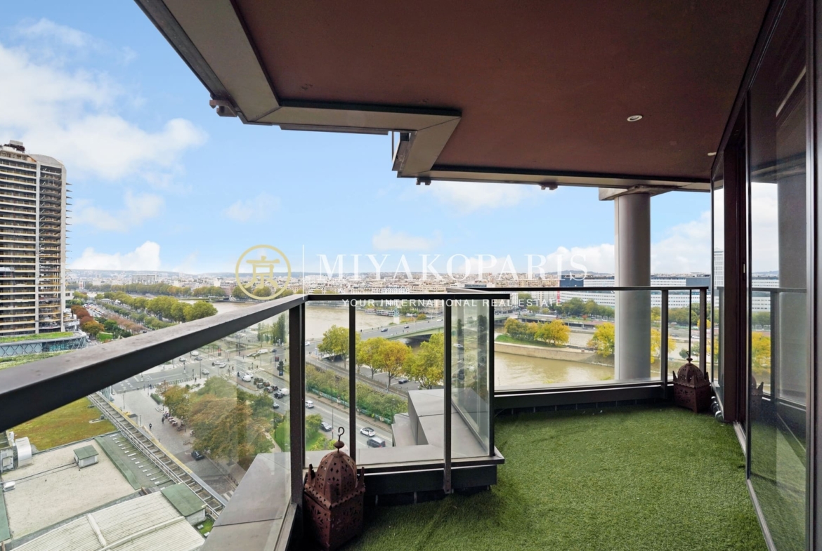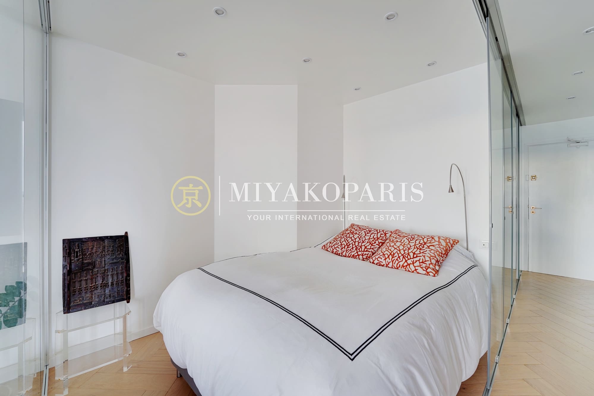 Tour TOTEM – Exclusivité – Paris XVe, Front de Seine – Situé dans la Tour la plus prisée, cet appartement refait entièrement à neuf bénéficiant d’une vue sur la Seine, les toits de Paris, ainsi que la Statue de la Liberté se compose d’une entrée, séjour baigné de lumière naturelle, coin nuit, cuisine US entièrement aménagée et équipée, 1 salle de douche avec douche à l’italienne, WC séparé. 3 balcons de 12m2 au total. Rare. Prestations réalisées avec des matériaux haut-de-gamme.