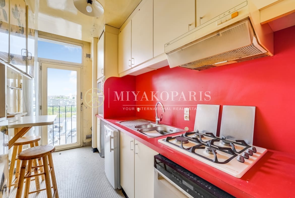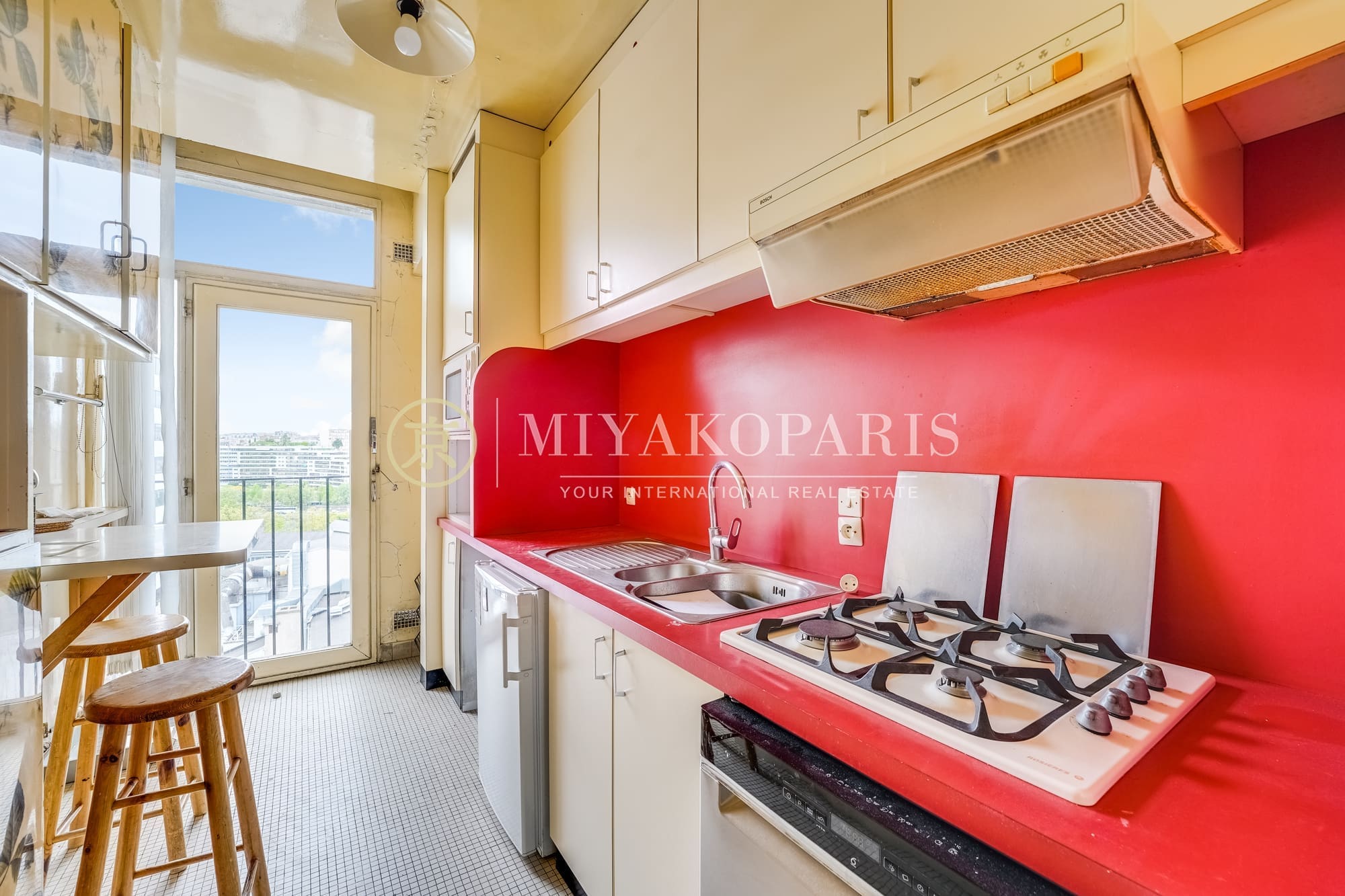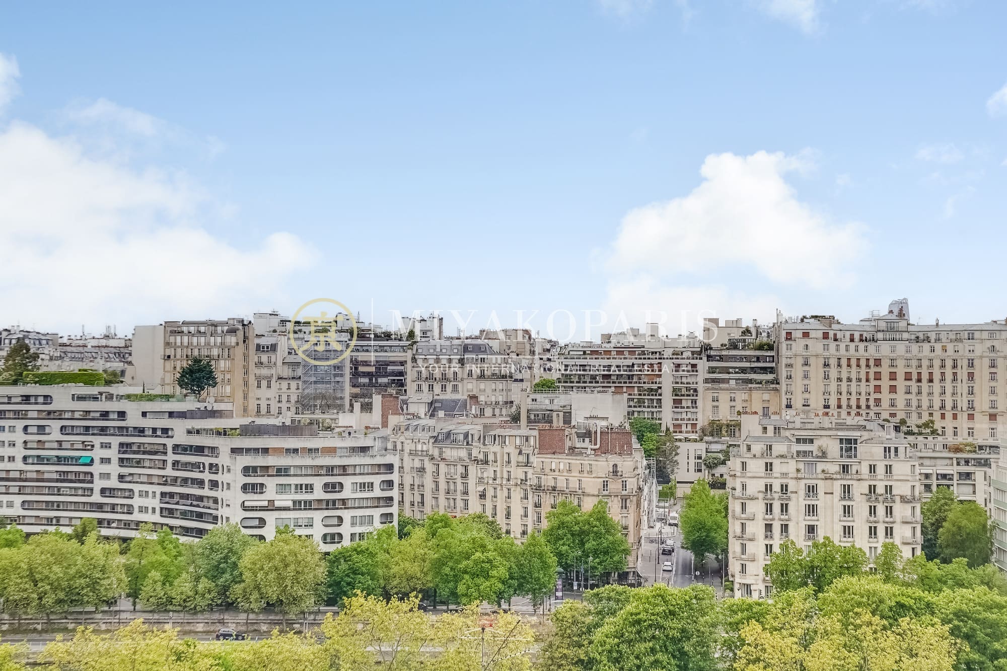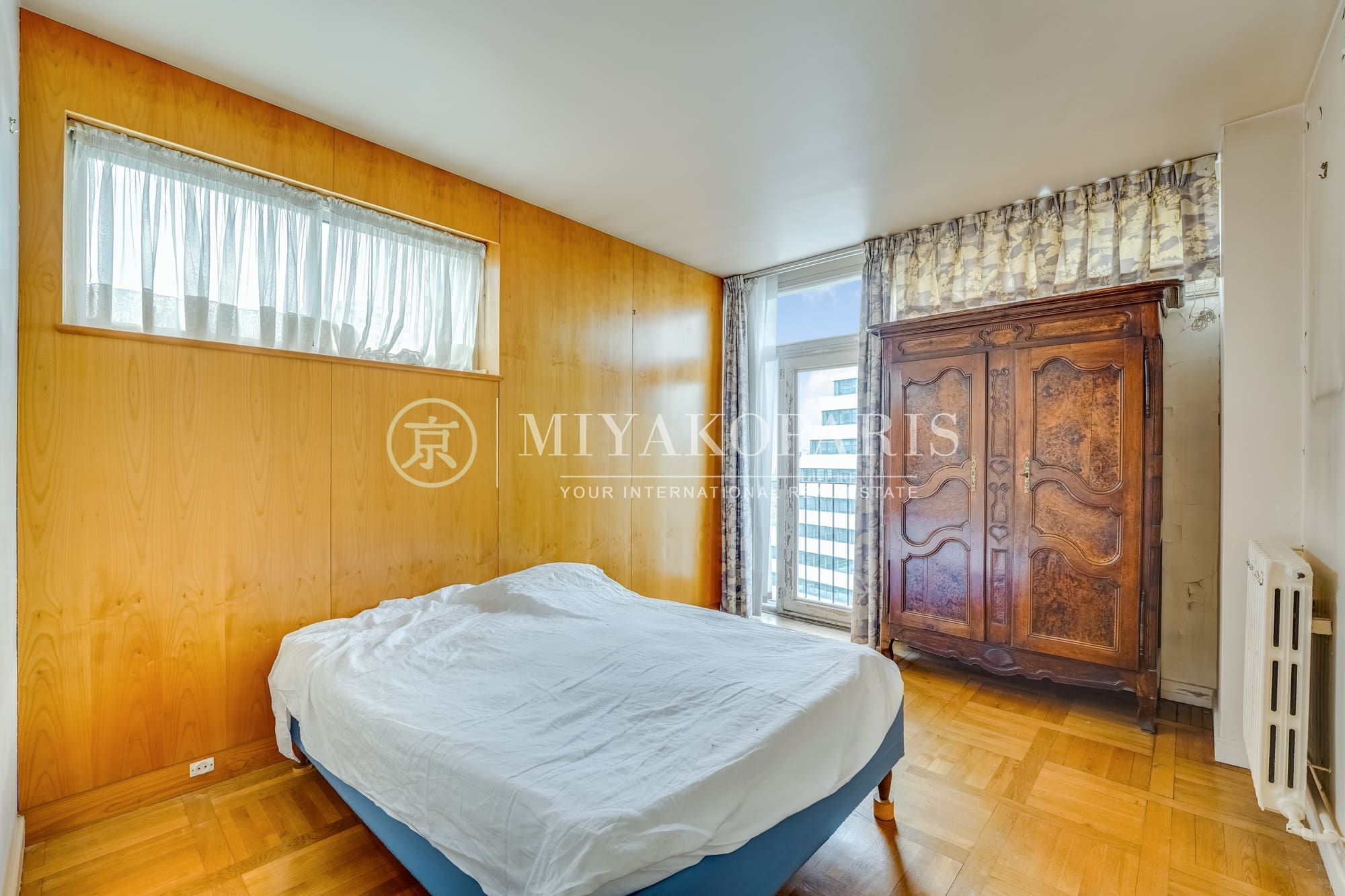 À proximité de la Tour Eiffel et du quartier de Beaugrenelle, au sein d’une copropriété sécurisée de bon standing avec gardien (interphone et vigik), en étage élevé avec ascenseur.