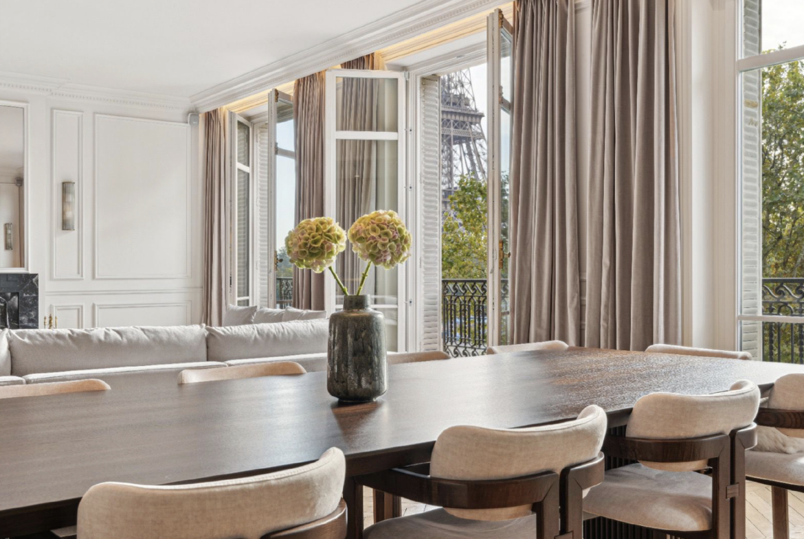 Au 3ᵉ étage d’un élégant immeuble en pierre de taille avec ascenseur, ce superbe appartement de réception de 244,02 m² Loi Carrez offre des panoramas uniques sur la Tour Eiffel et la Seine. Il a été entièrement rénové avec des matériaux haut de gamme, alliant élégance et modernité.