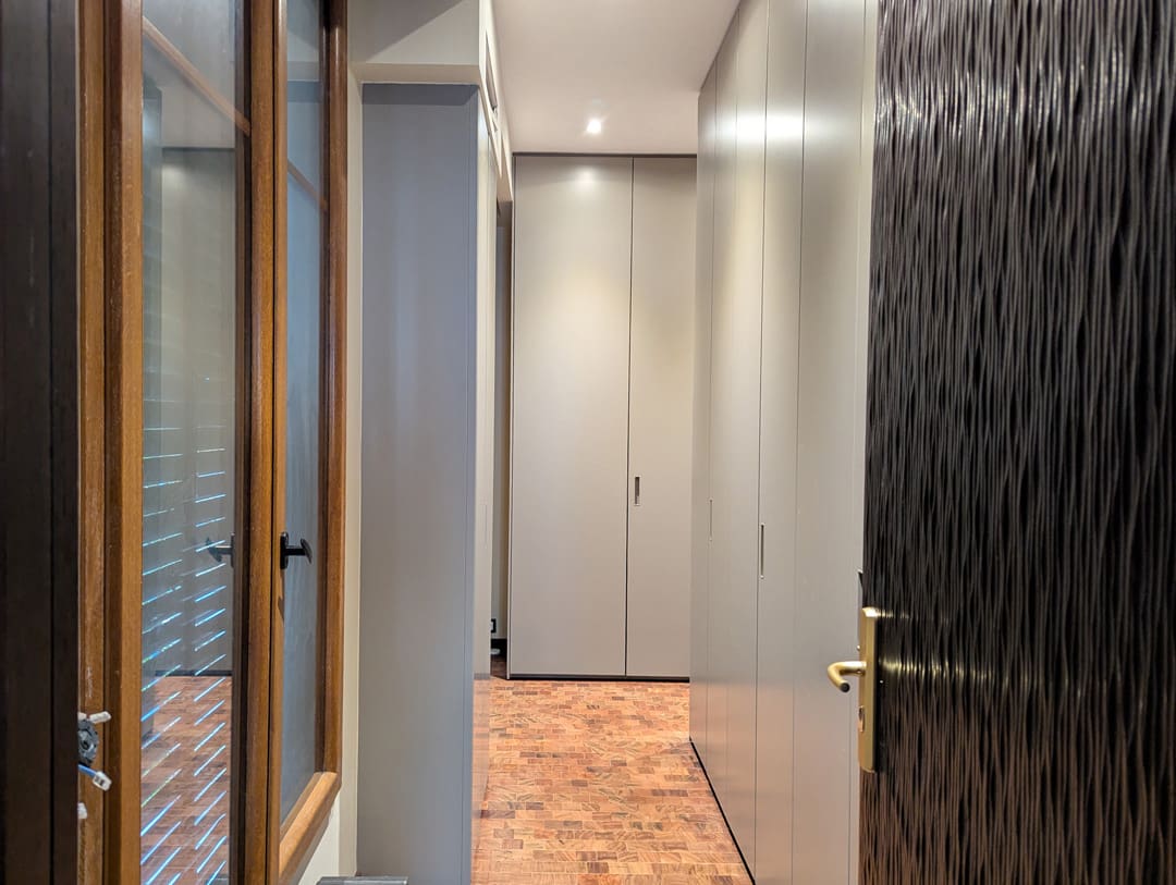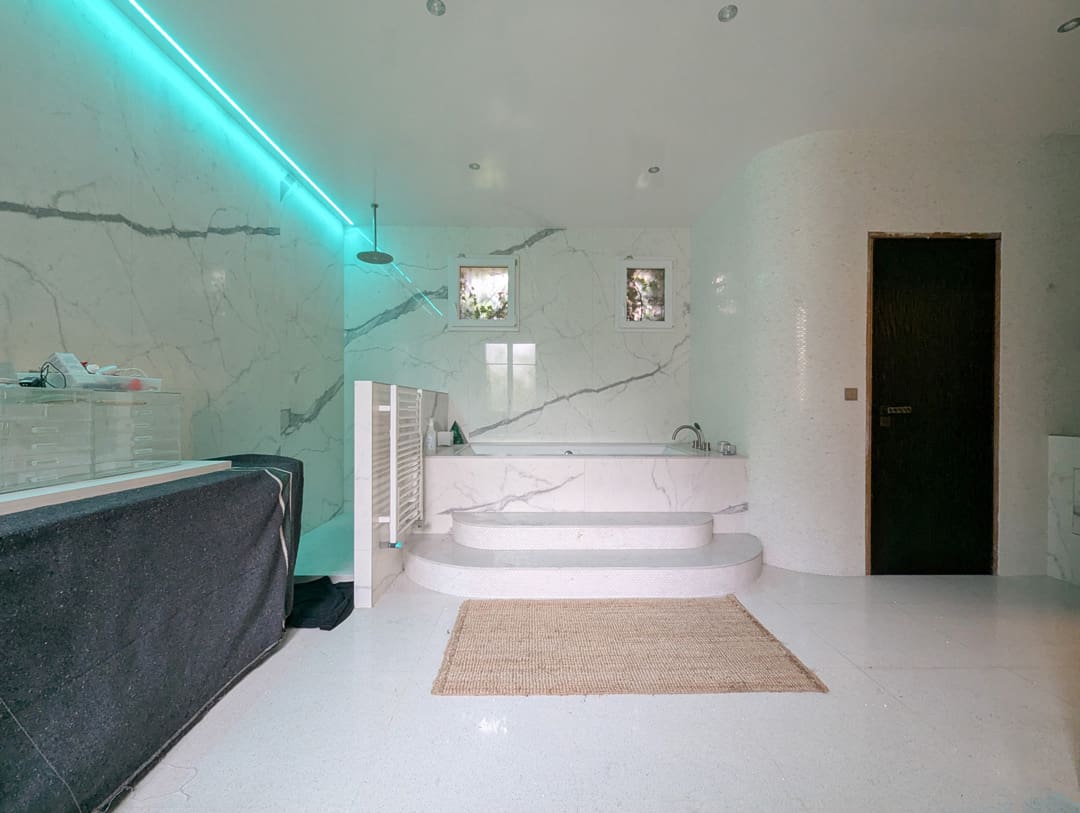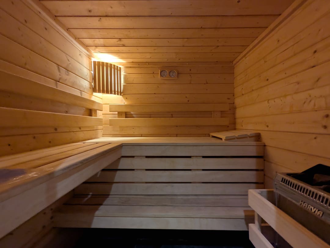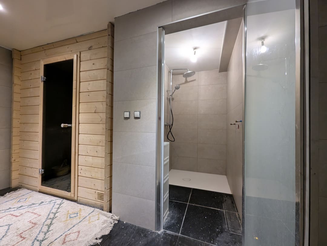 Sous-sol – Une entrée discrète mène à une chambre chaleureuse. Une salle de sport à finaliser, complétée par un sauna, une douche et des WC séparés, offre un espace bien-être complet.